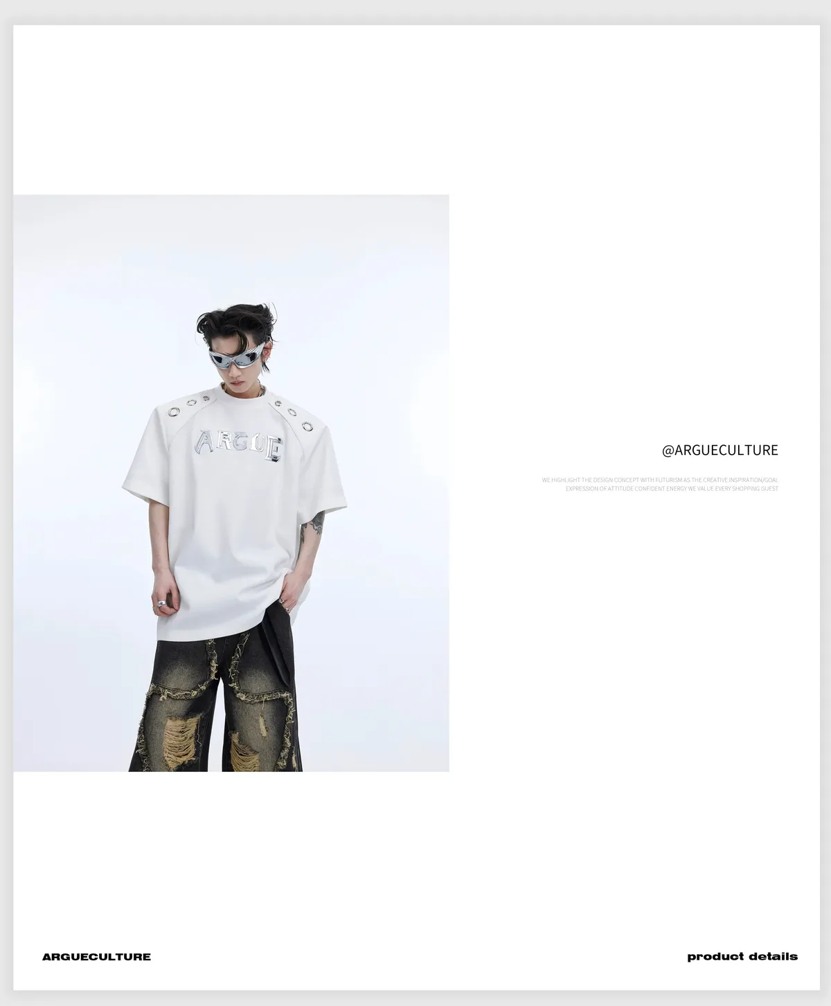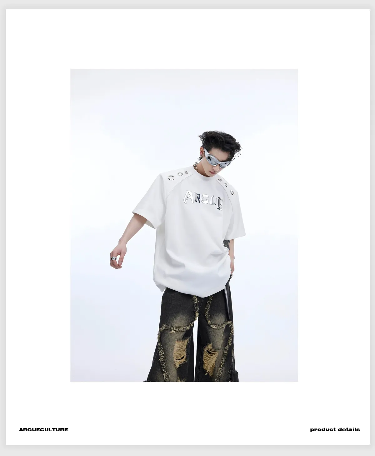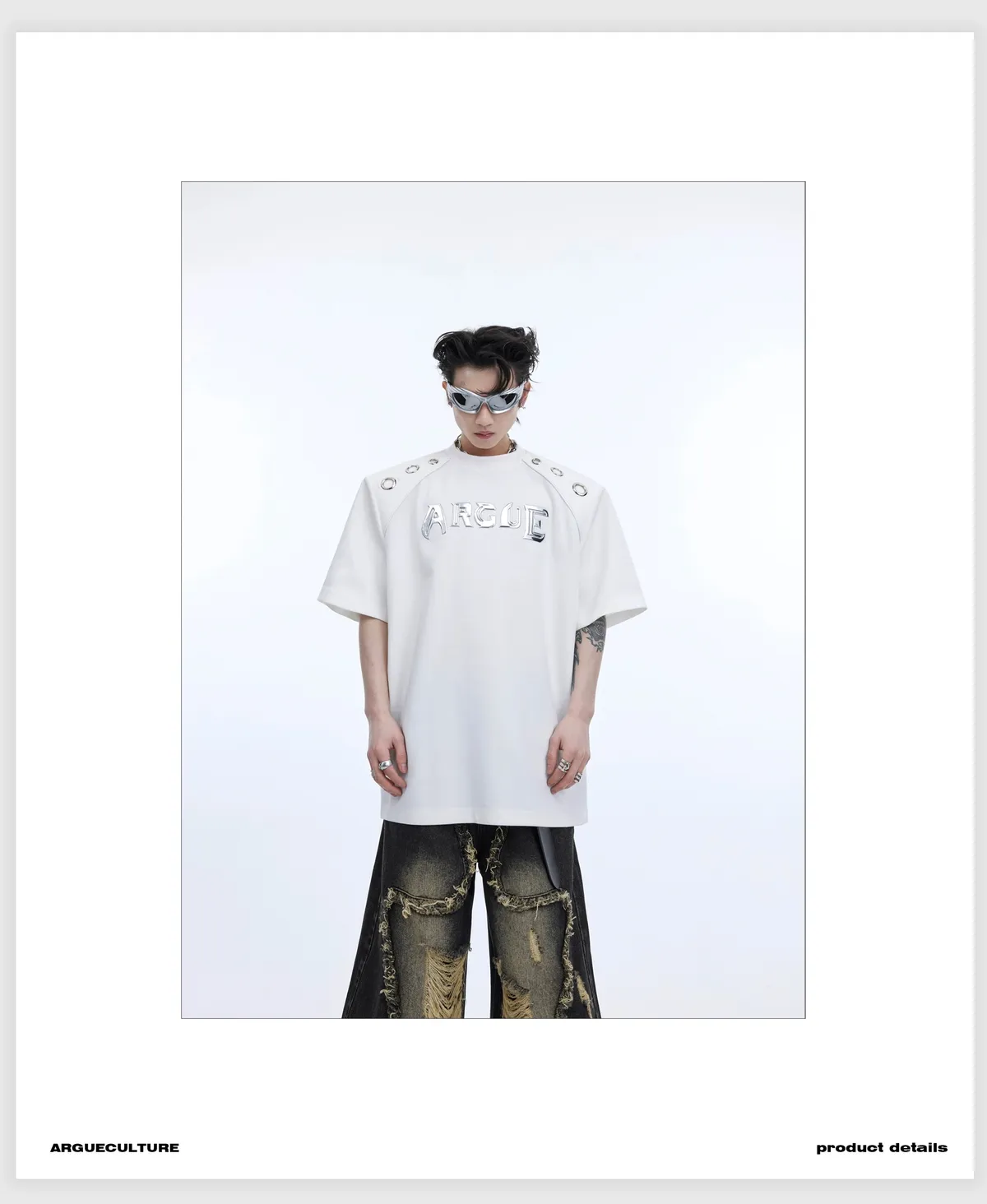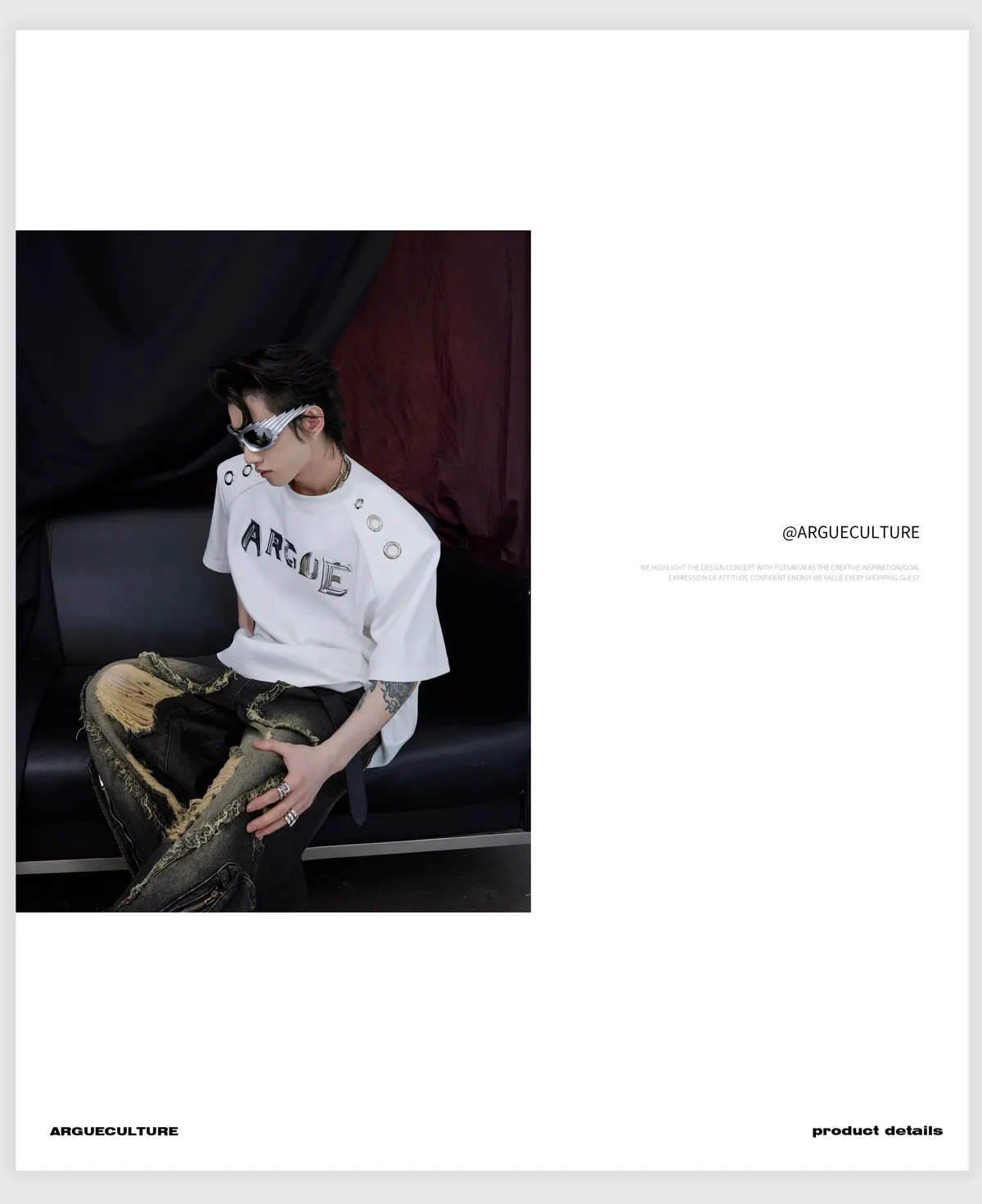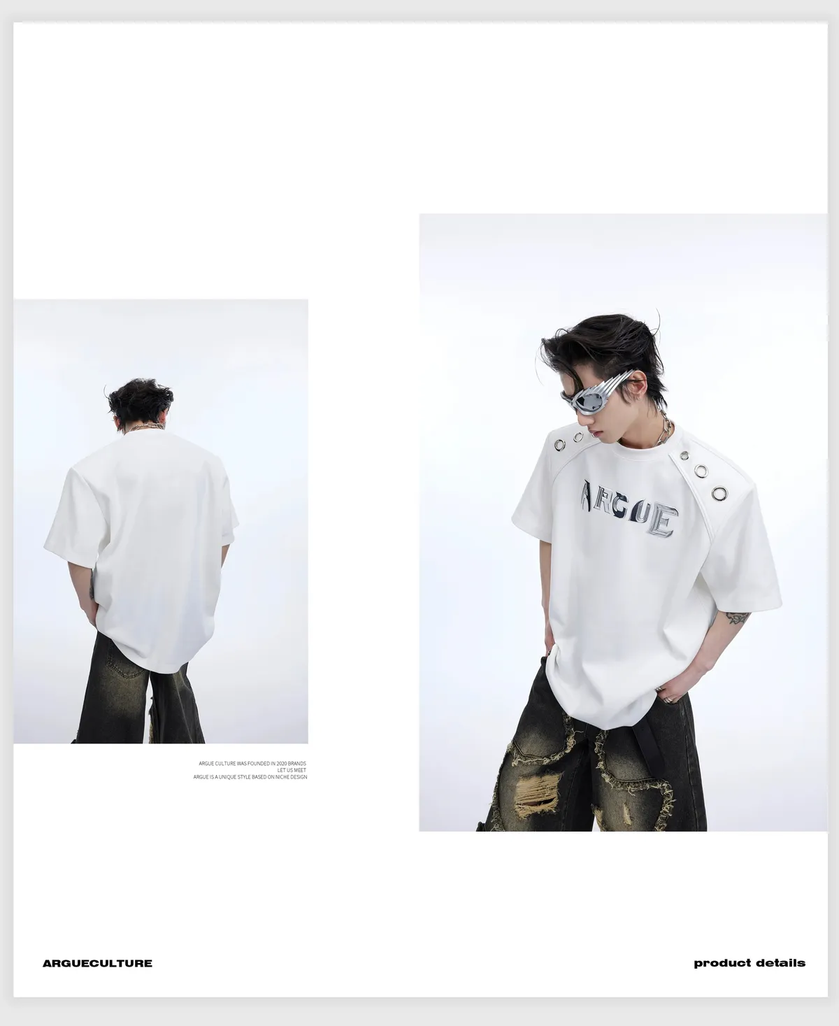 金屬環 裁片 可拆墊肩 LOGO TEE 短袖(黑/白)