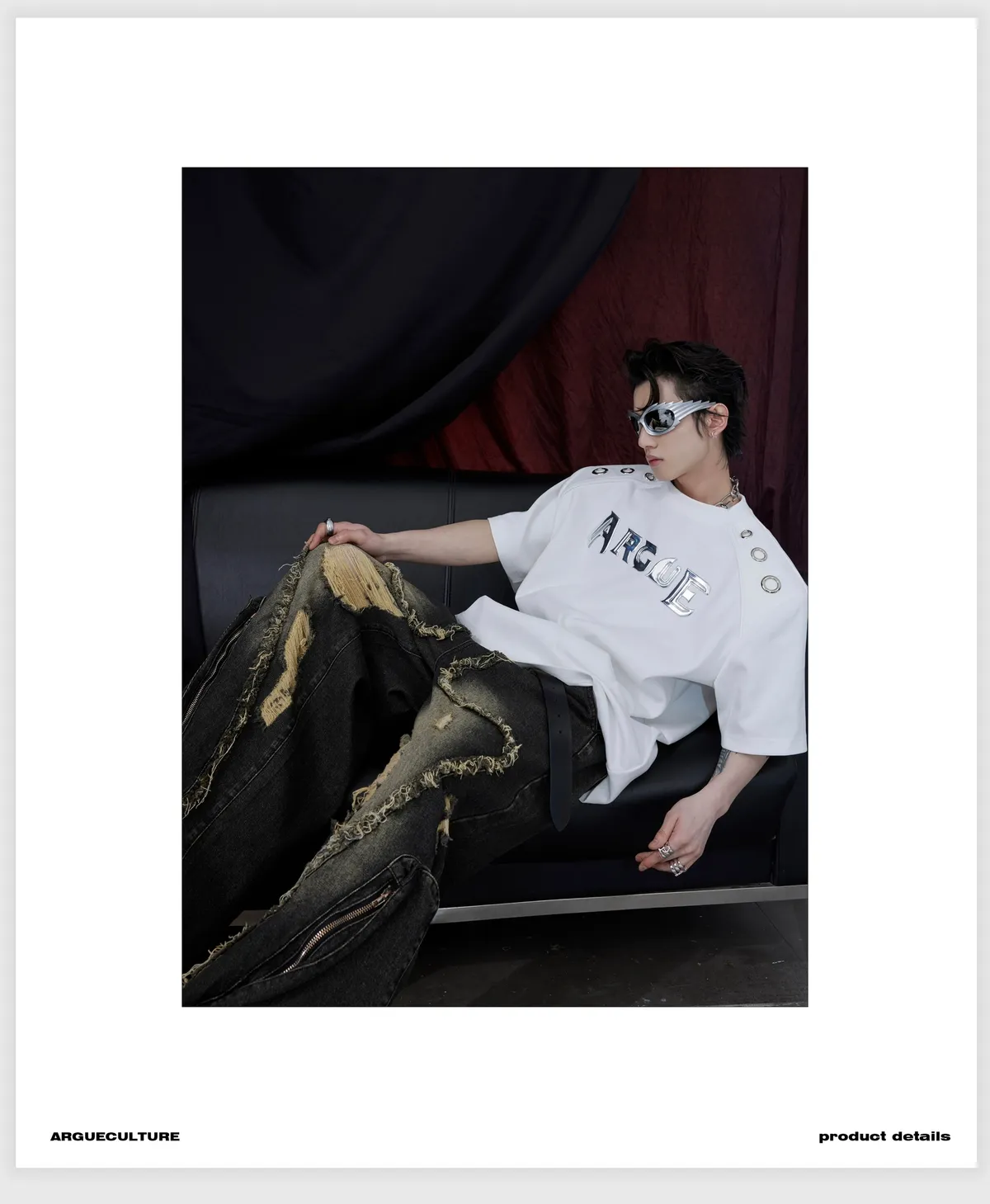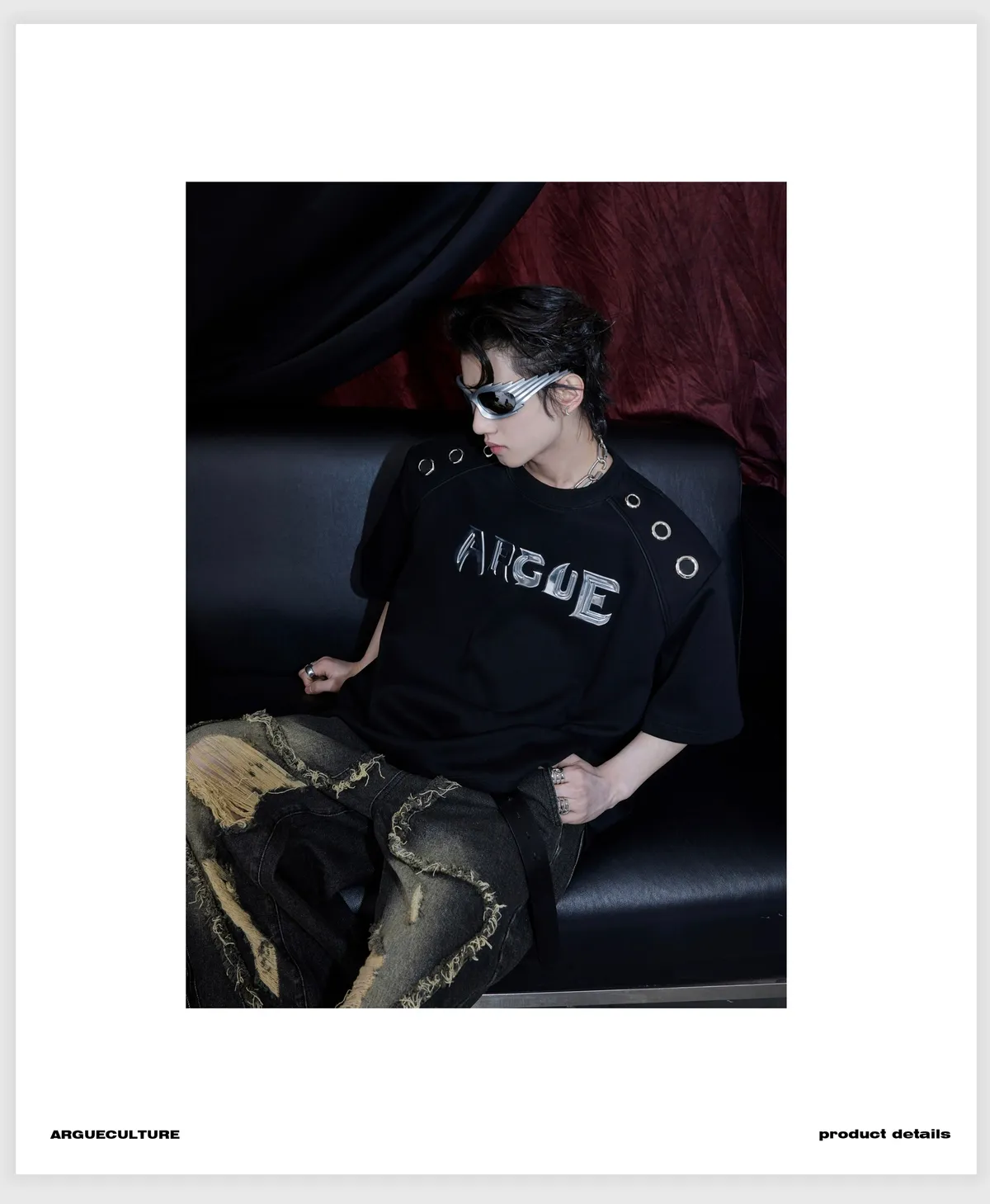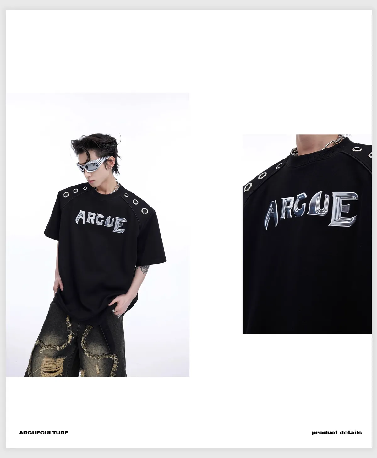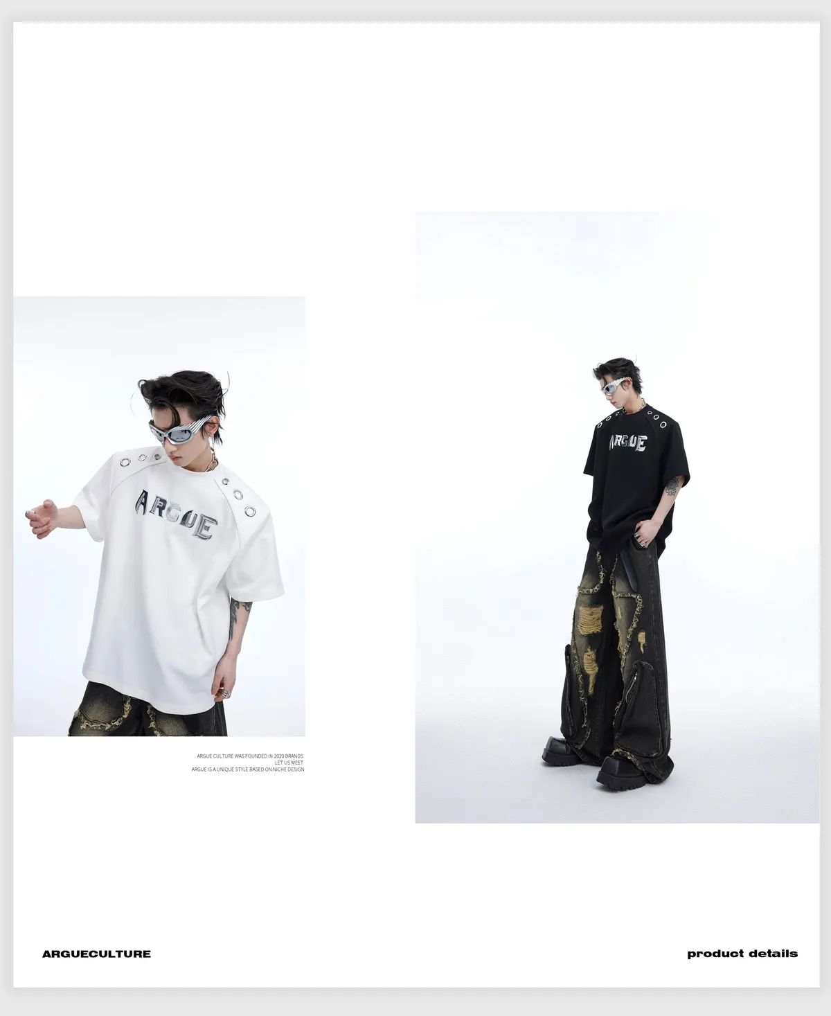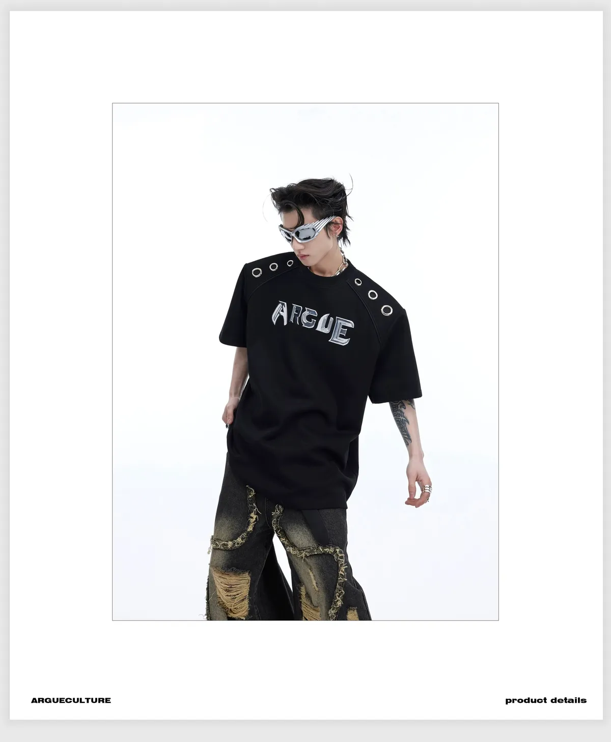 金屬環 裁片 可拆墊肩 LOGO TEE 短袖(黑/白)