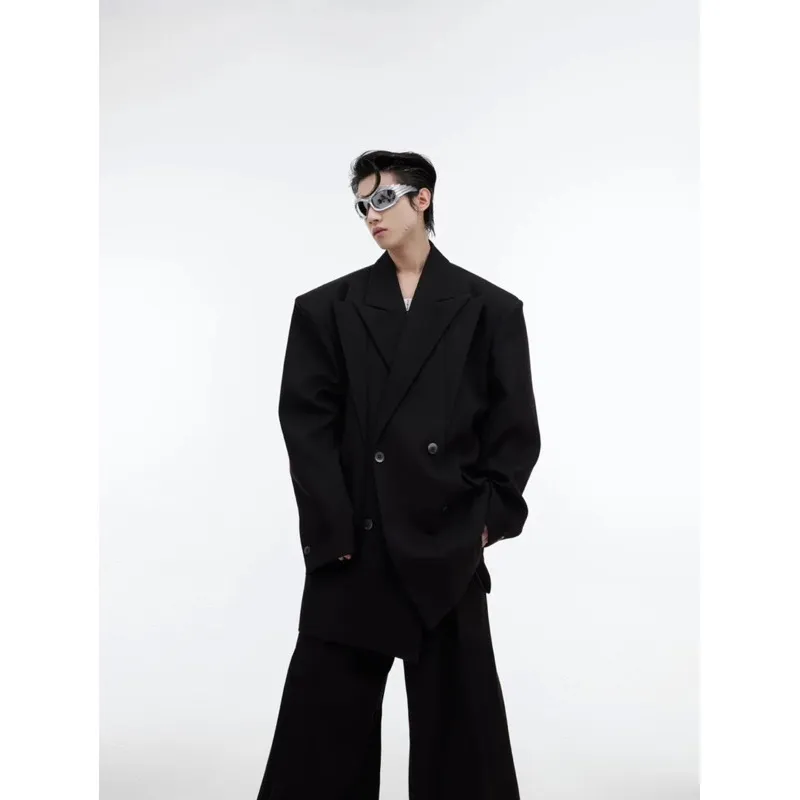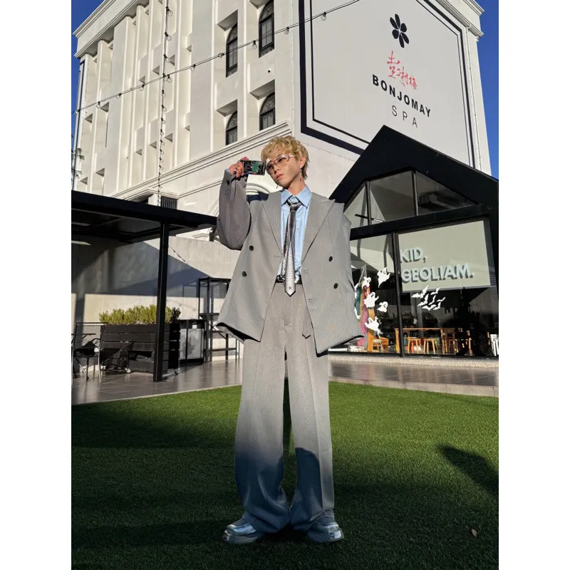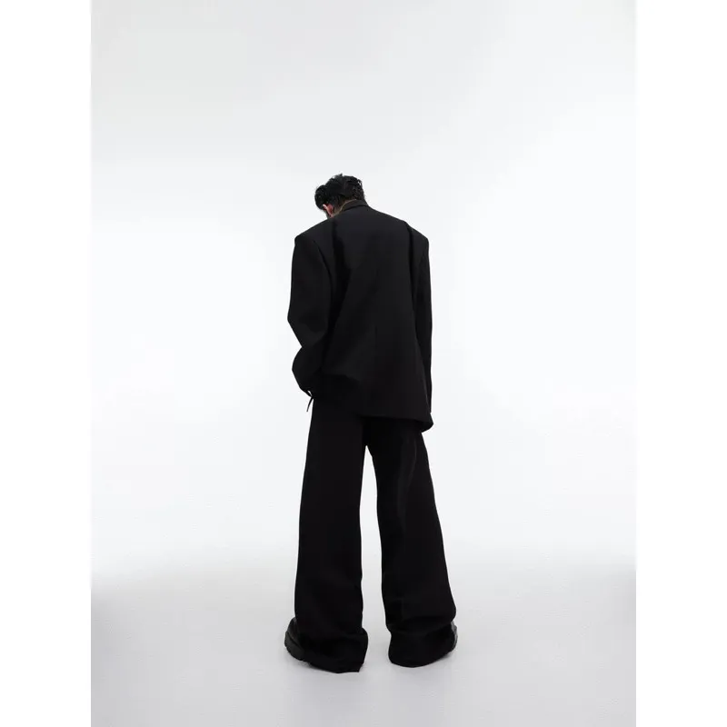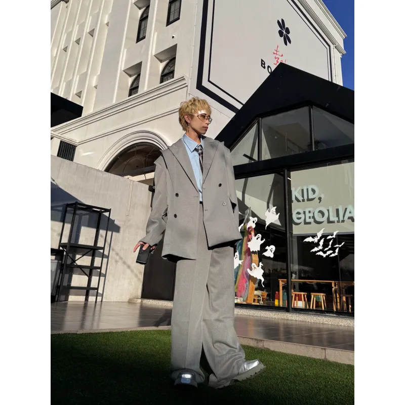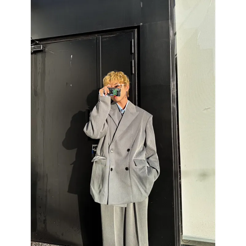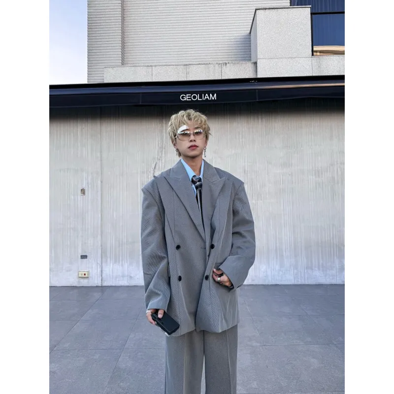 [LAX STUDIO]解構 雙層領 斜紋 西裝外套 廓形 西裝褲 套裝(黑/灰)