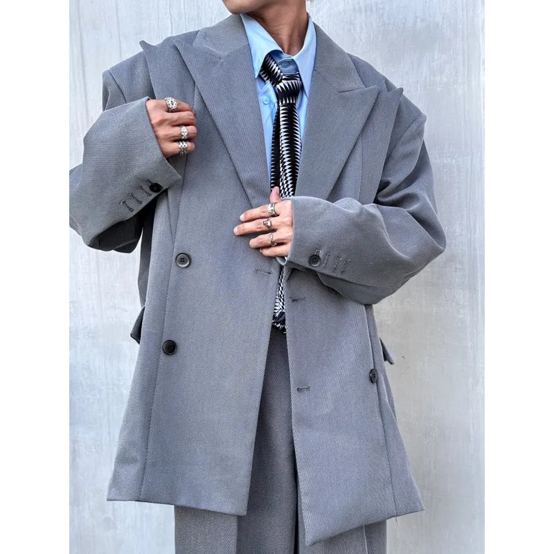 AC 解構 雙層領 斜紋 西裝外套 廓形 西裝褲 套裝(黑/灰)