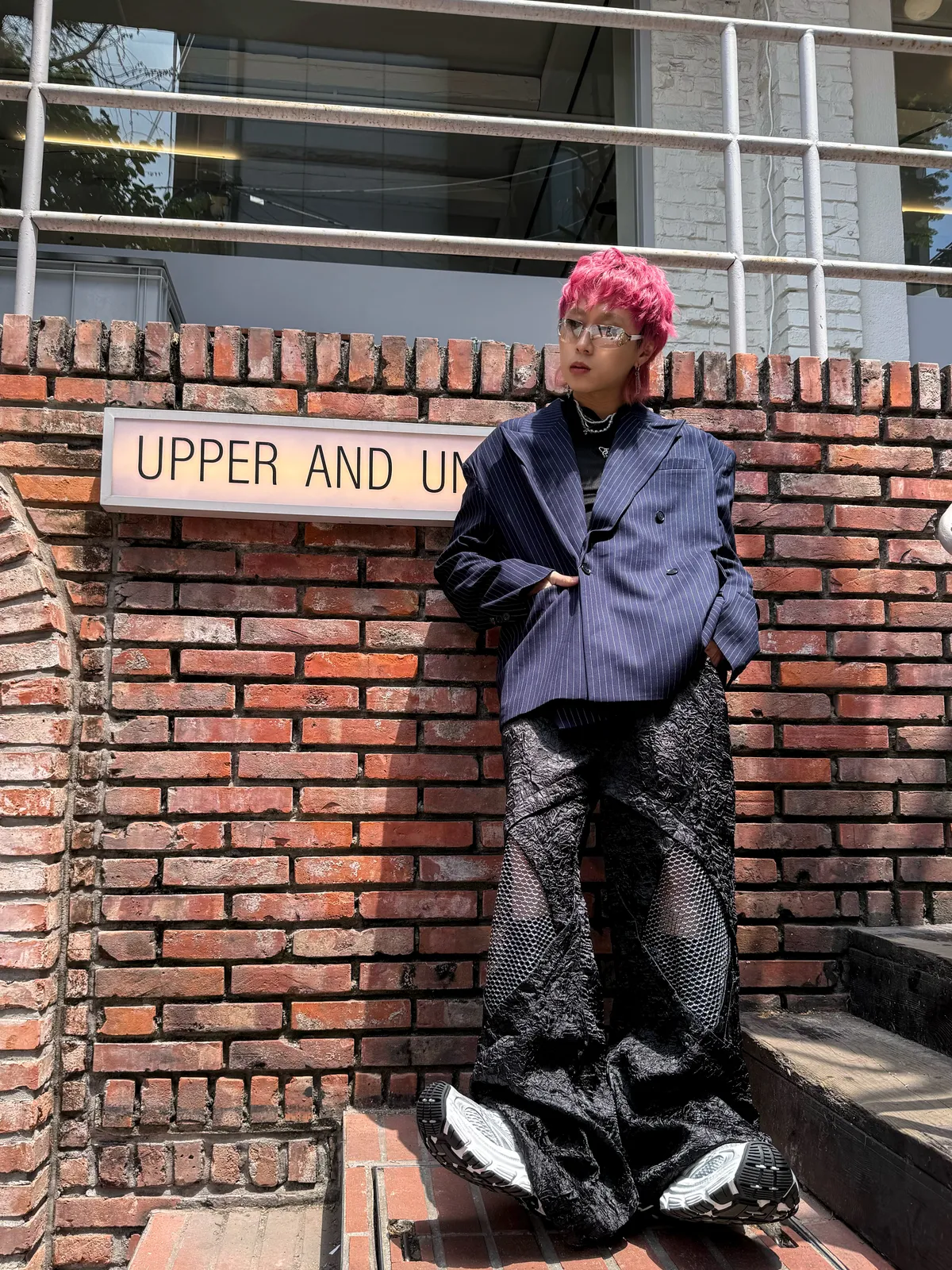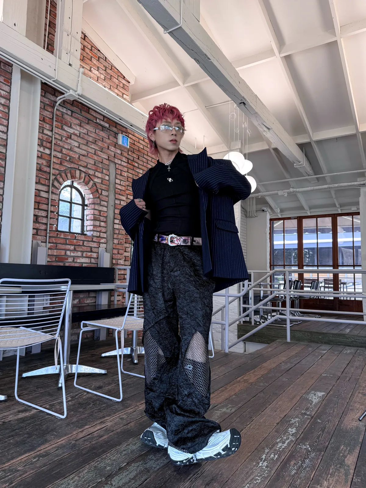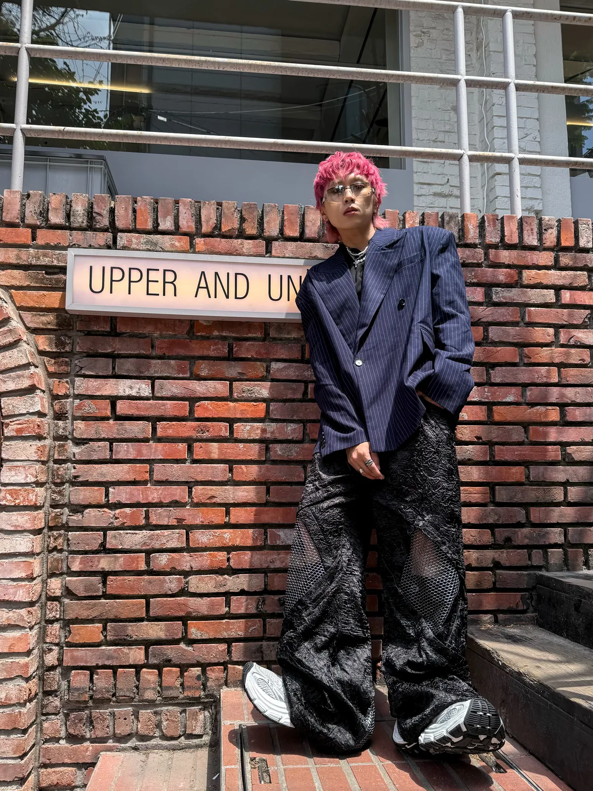 異材質 皺摺浮雕 鏤空 網紋 長褲