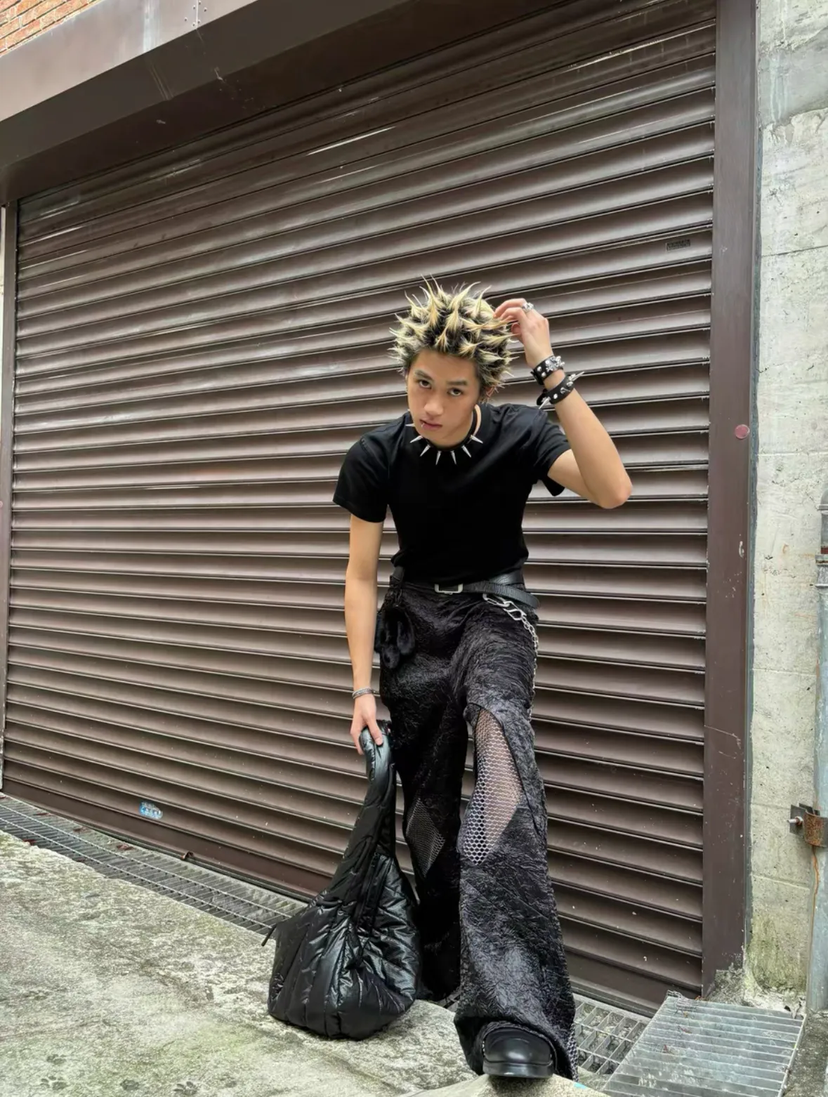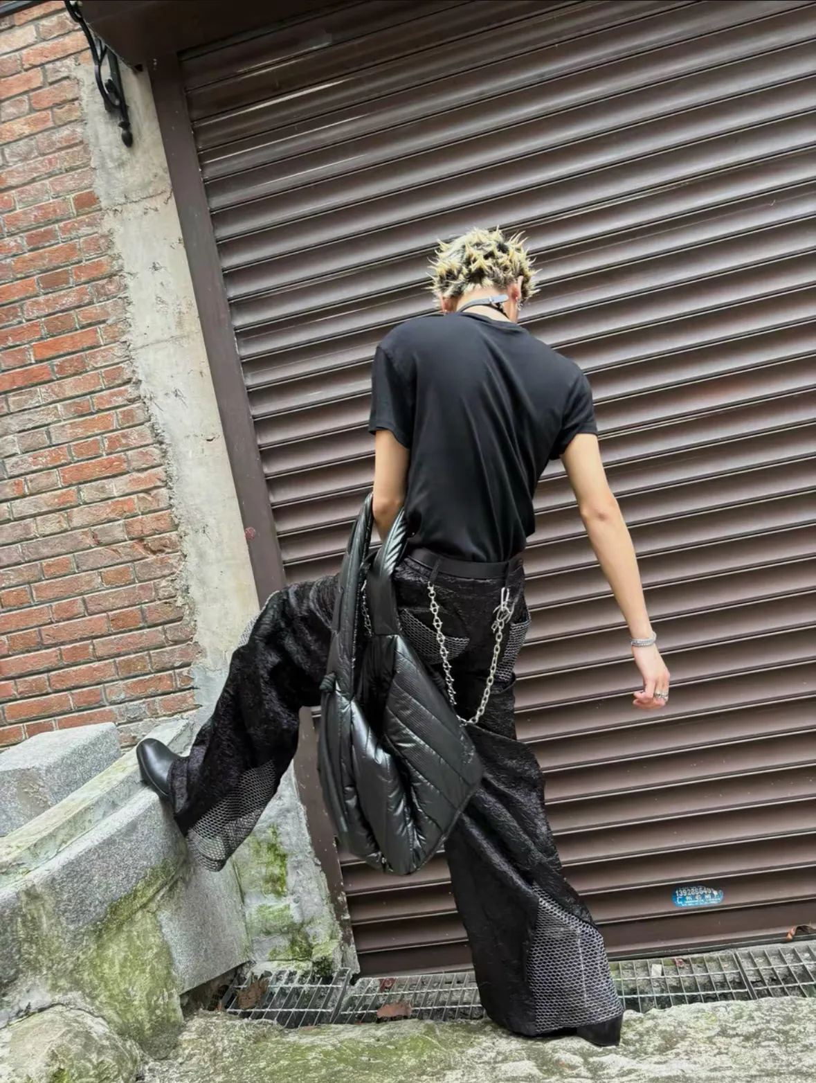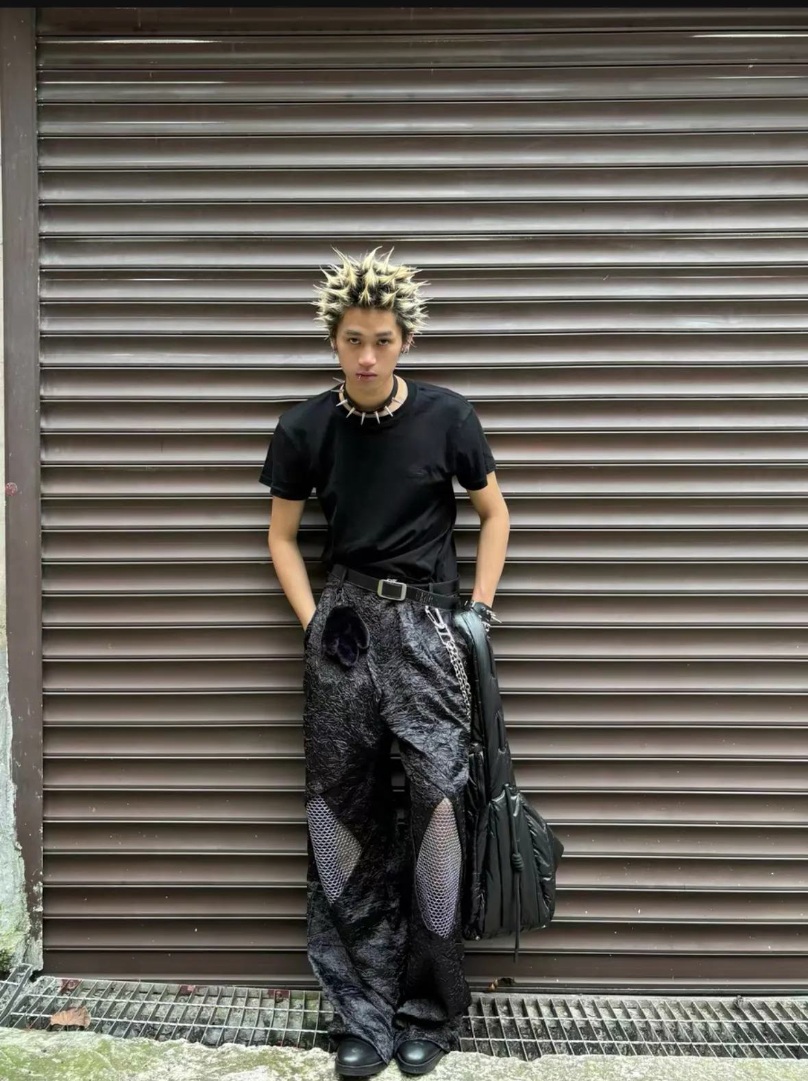 異材質 皺摺浮雕 鏤空 網紋 長褲