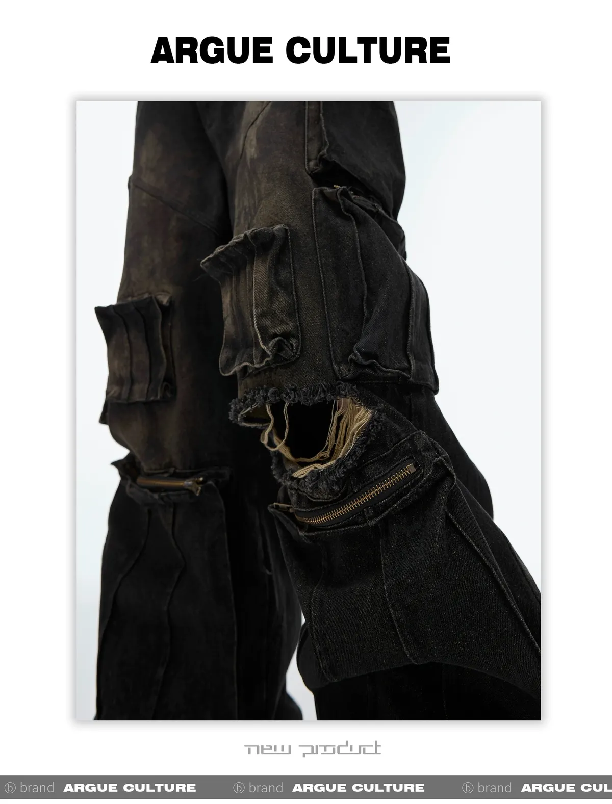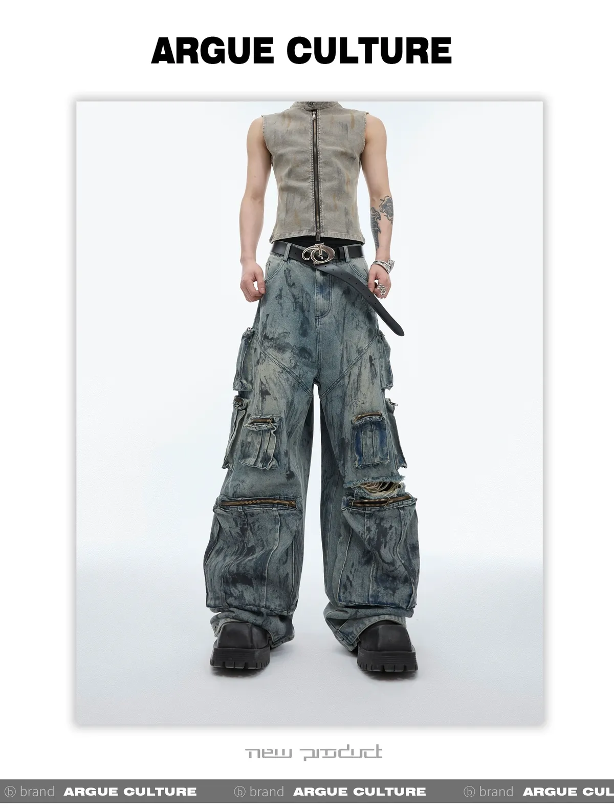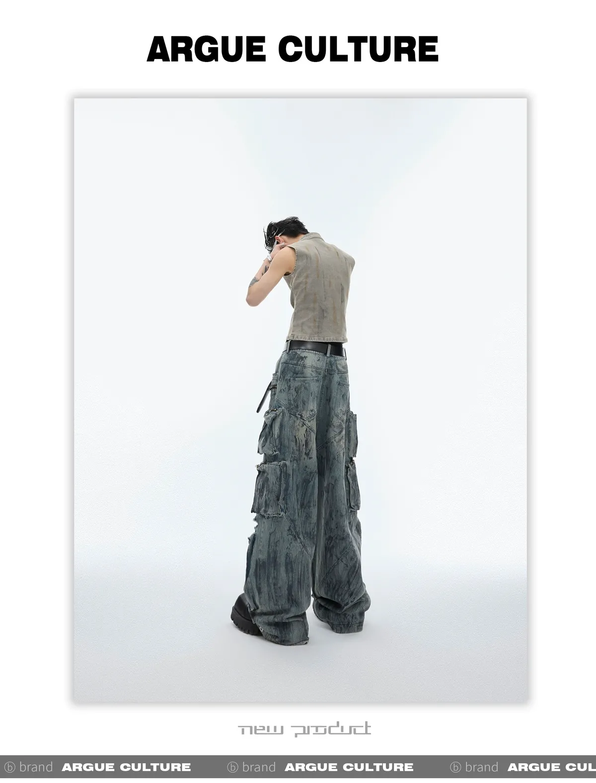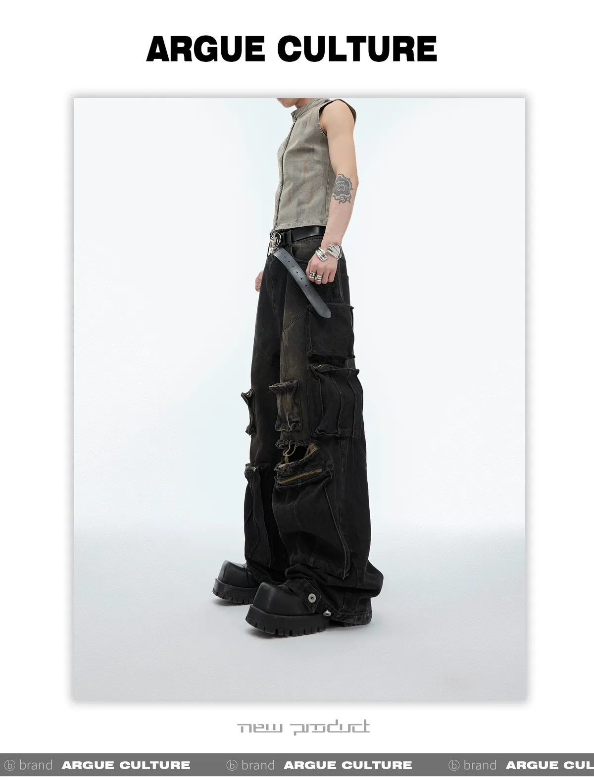 破壞矛盾 做舊 多口袋 手繪 牛仔褲 砲彈褲 長褲(藍/黑)