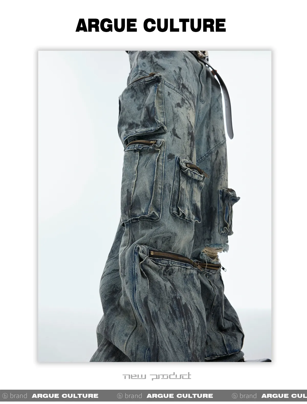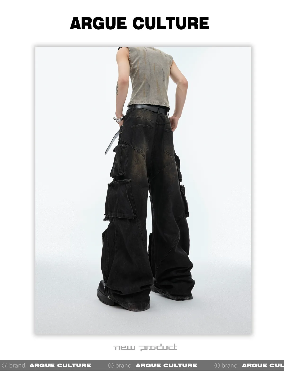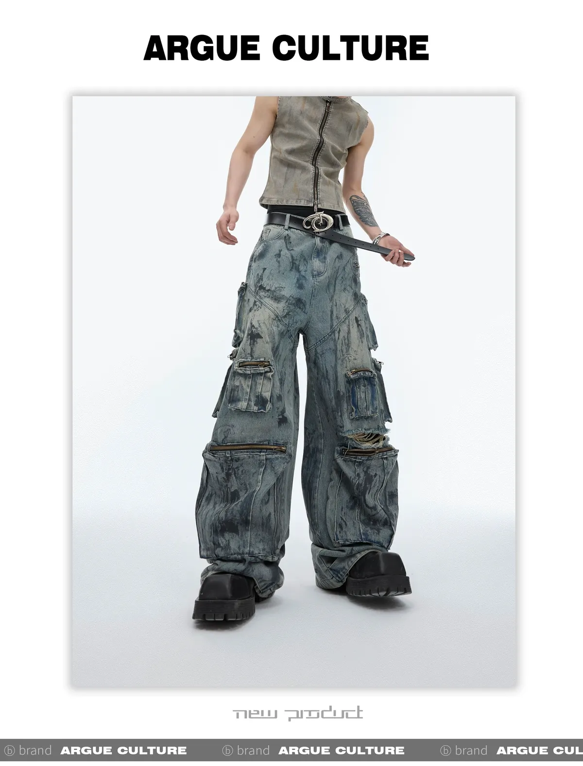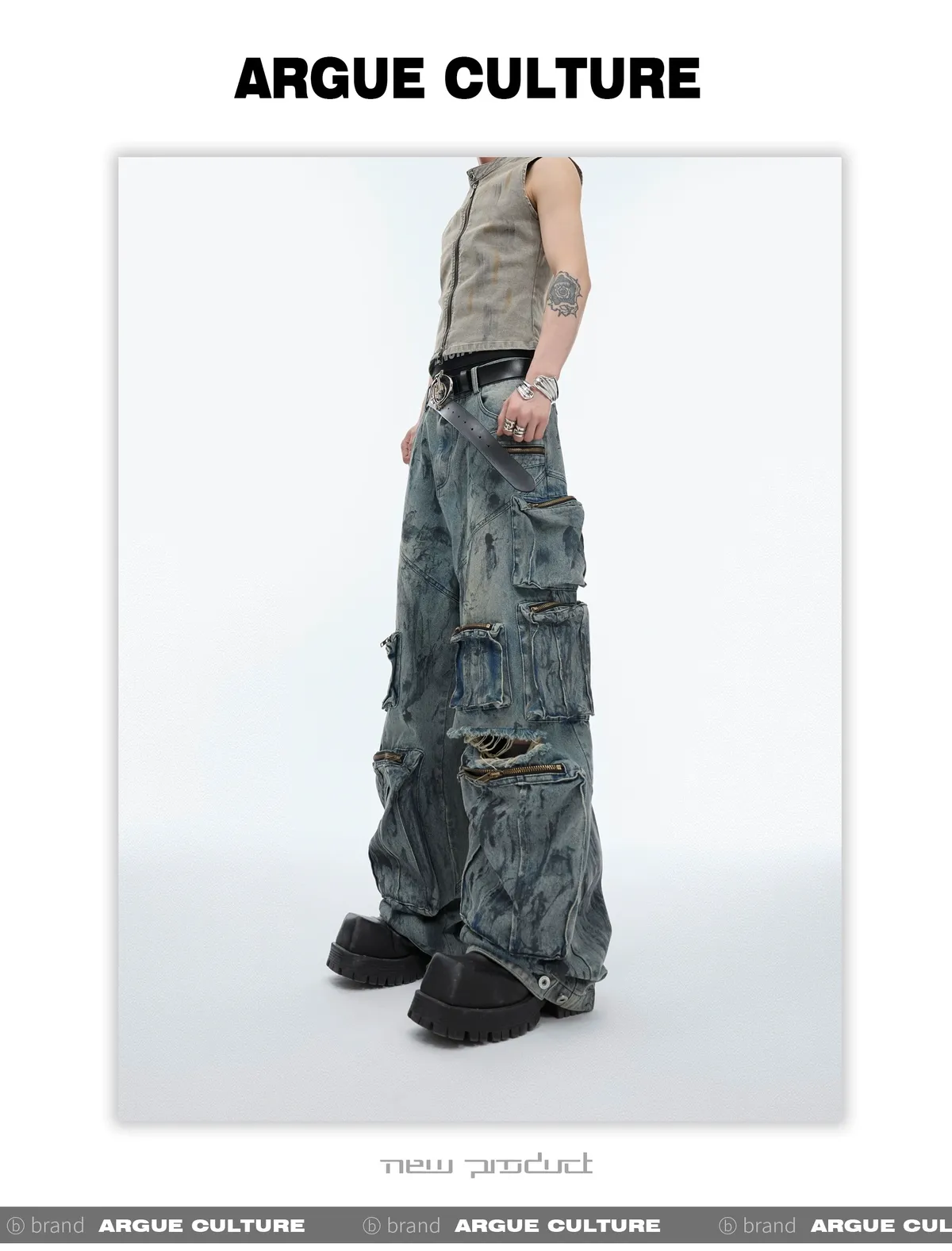 破壞矛盾 做舊 多口袋 手繪 牛仔褲 砲彈褲 長褲(藍/黑)