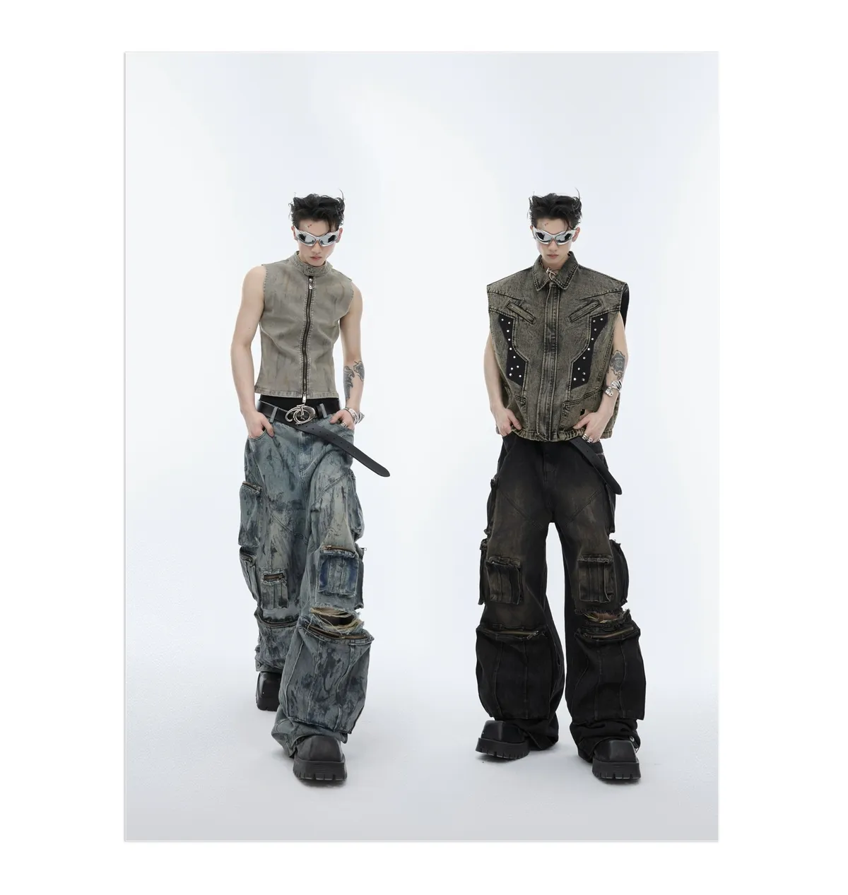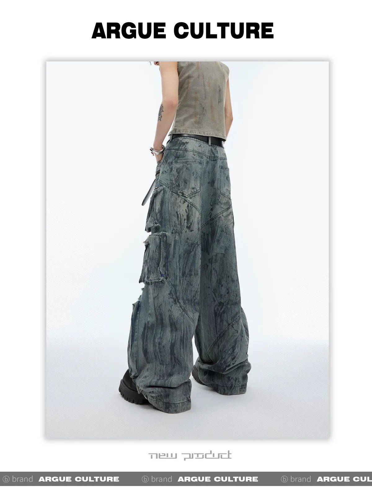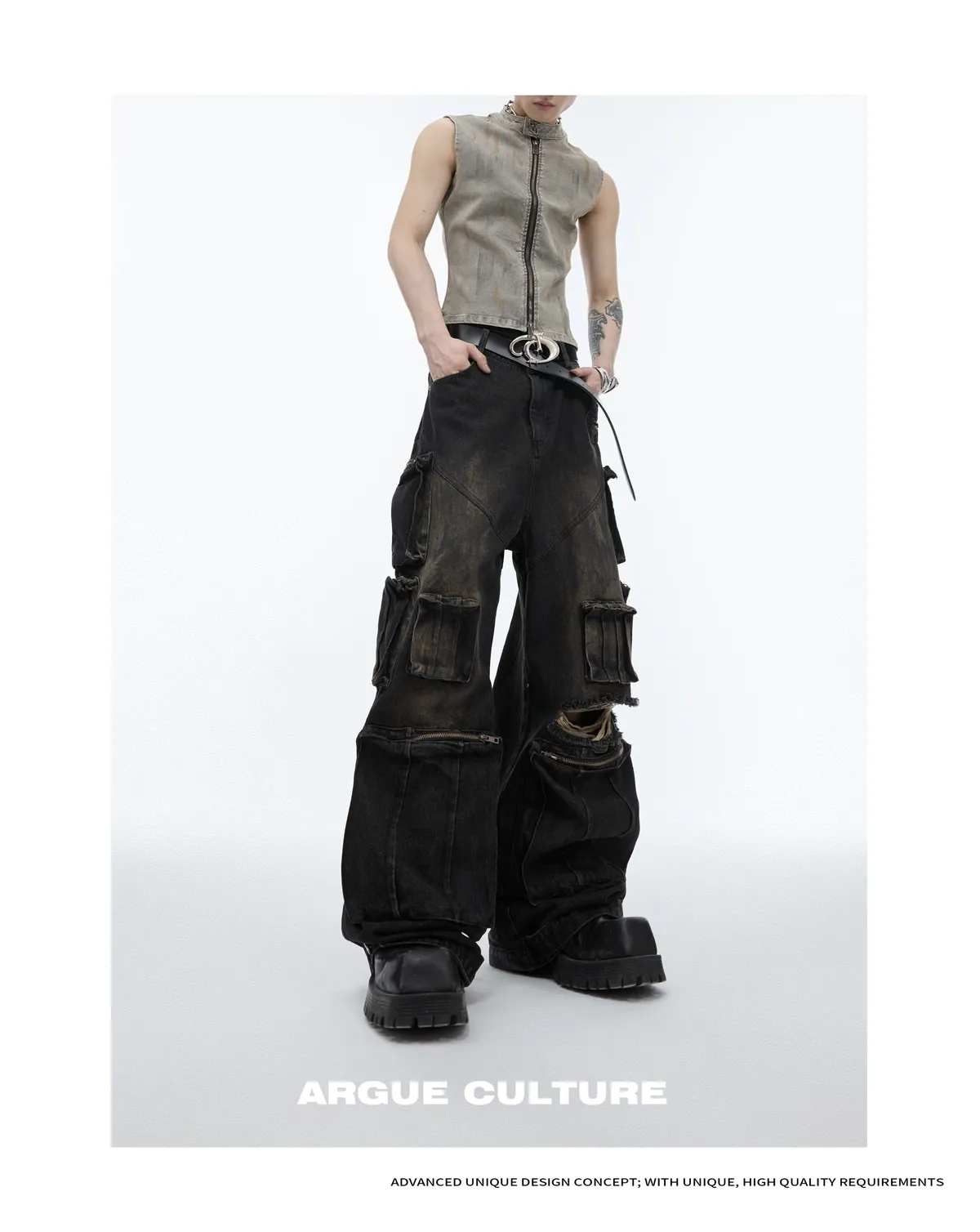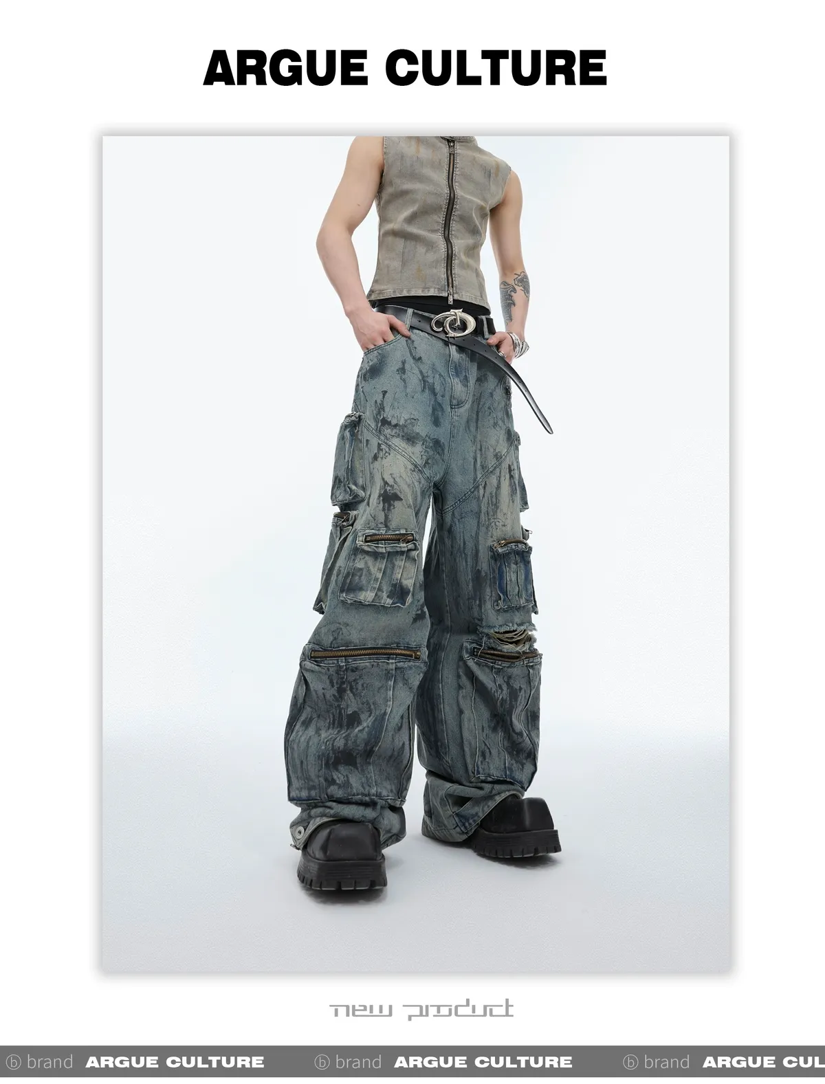 破壞矛盾 做舊 多口袋 手繪 牛仔褲 砲彈褲 長褲(藍/黑)