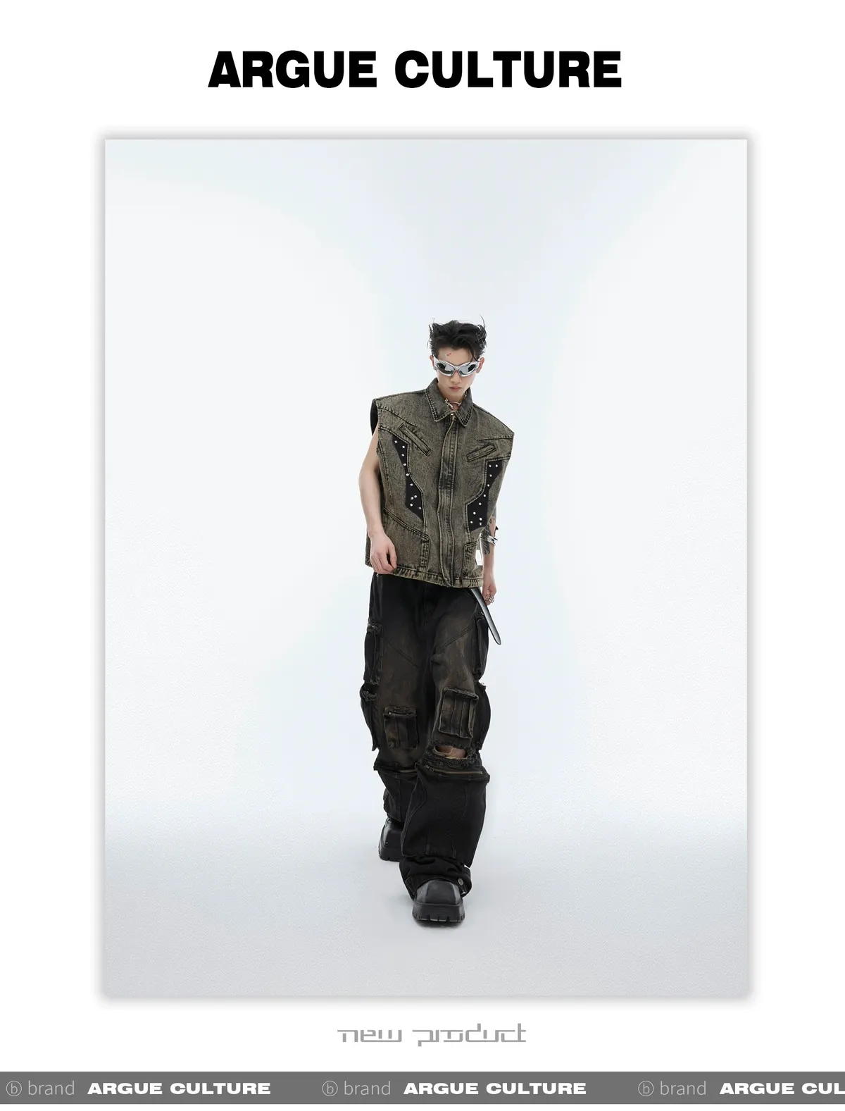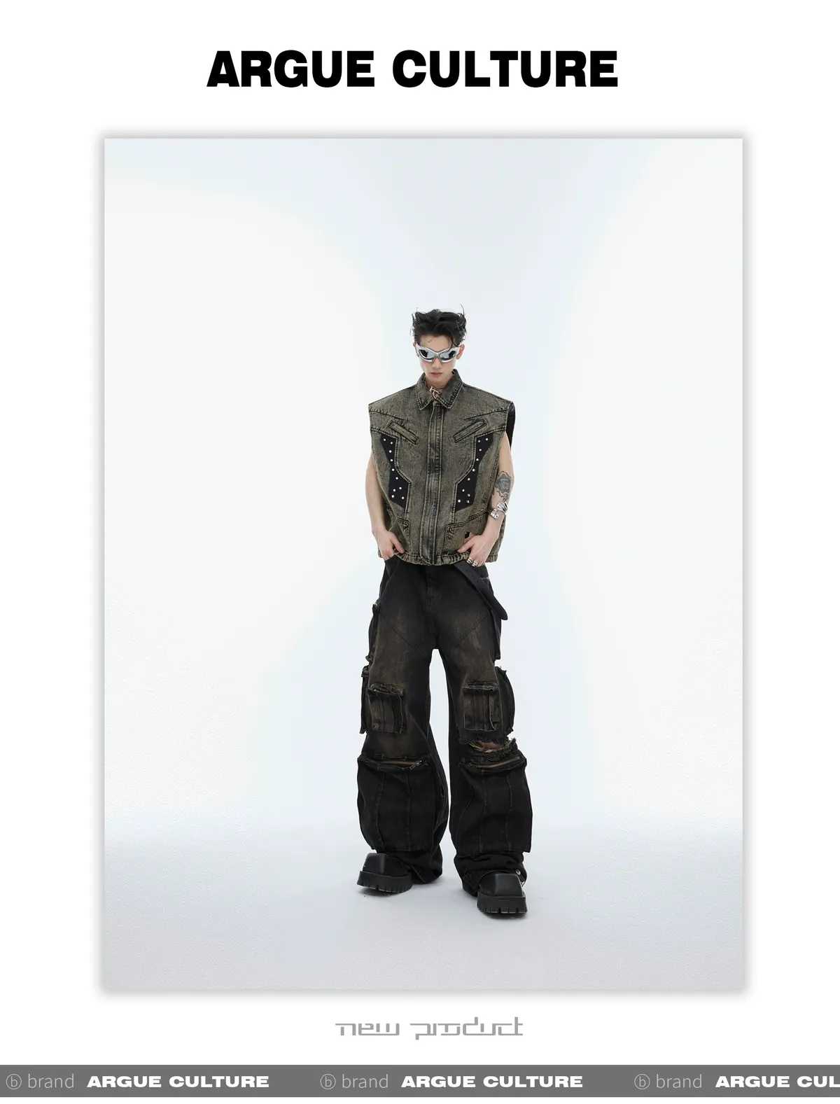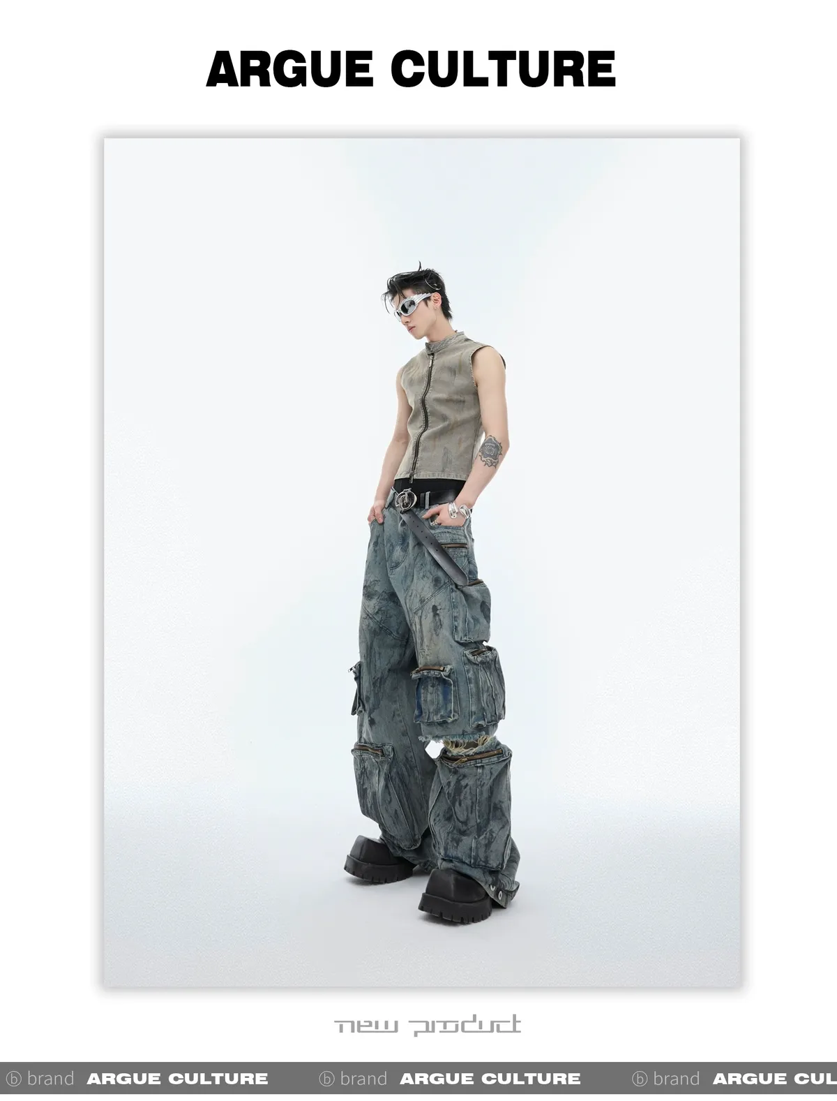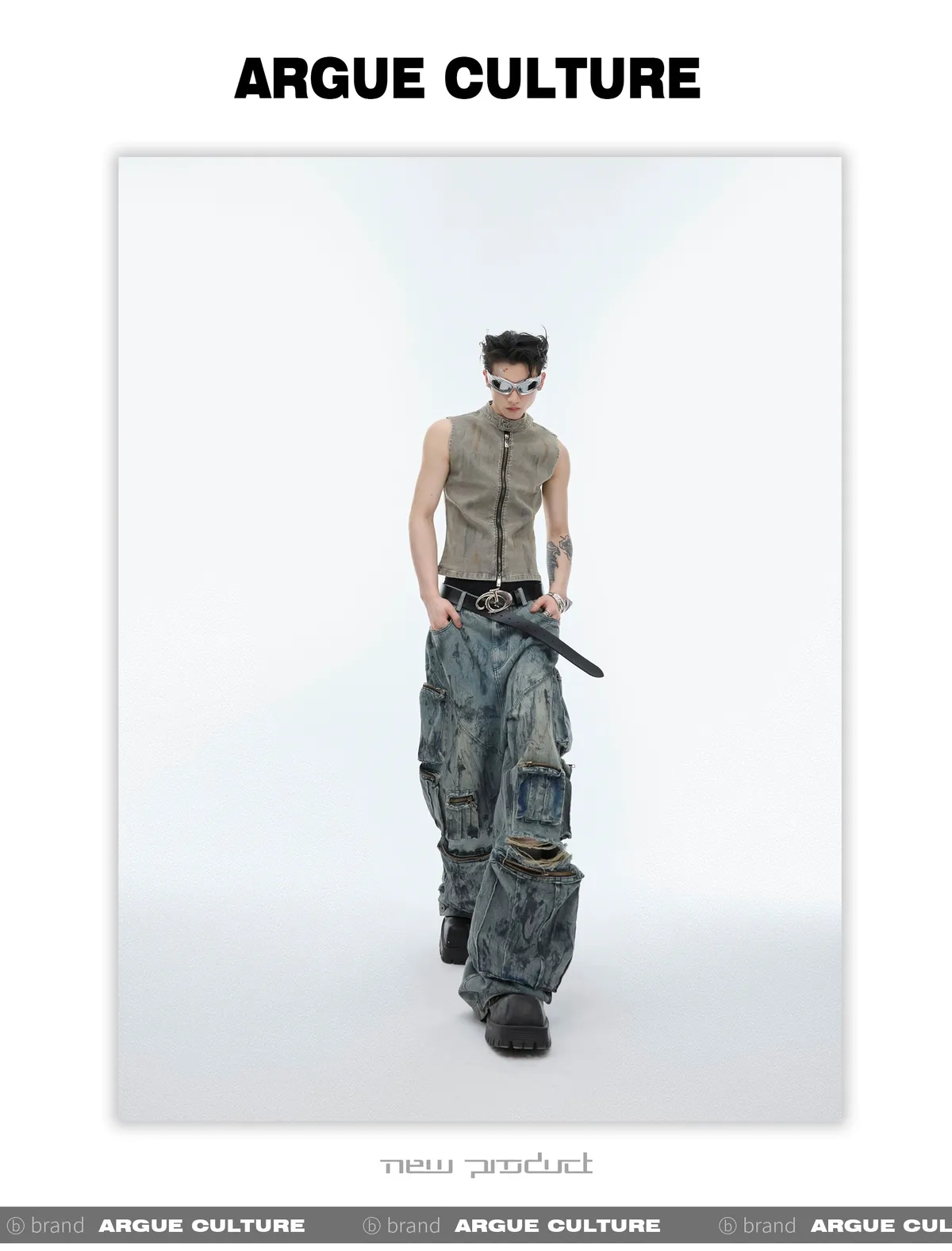 破壞矛盾 做舊 多口袋 手繪 牛仔褲 砲彈褲 長褲(藍/黑)