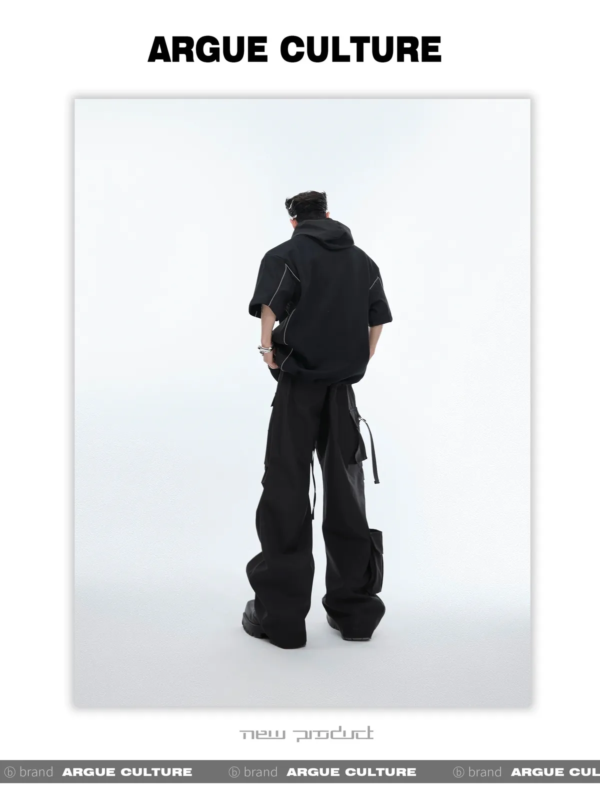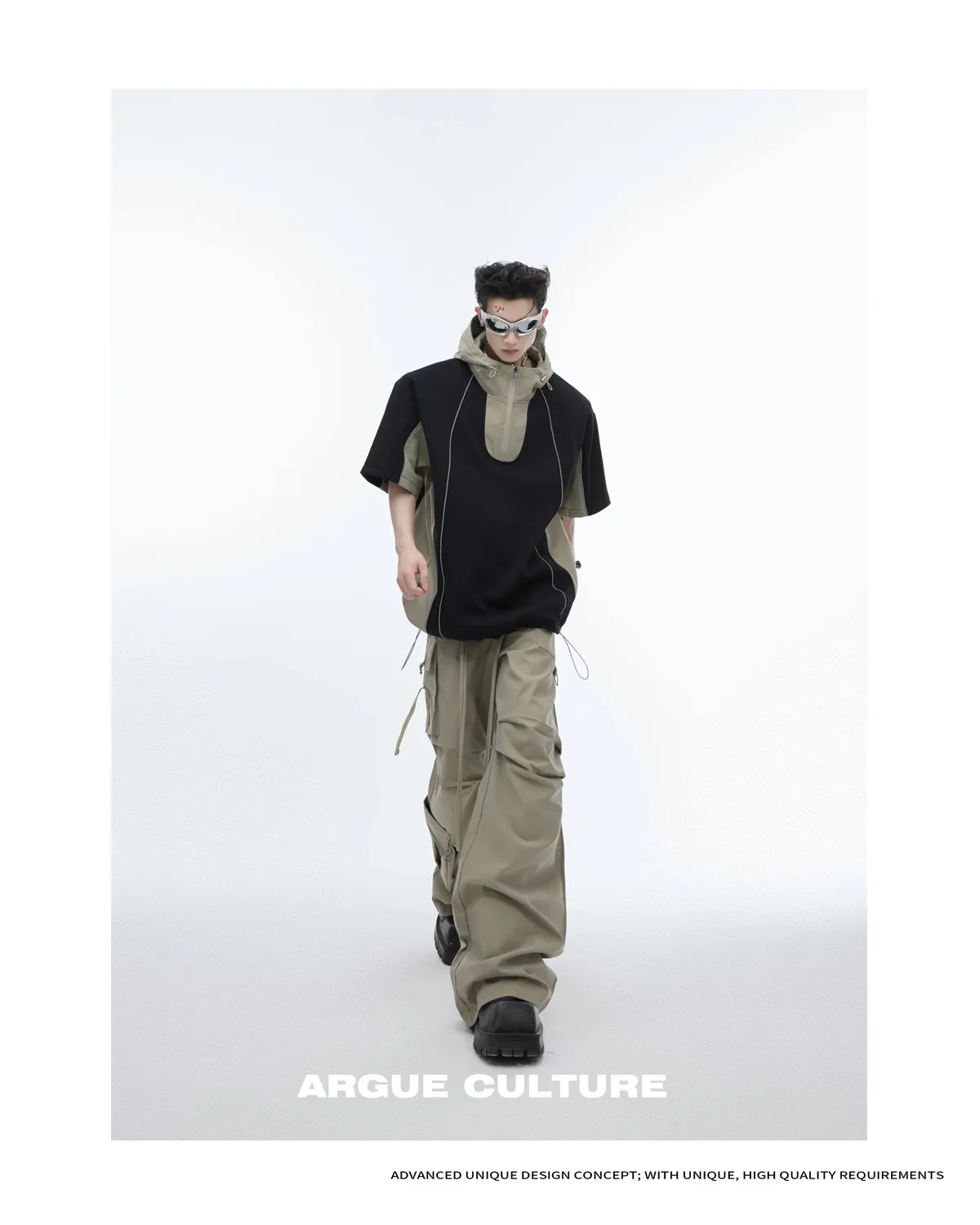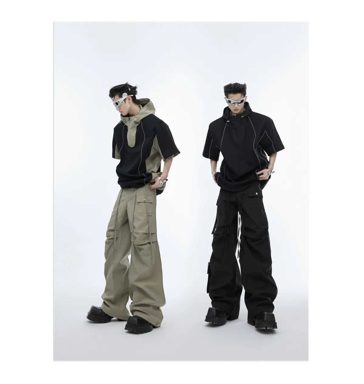 解構拼接 設計感 連帽 短袖 工裝褲 長褲 套裝(黑/杏)