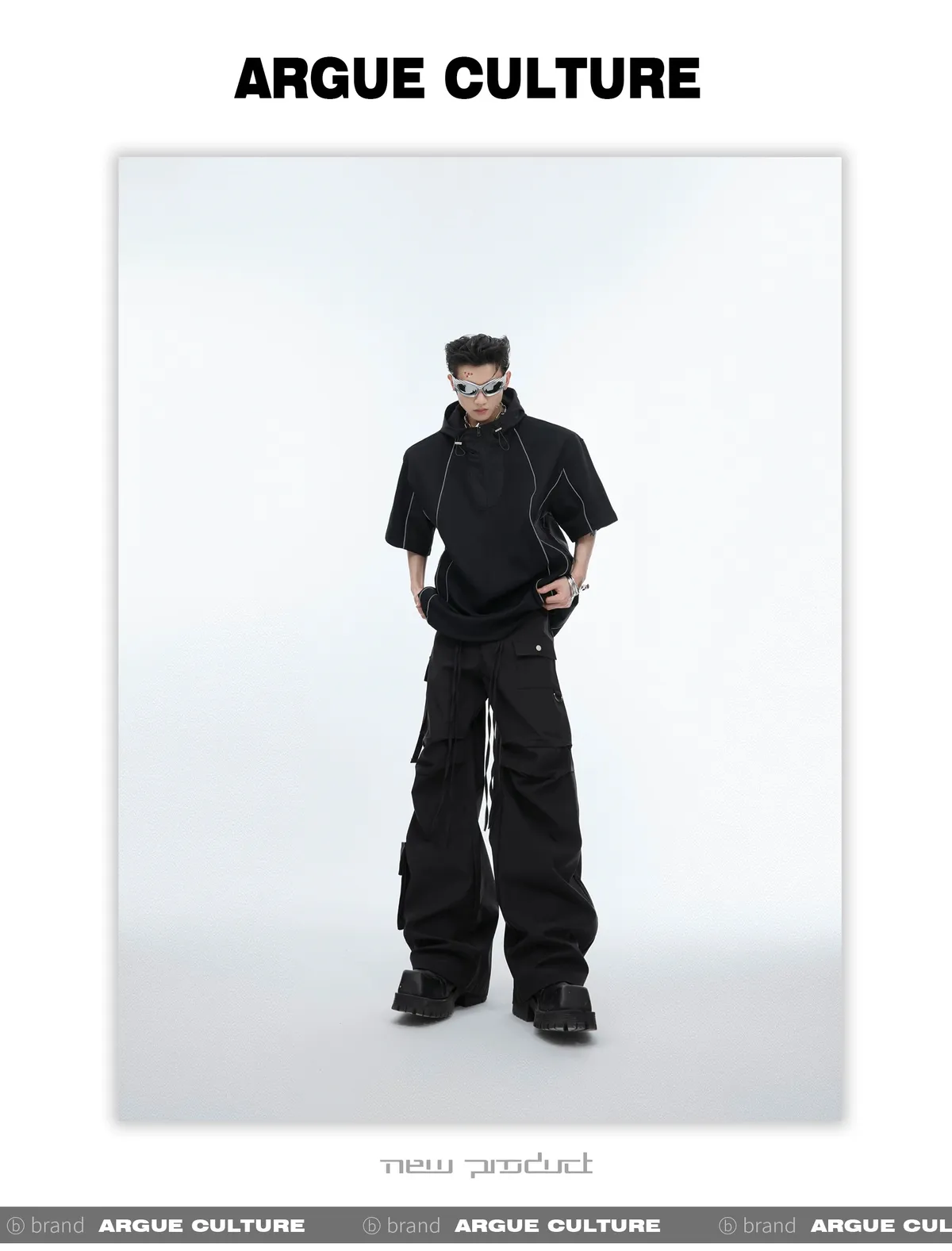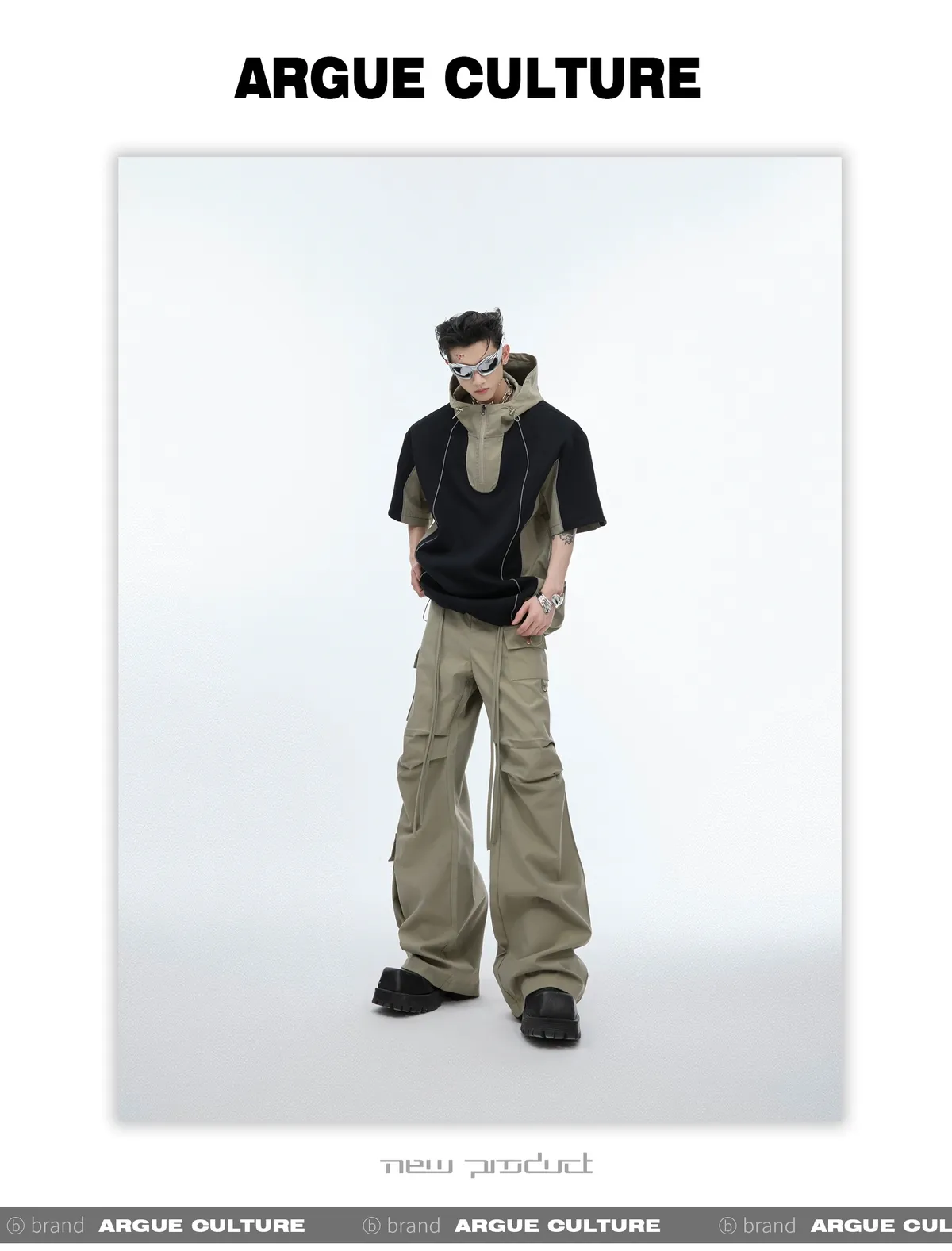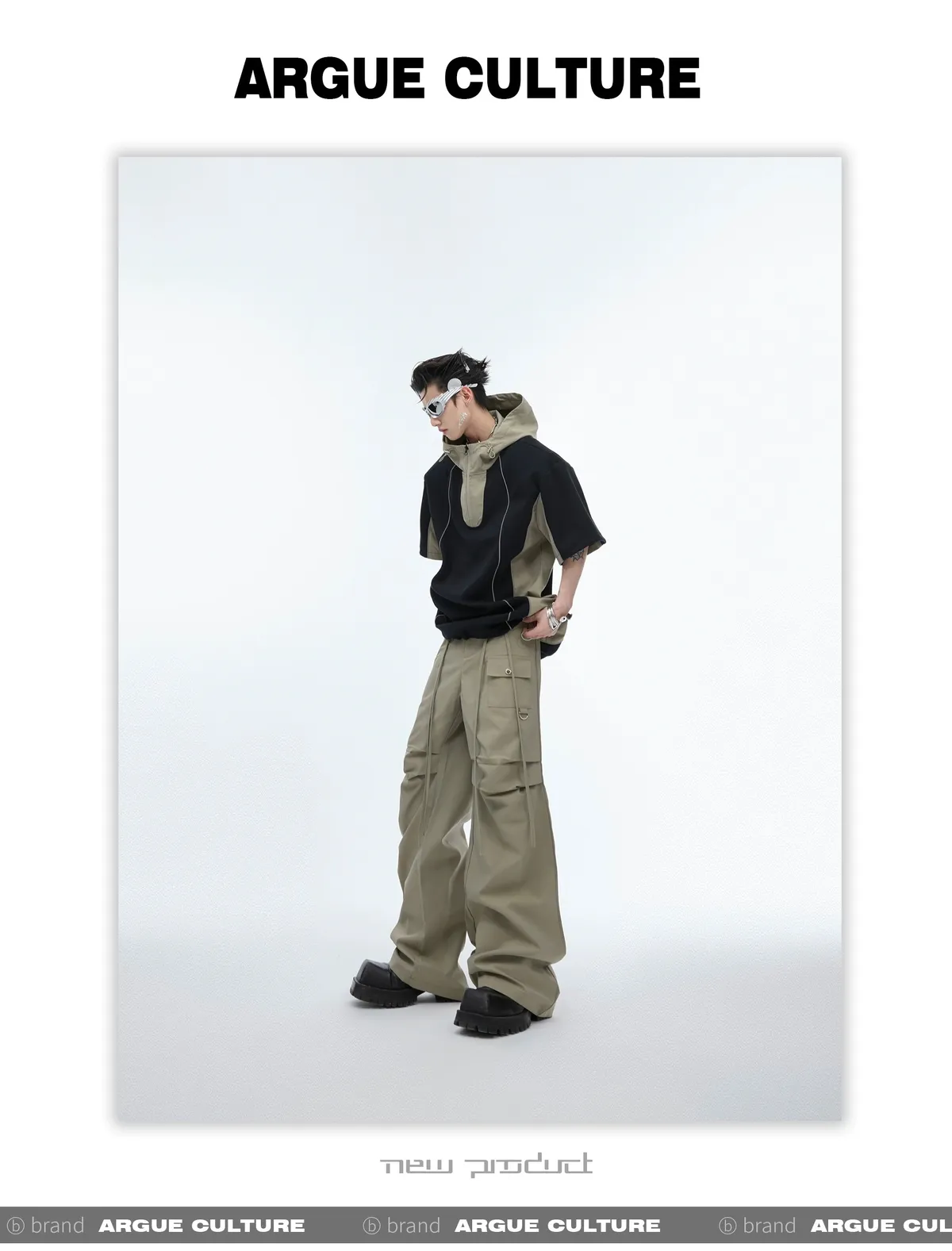 解構拼接 設計感 連帽 短袖 工裝褲 長褲 套裝(黑/杏)