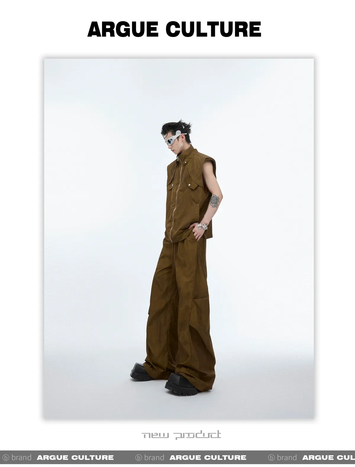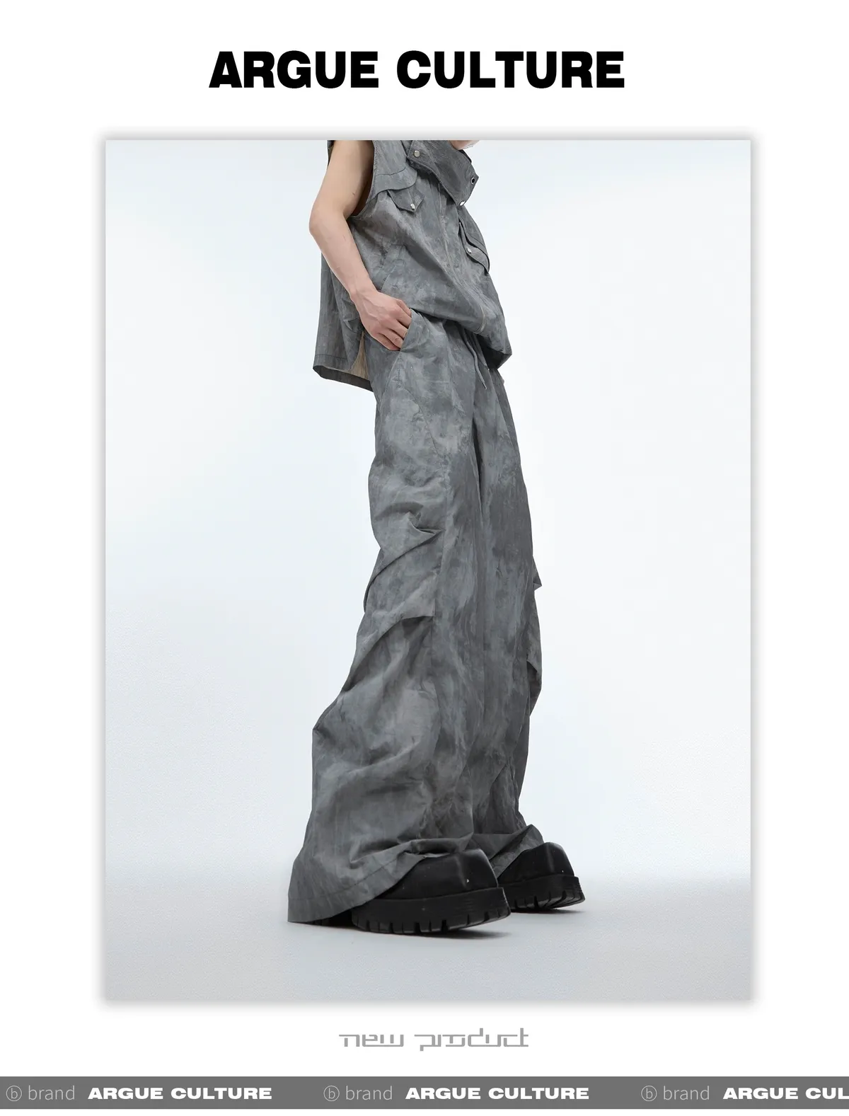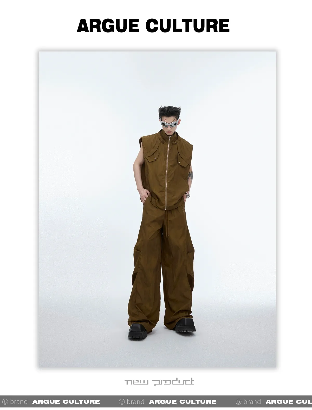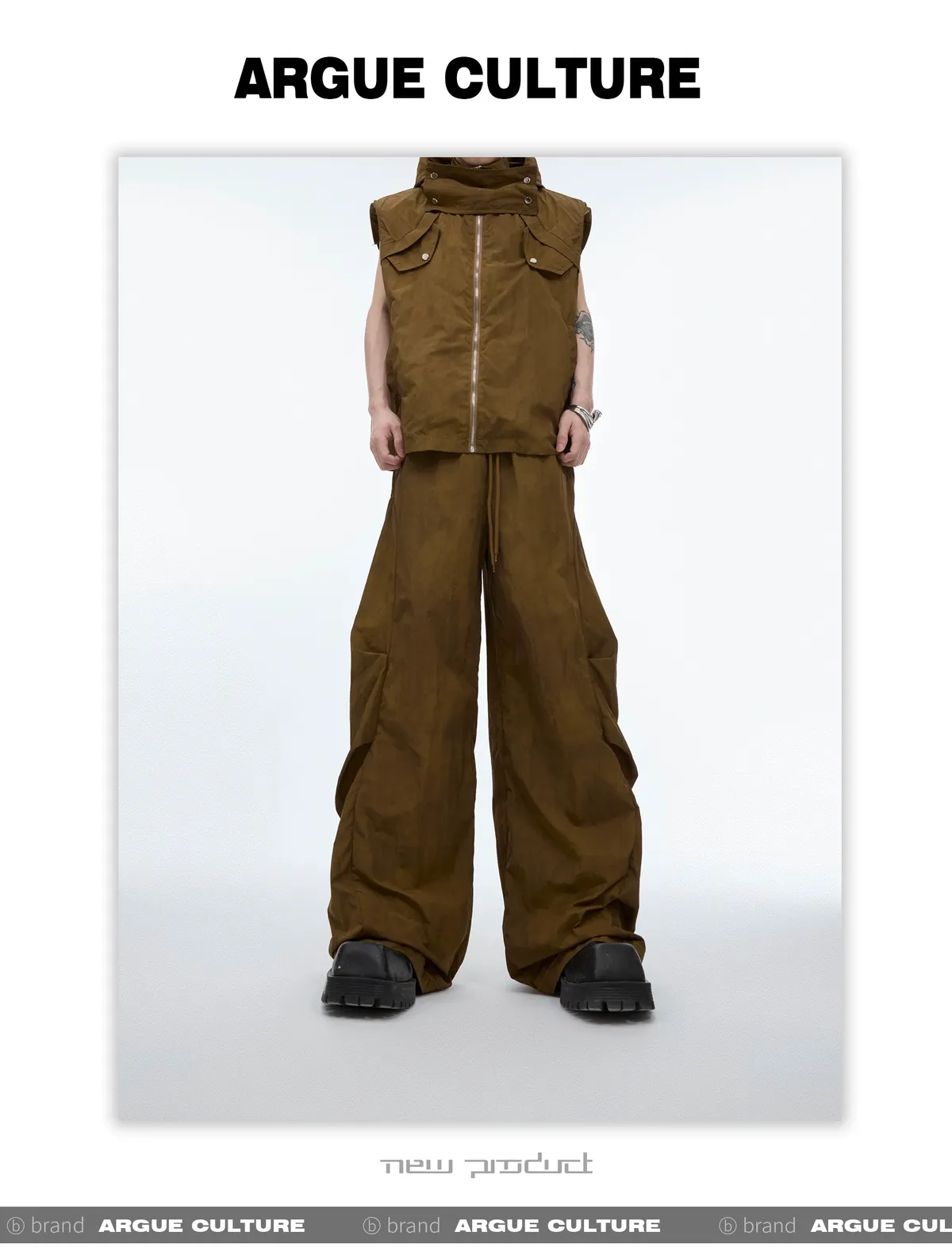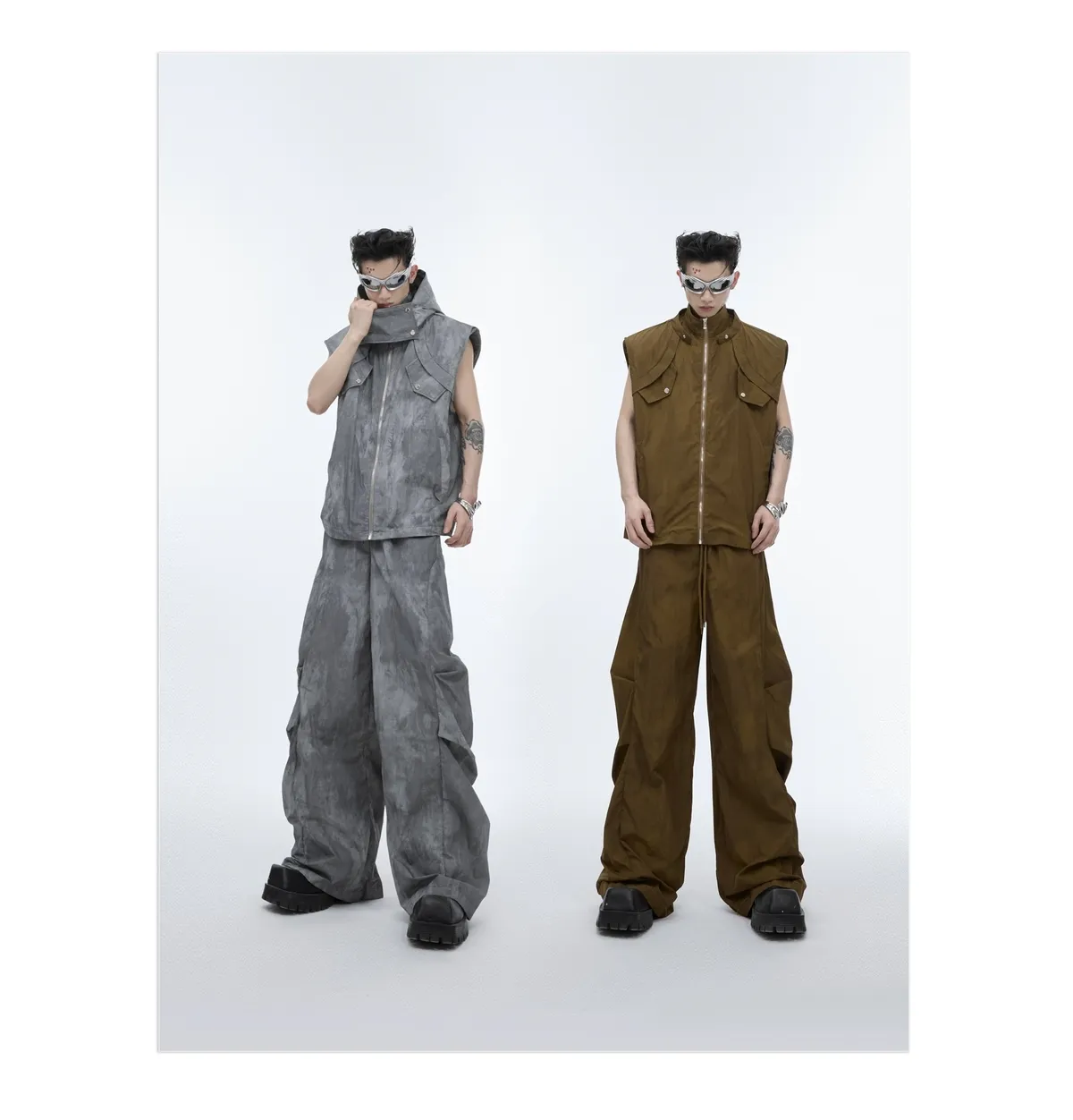 影面流液 尼龍 工裝感 小立領 紮染 背心 闊腿褲 套裝(黑/棕)
