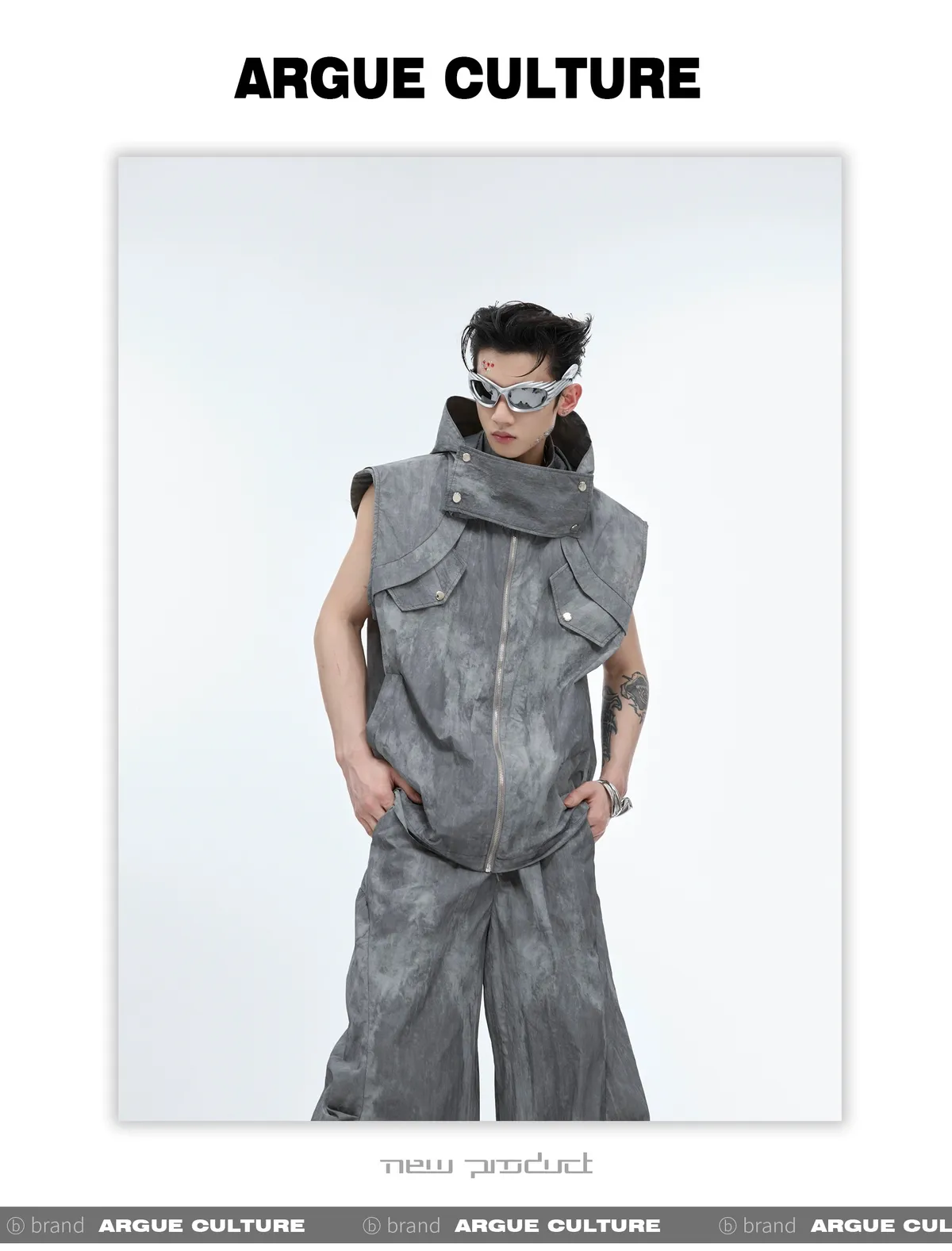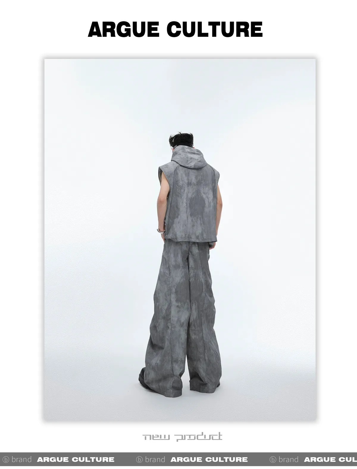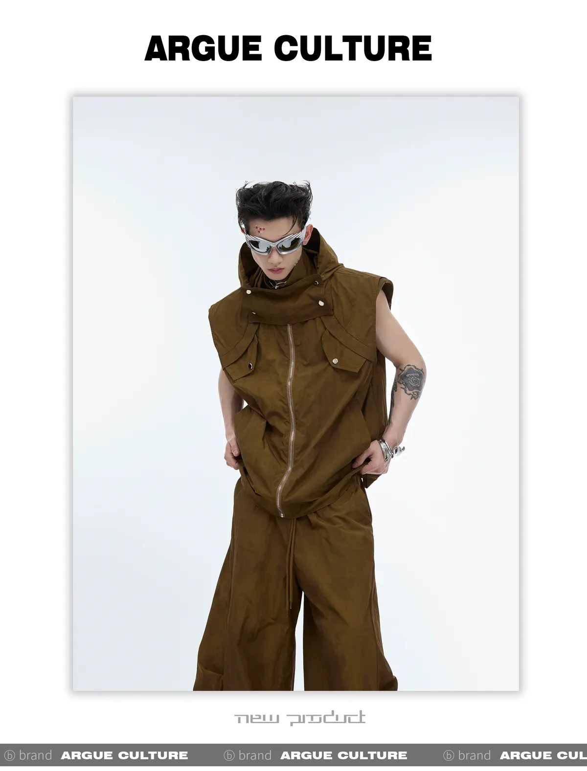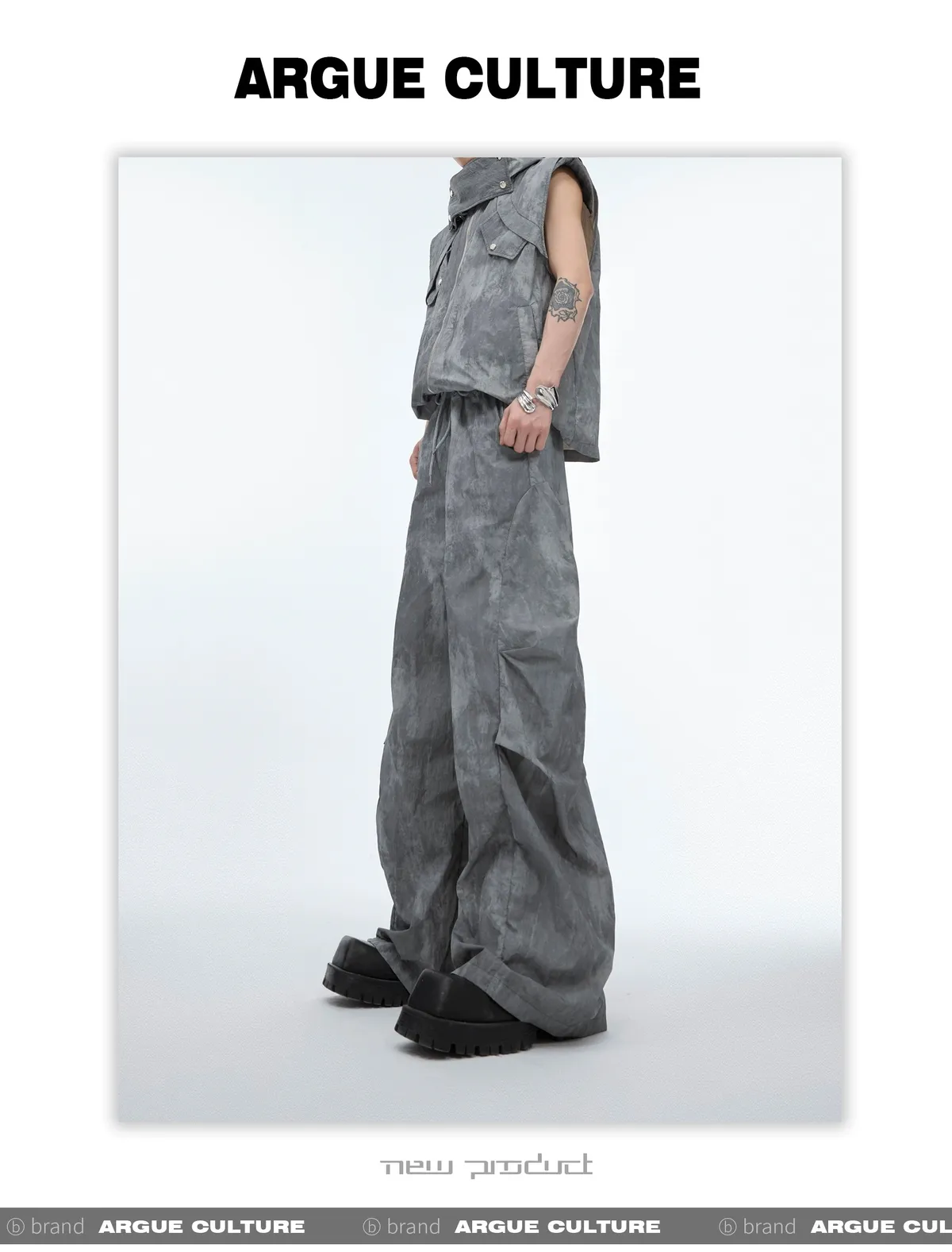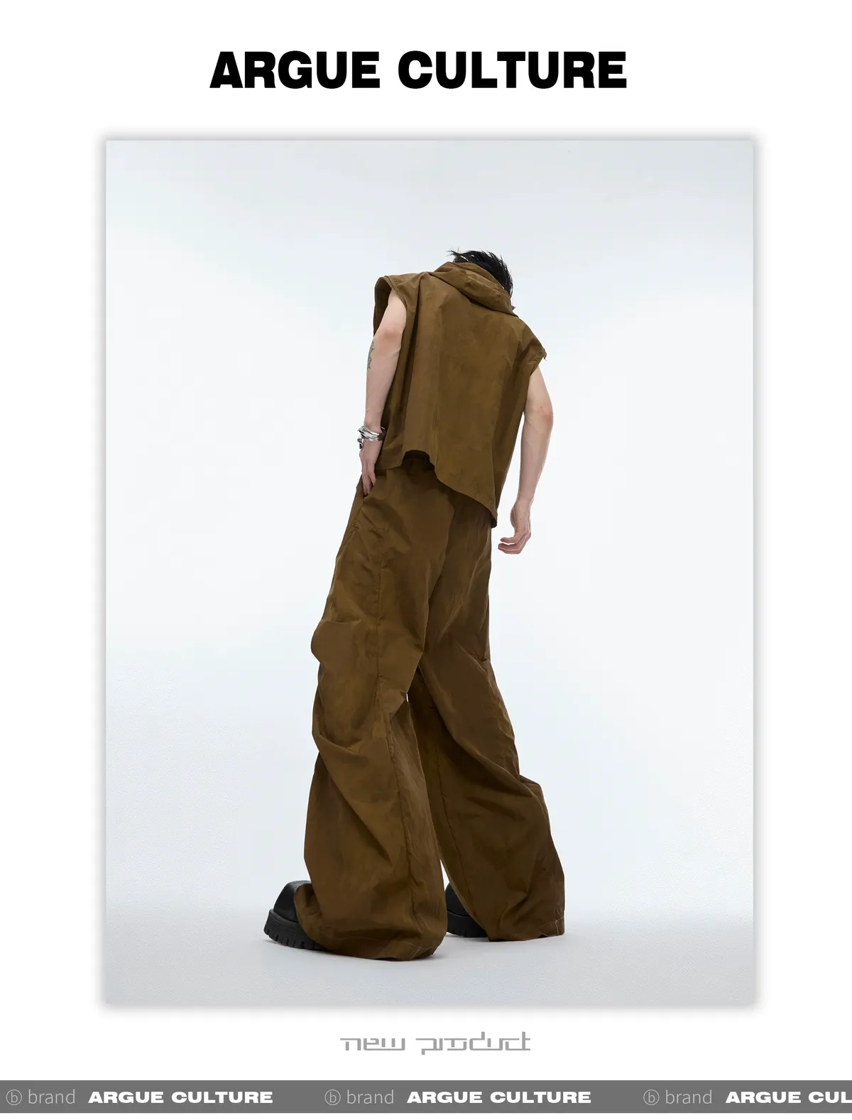 影面流液 尼龍 工裝感 小立領 紮染 背心 闊腿褲 套裝(黑/棕)