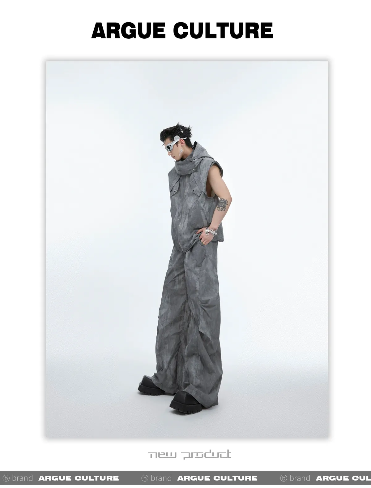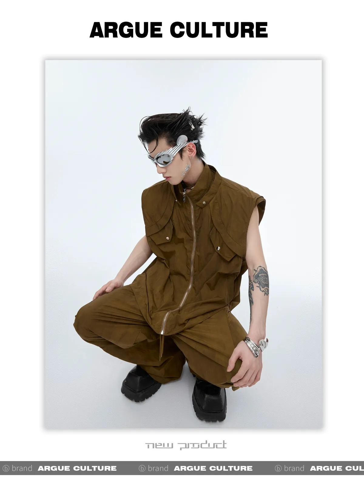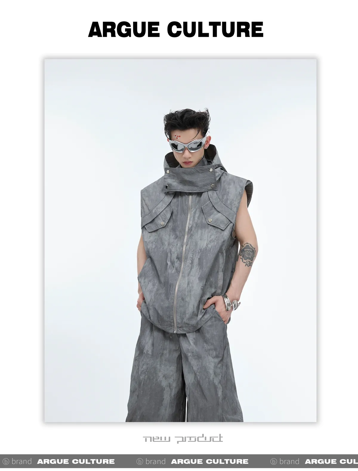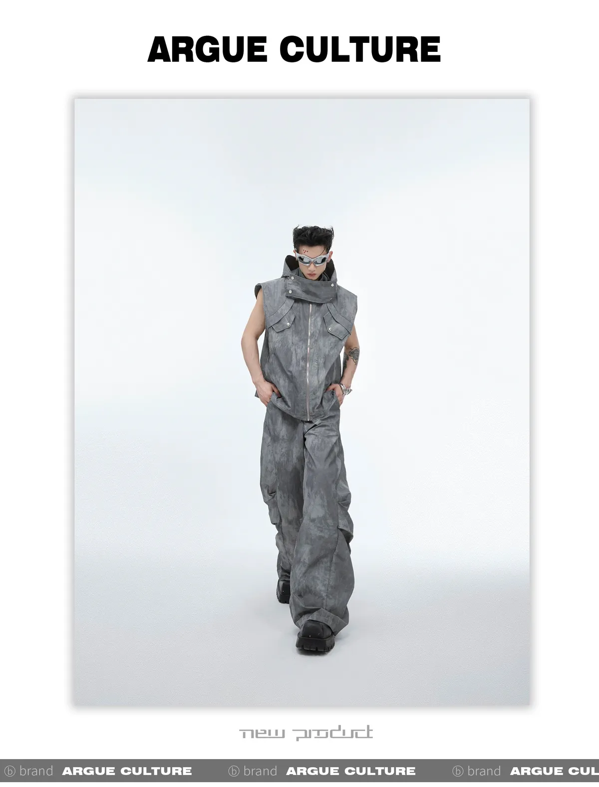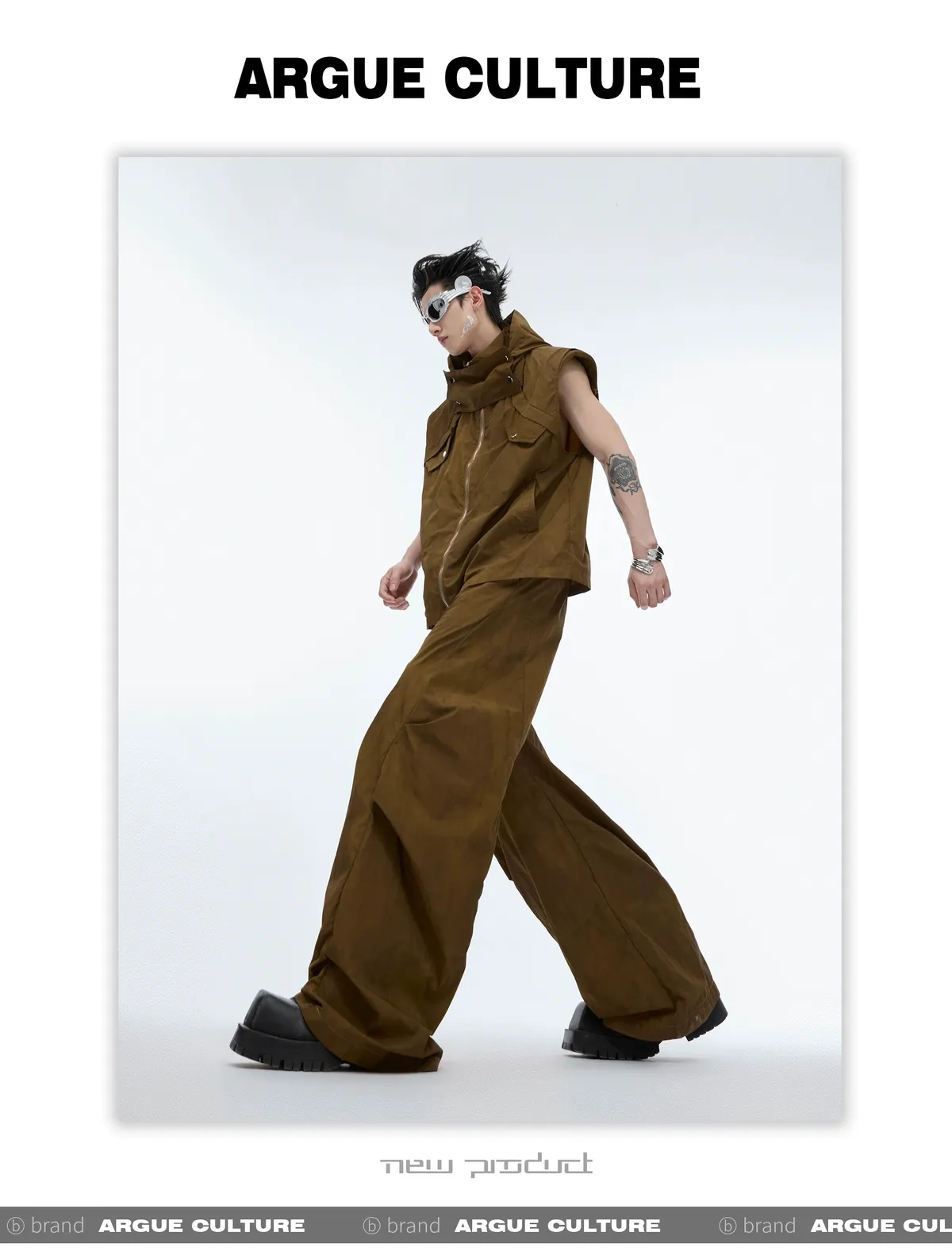 影面流液 尼龍 工裝感 小立領 紮染 背心 闊腿褲 套裝(黑/棕)