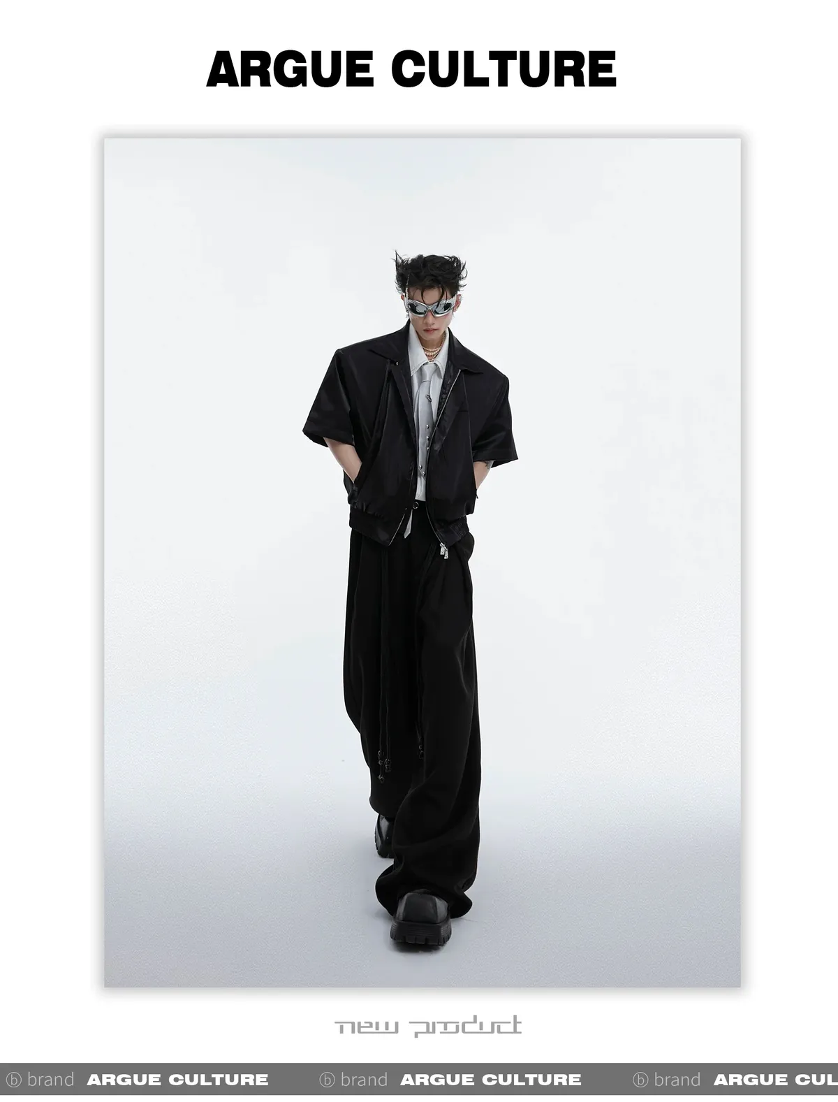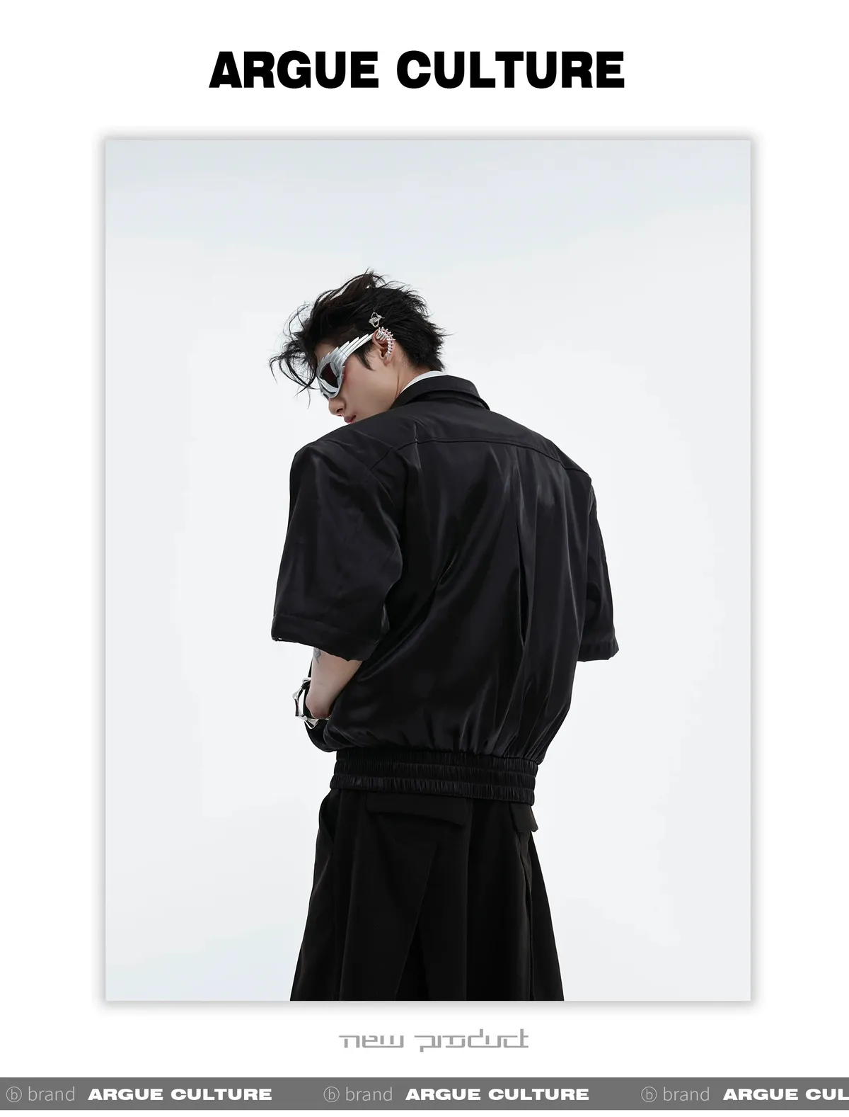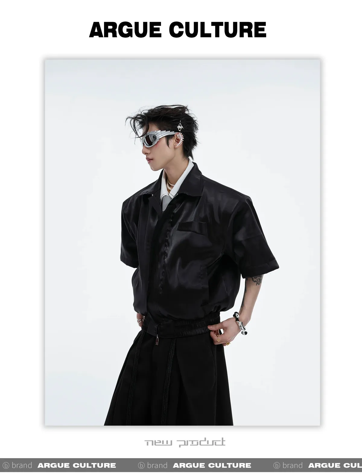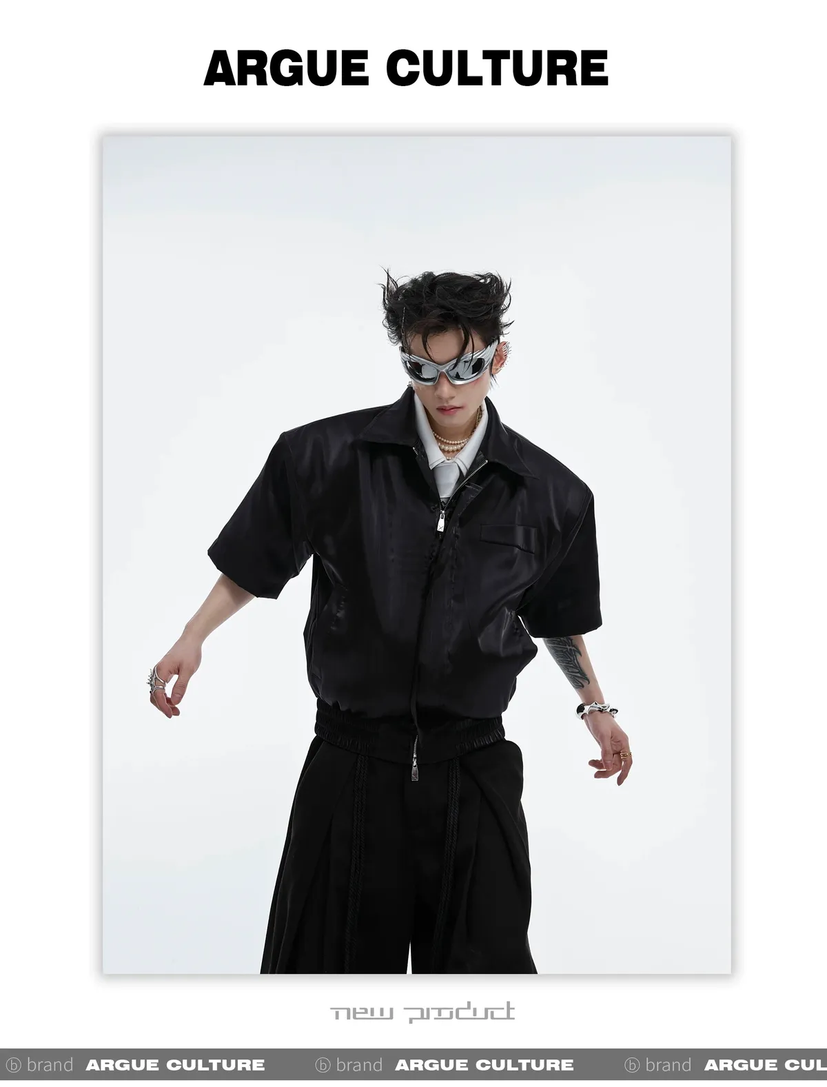 簡約 液態流光 墊肩 拉鍊 短袖(黑色)