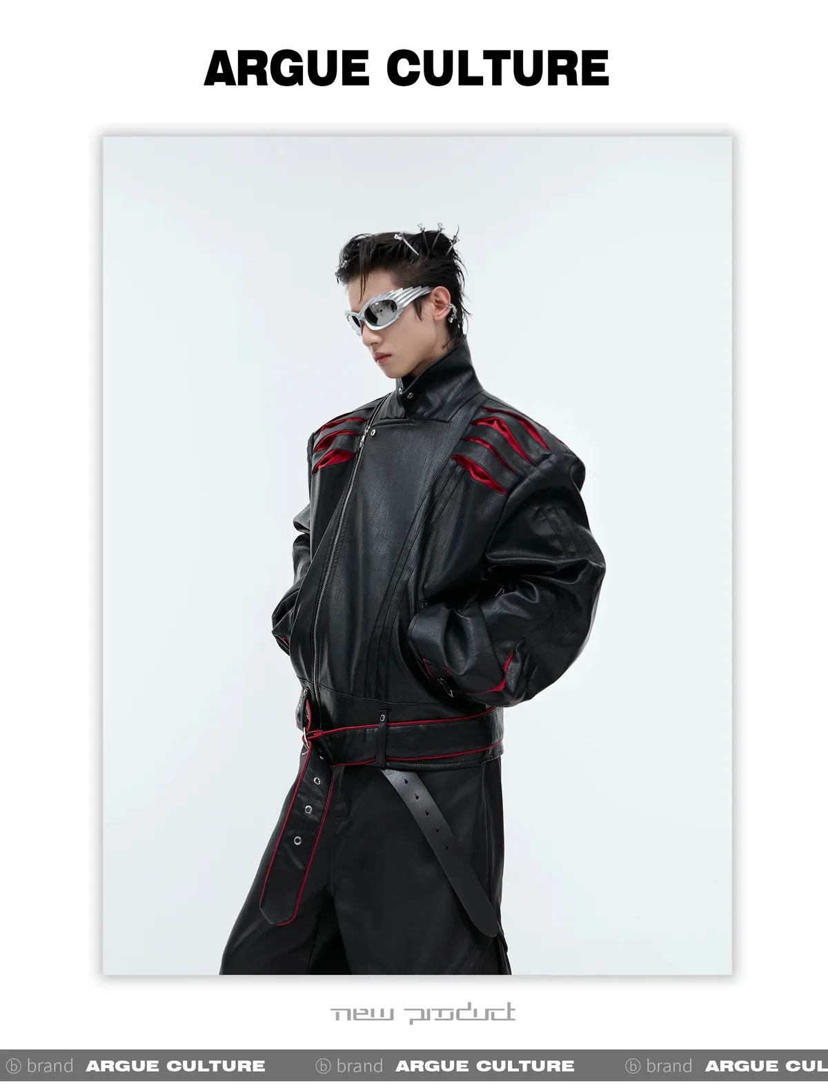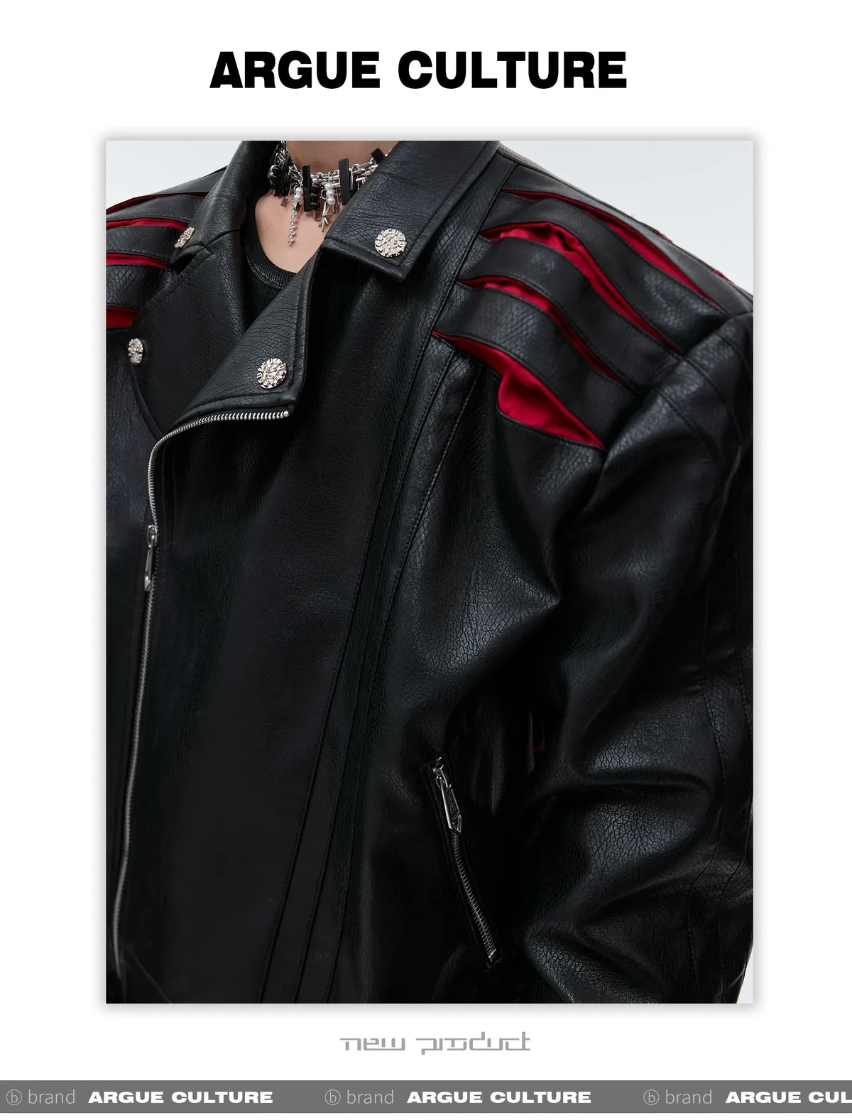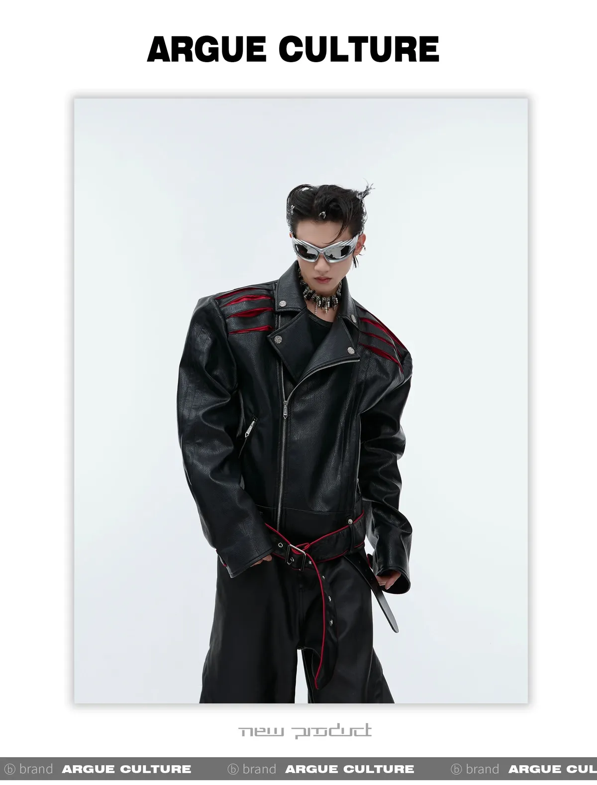 ARGUE 高訂 撞色 脊椎骨 壓褶 短版 皮外套 機車外套(黑色)