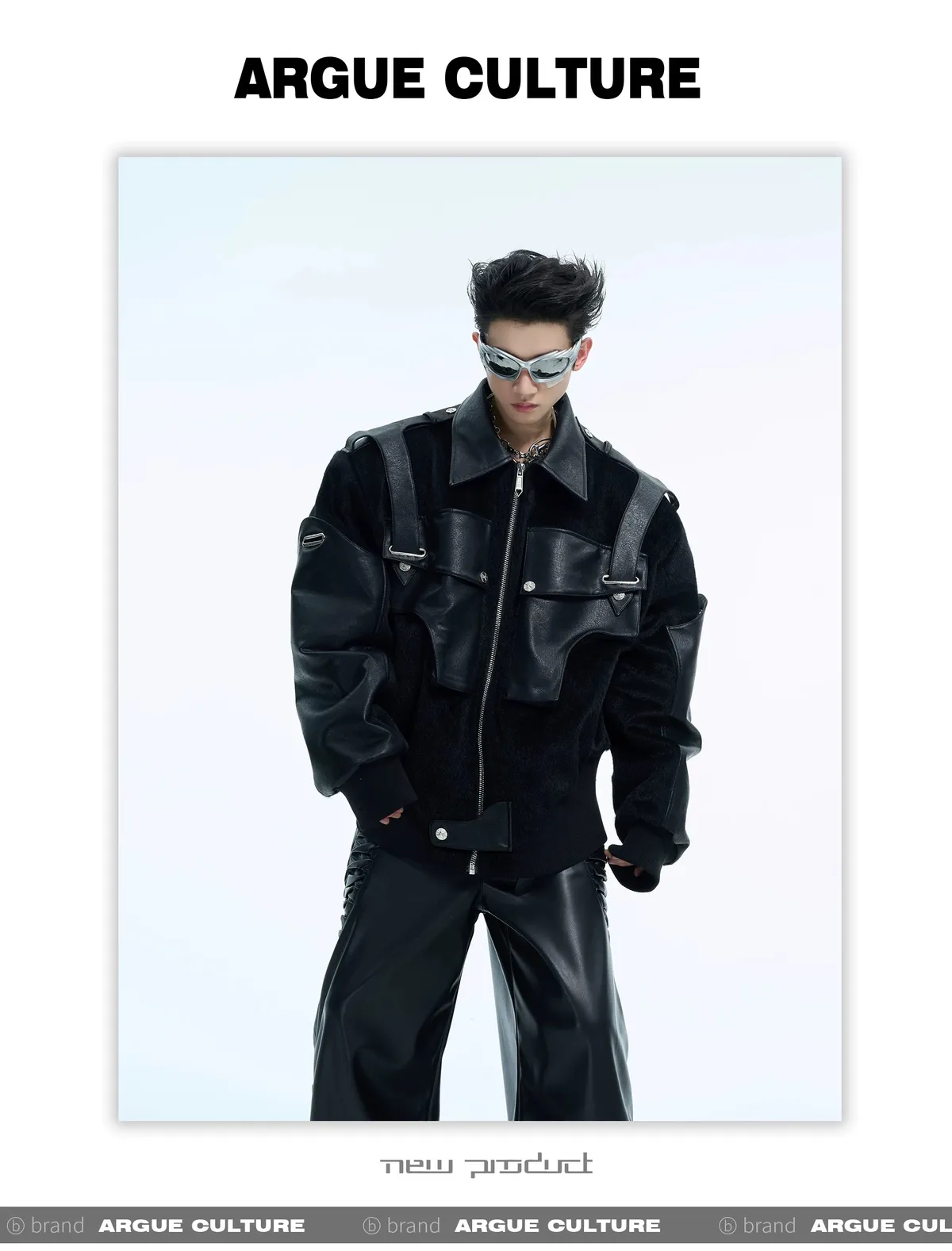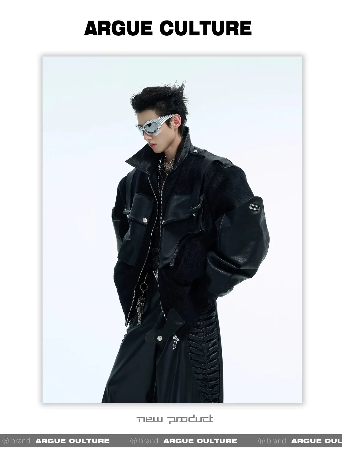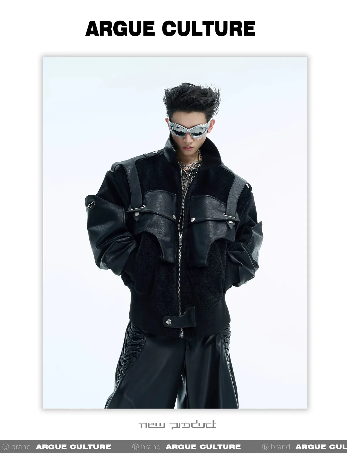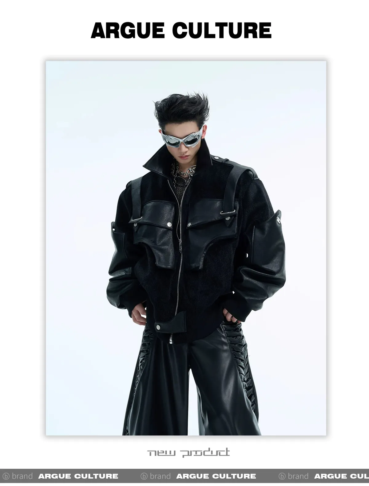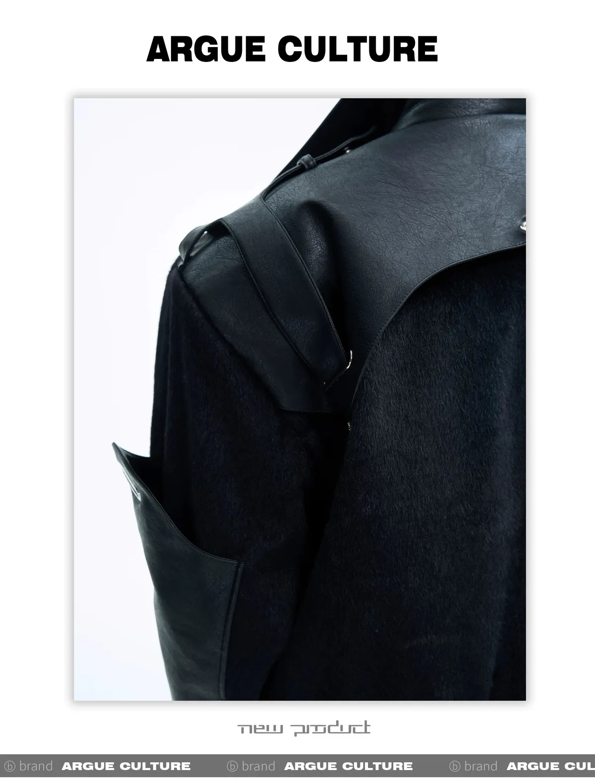 ARGUE 皮革拼接 解構 短毛絨 外套(黑色)