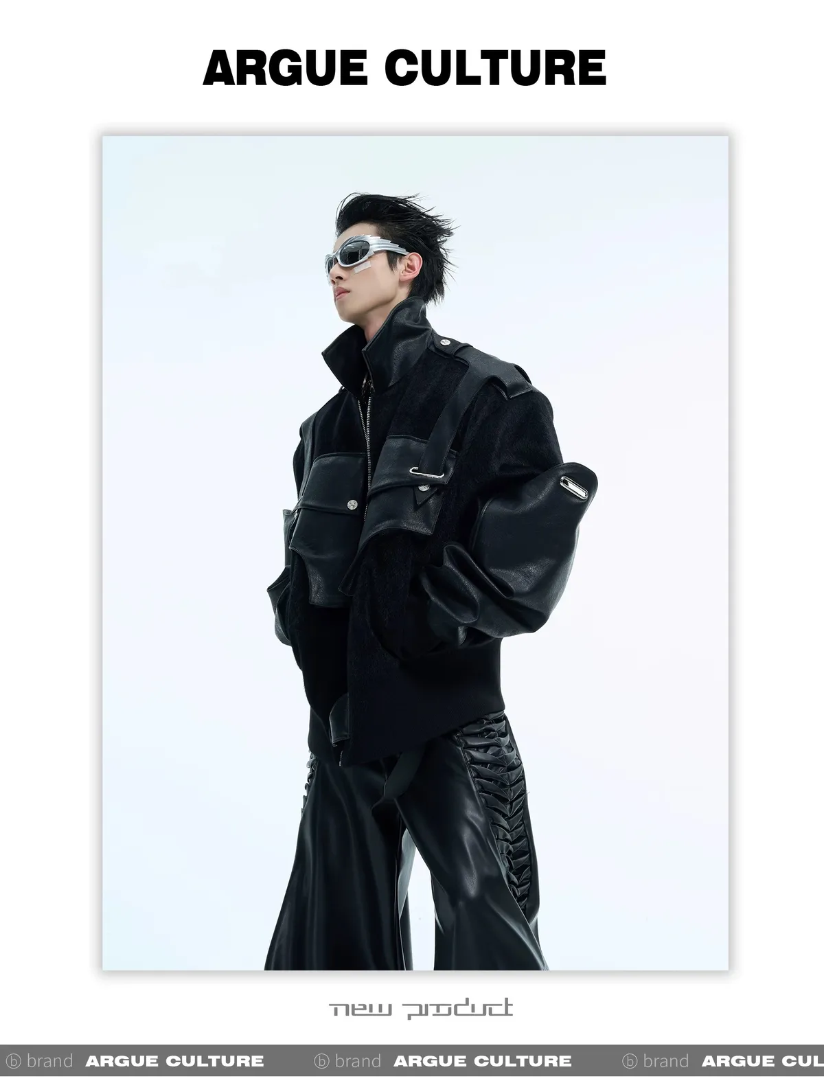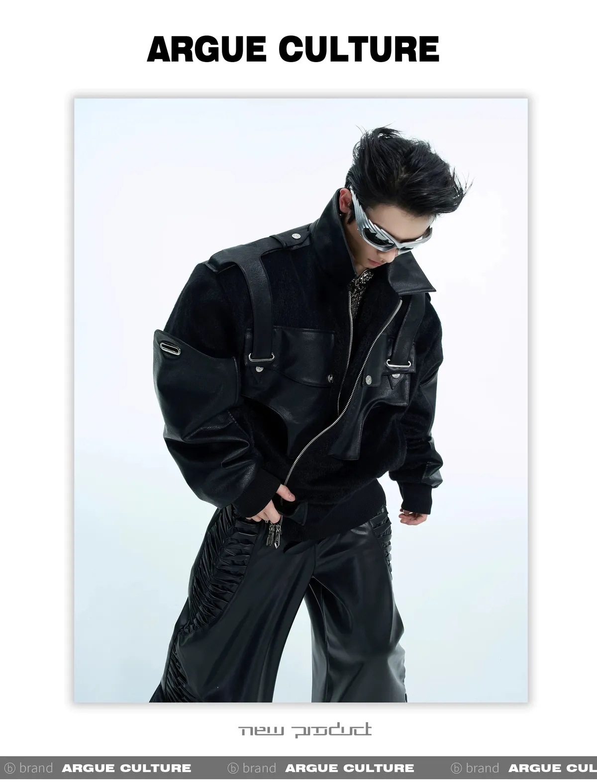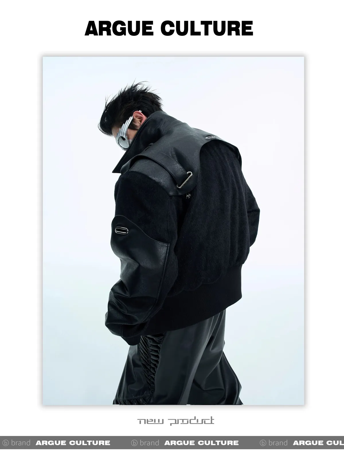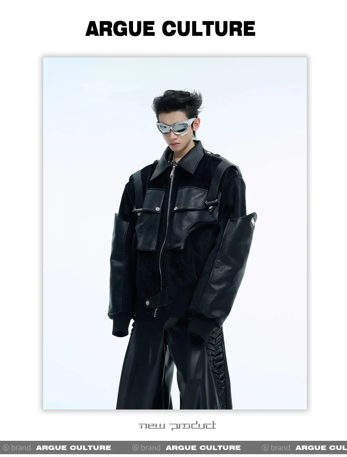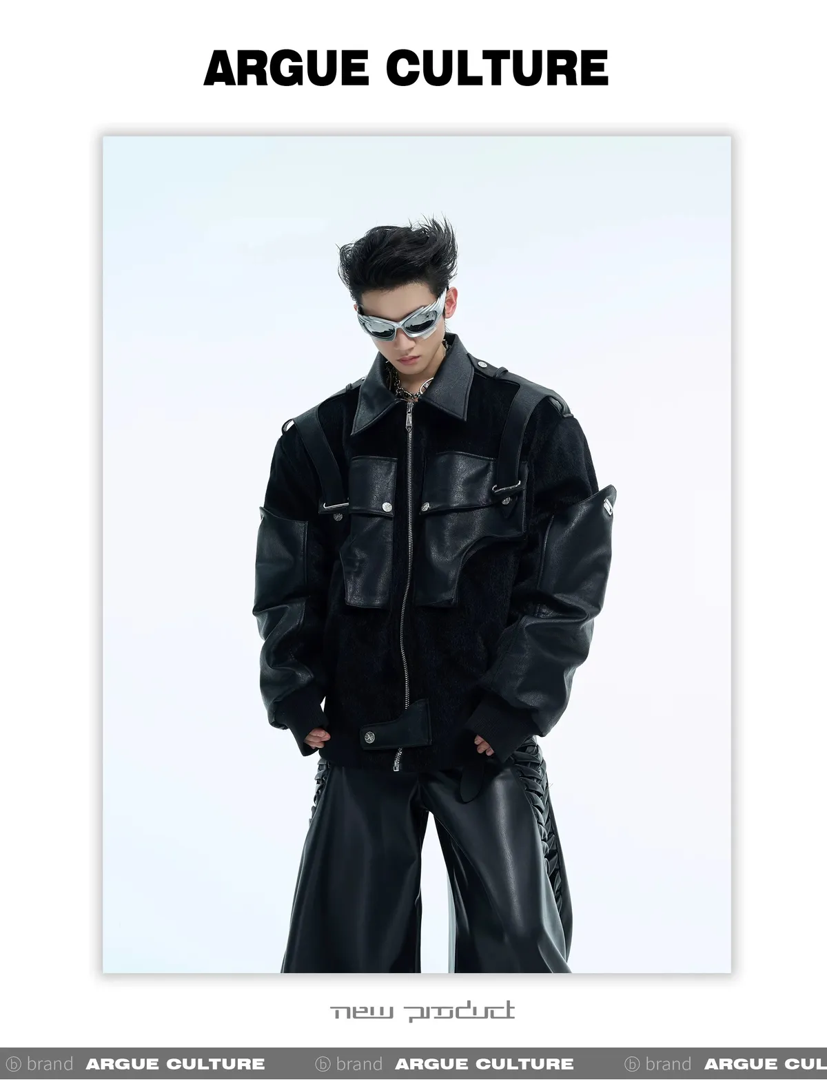 ARGUE 皮革拼接 解構 短毛絨 外套(黑色)