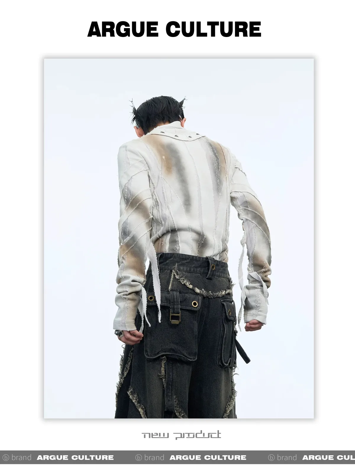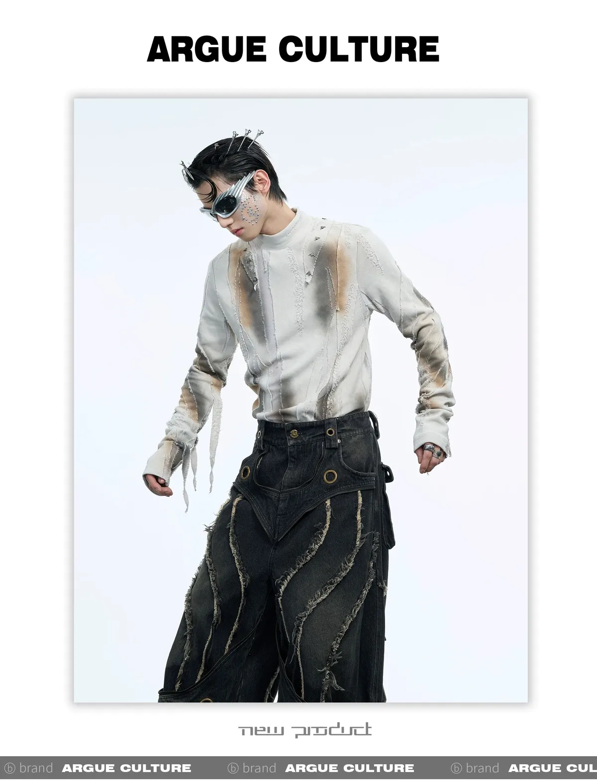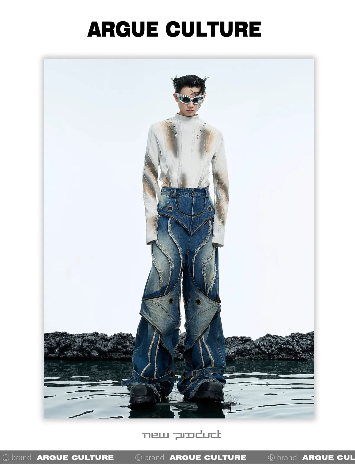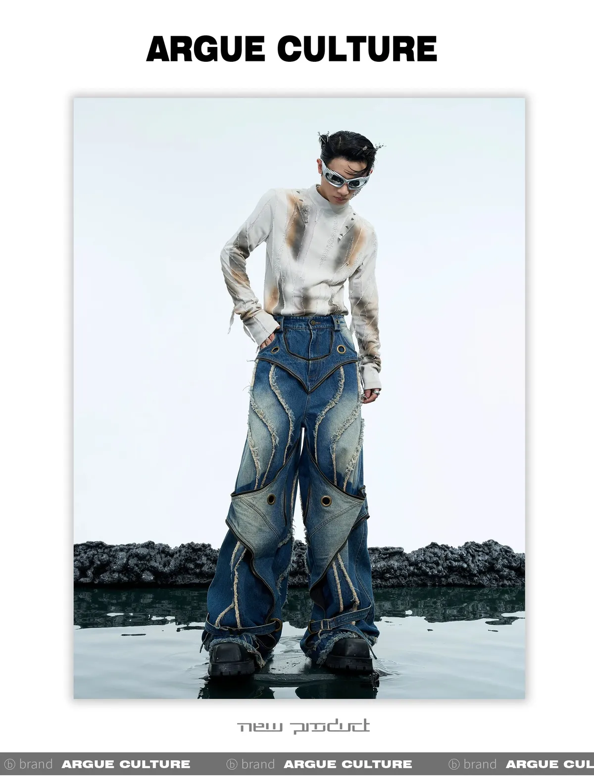 ARGUE 雙層結構 拼接 抽鬚 牛仔褲(黑/藍)
