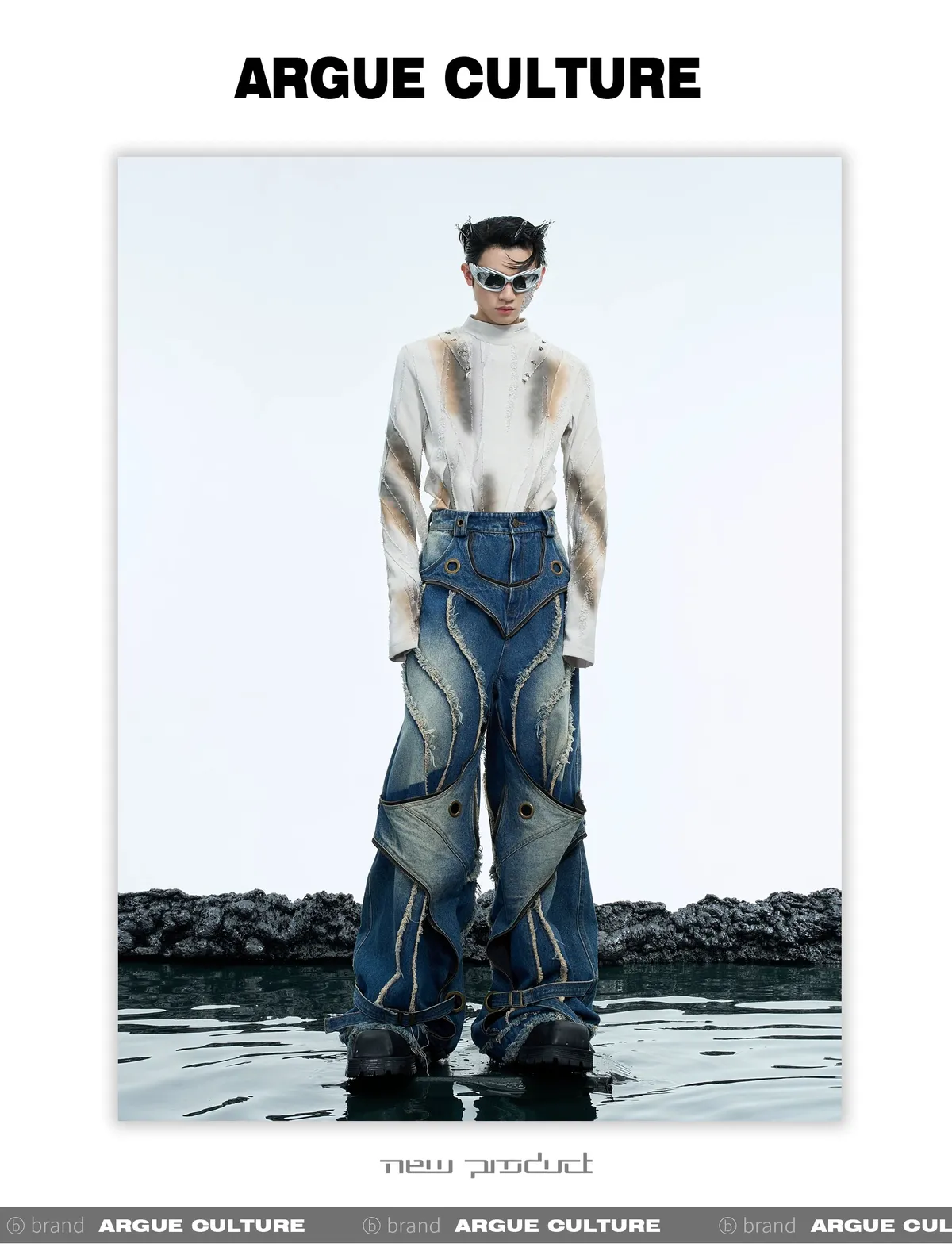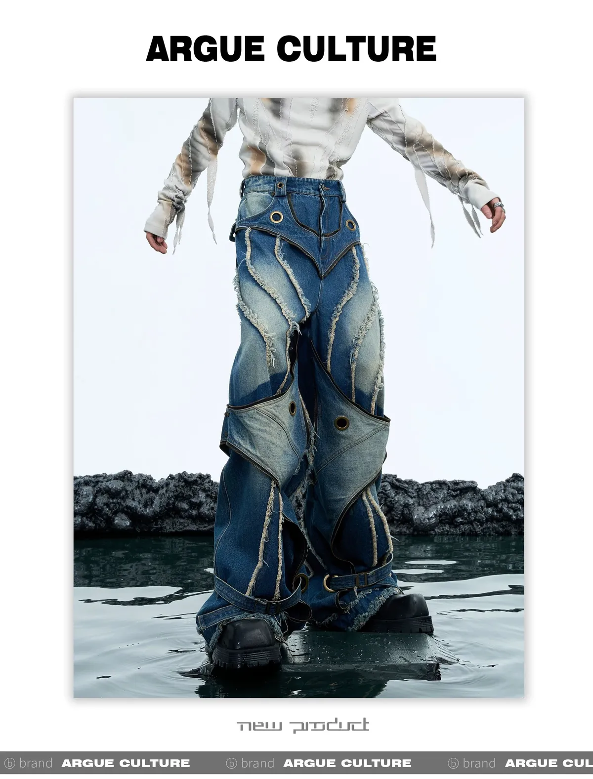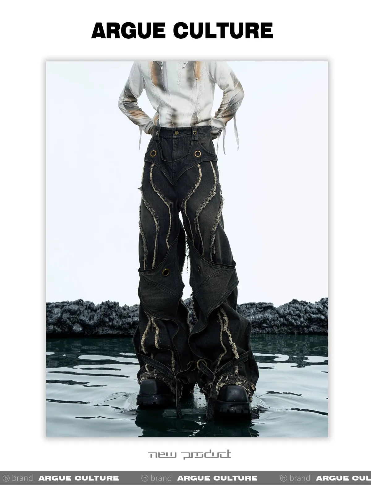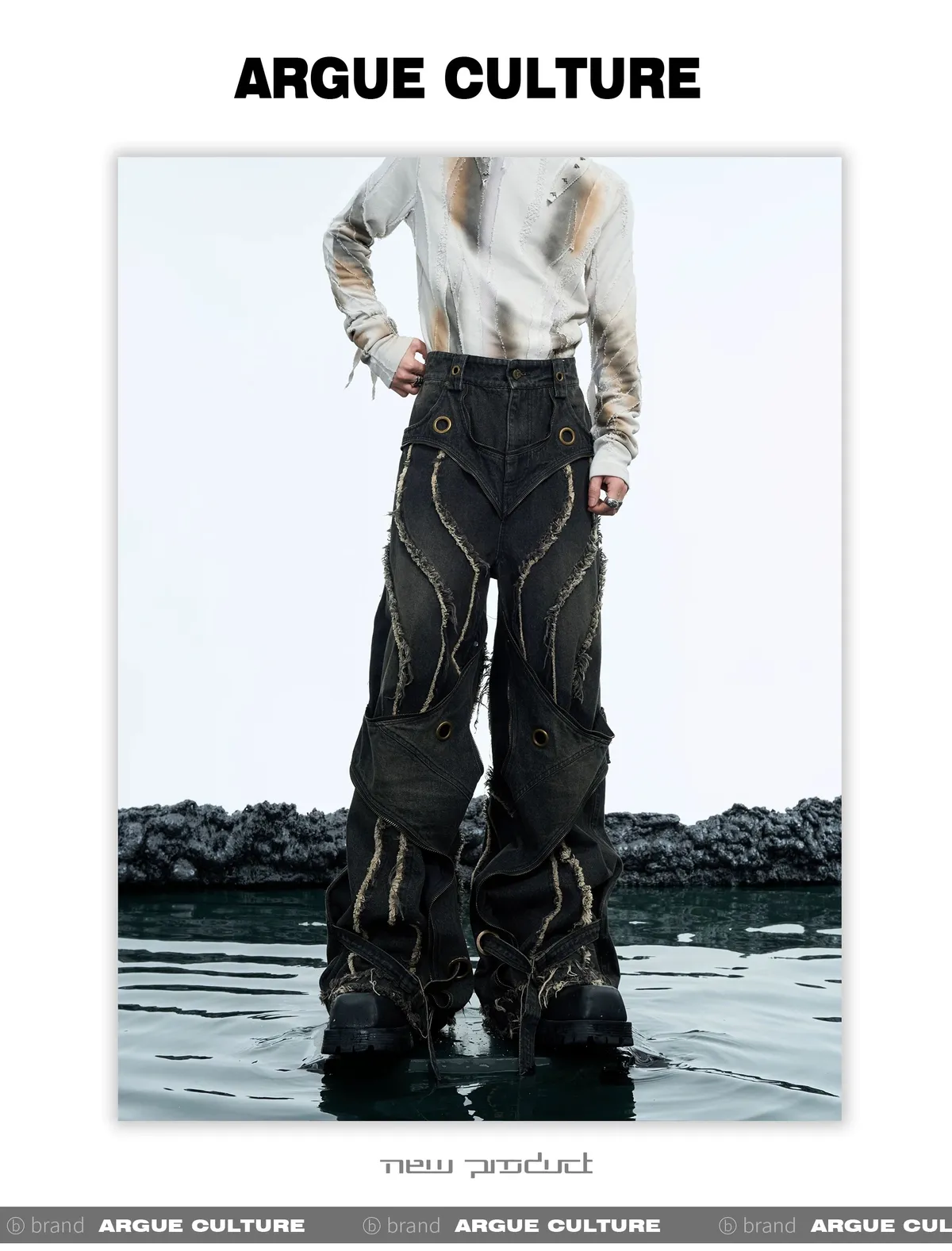 ARGUE 雙層結構 拼接 抽鬚 牛仔褲(黑/藍)