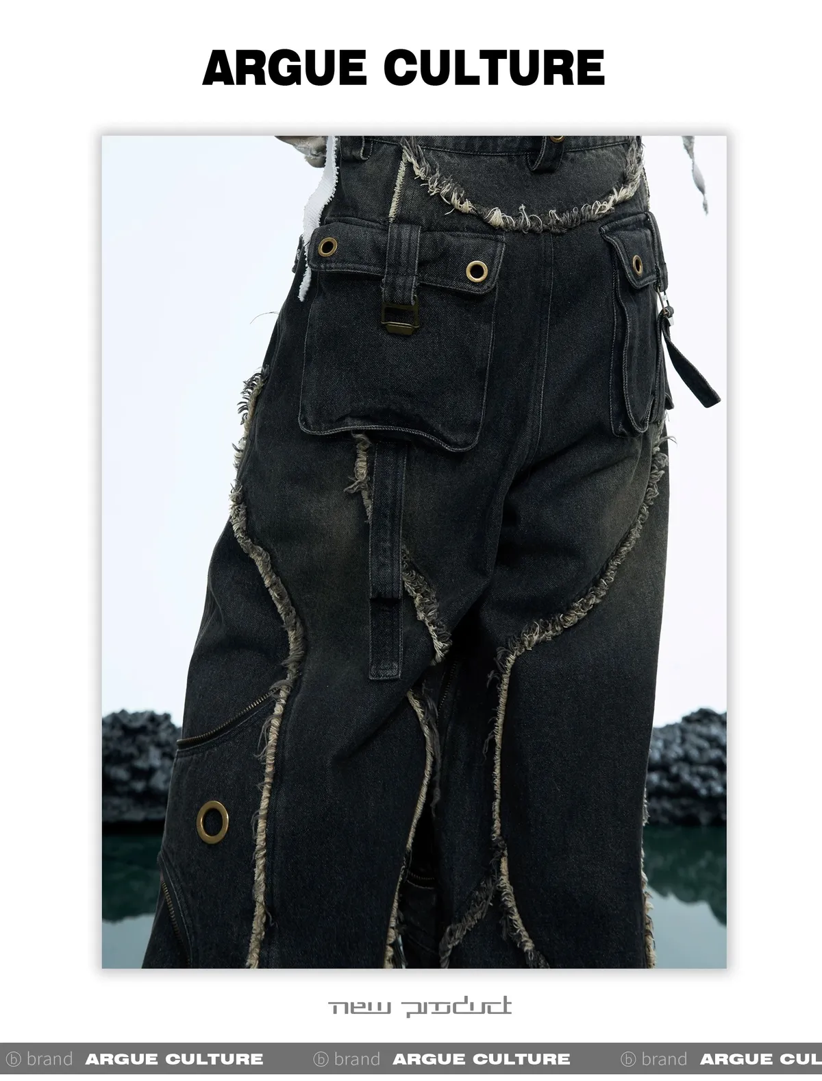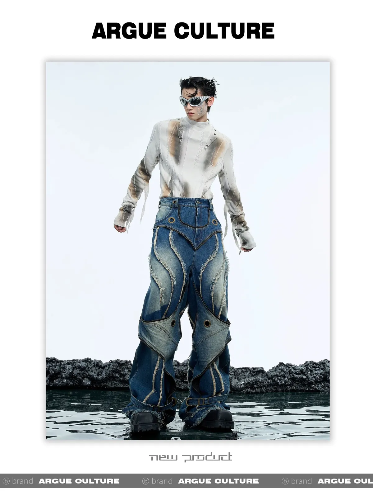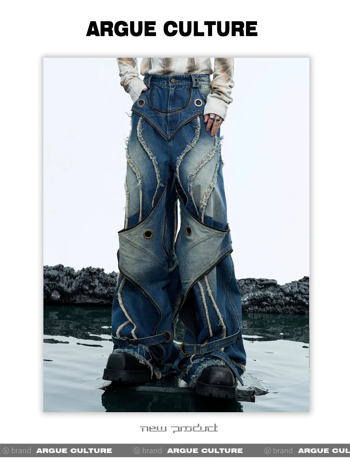 ARGUE 雙層結構 拼接 抽鬚 牛仔褲(黑/藍)
