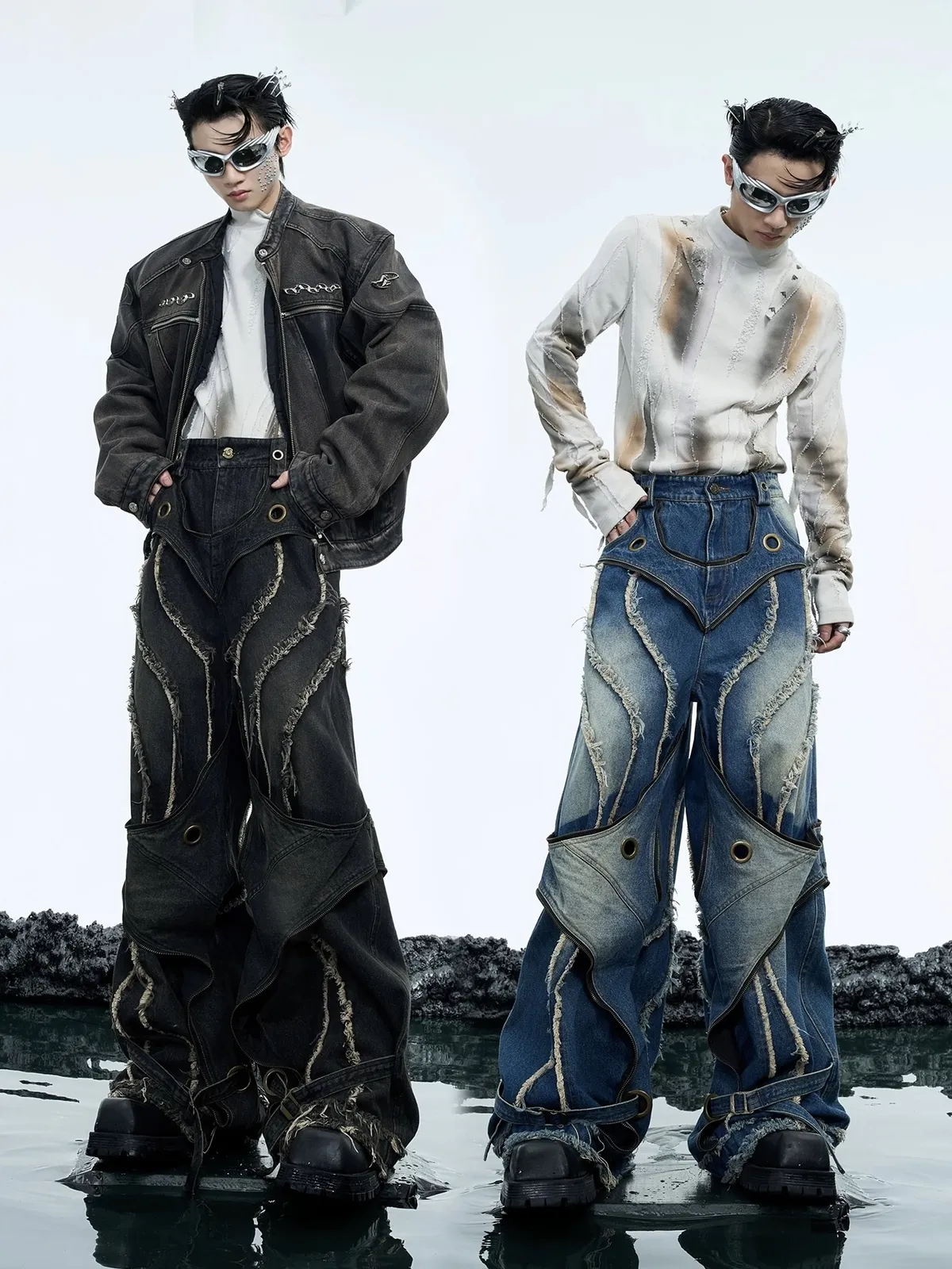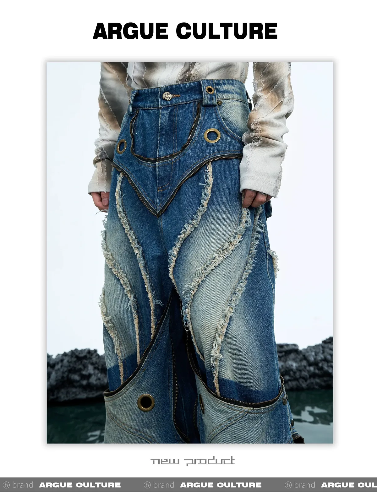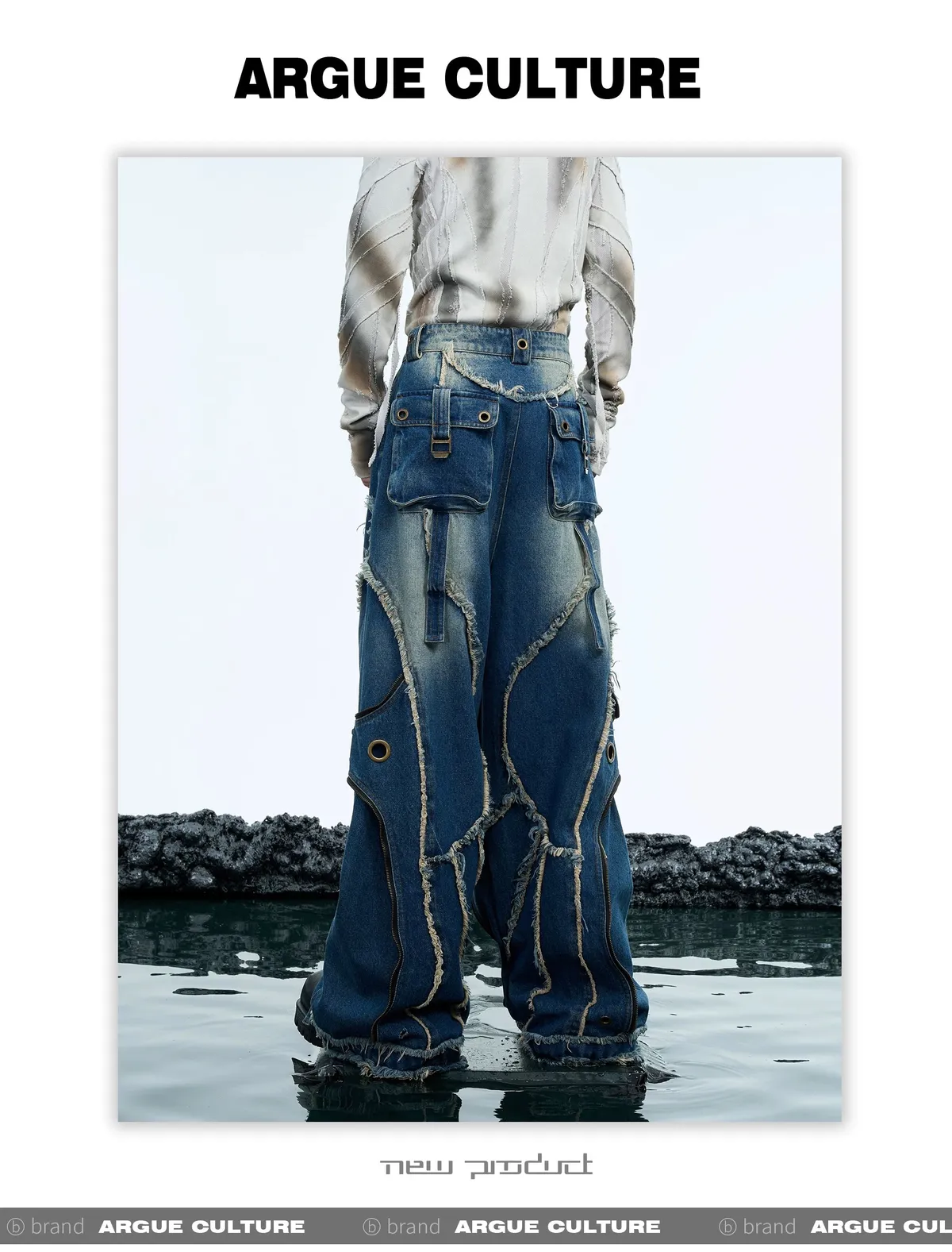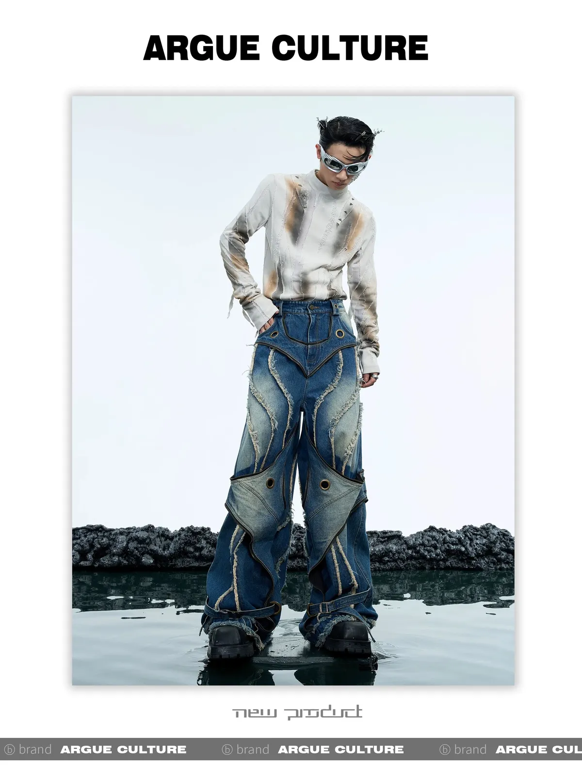 ARGUE 雙層結構 拼接 抽鬚 牛仔褲(黑/藍)