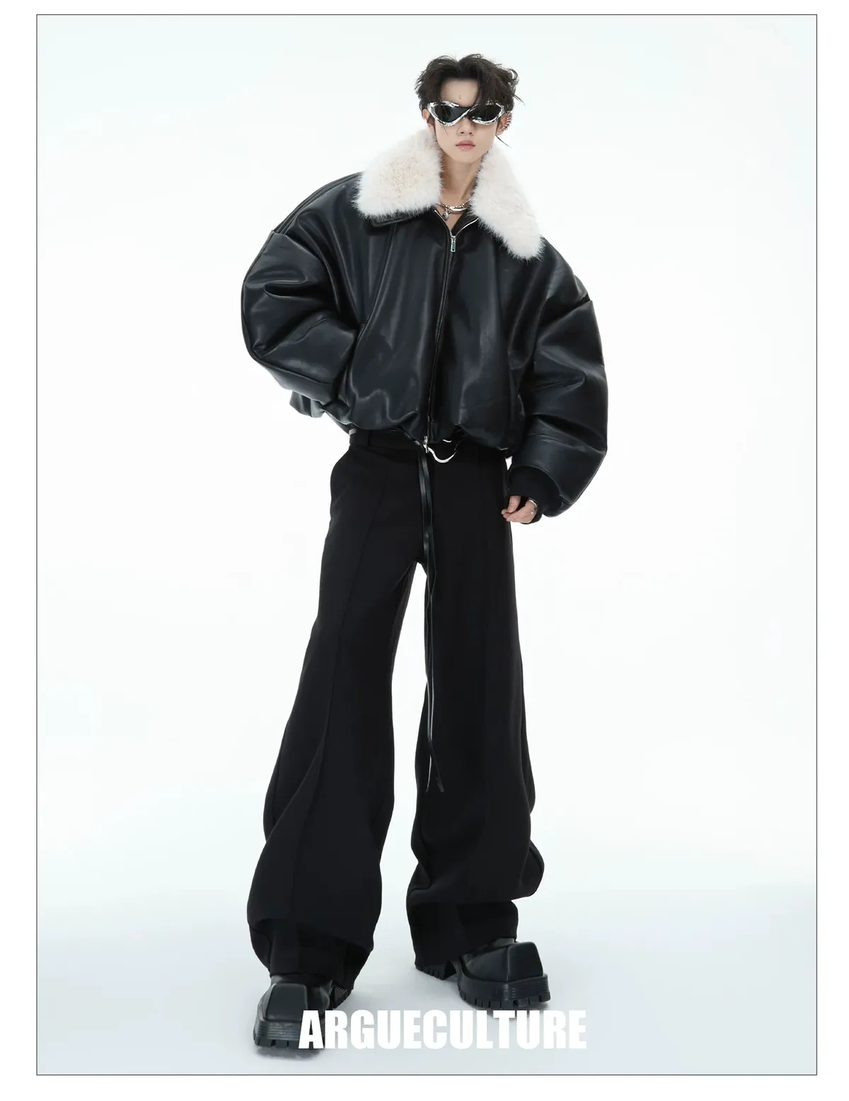 ARGUE 盔甲區塊感 皮革拼接 闊腿 牛仔褲(黑色)