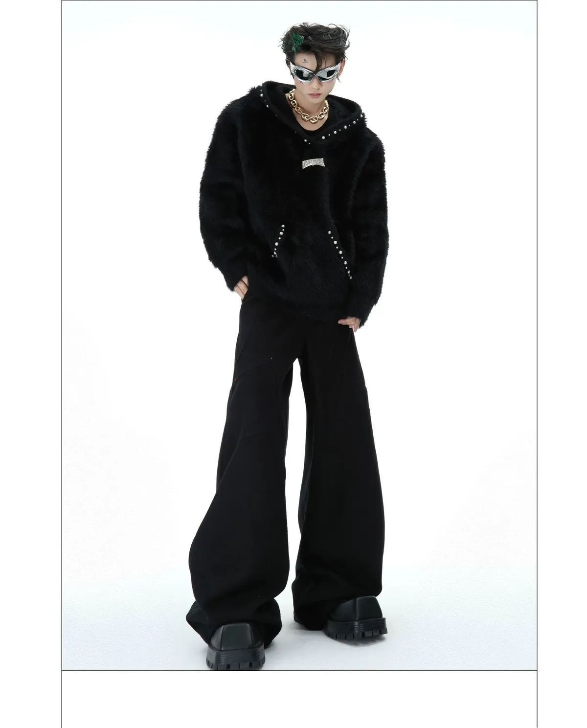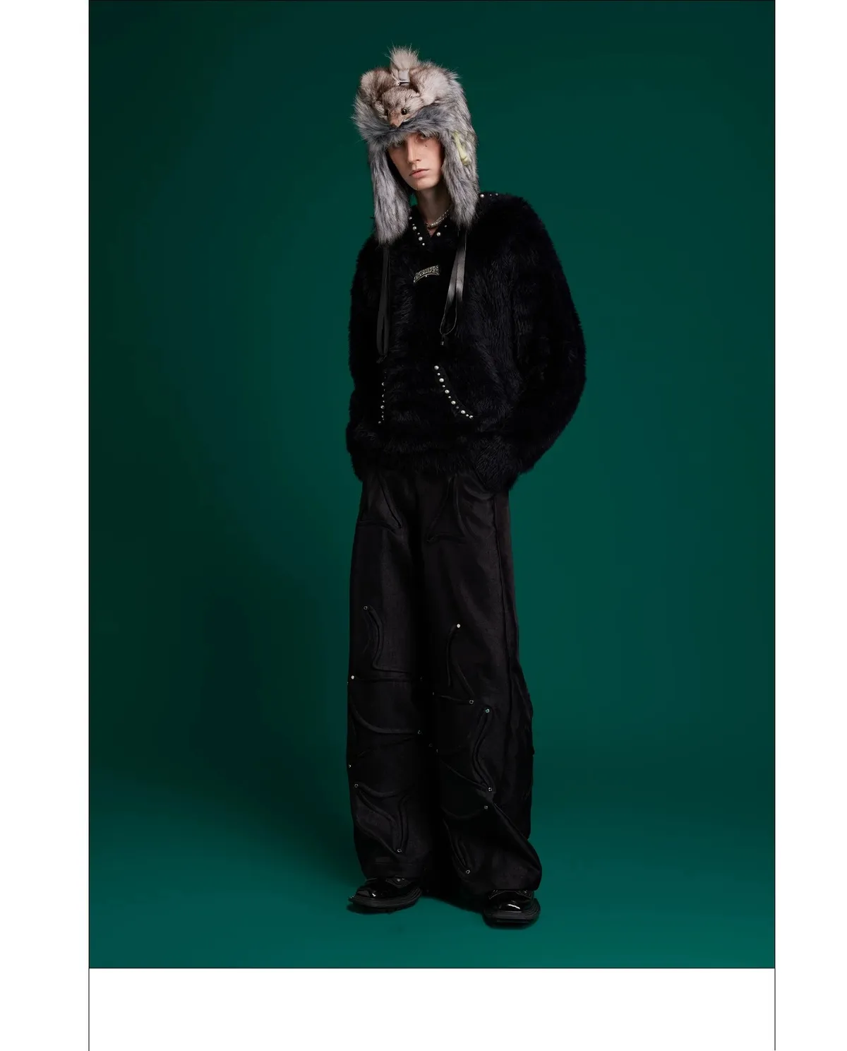 ARGUE 盔甲區塊感 皮革拼接 闊腿 牛仔褲(黑色)