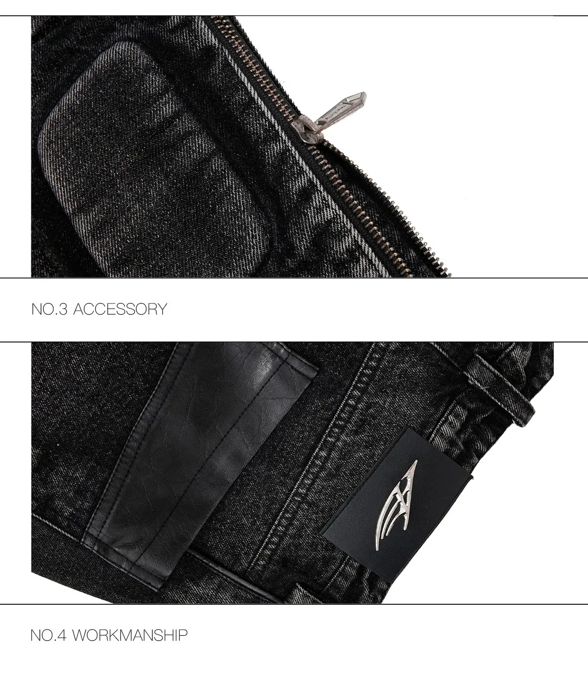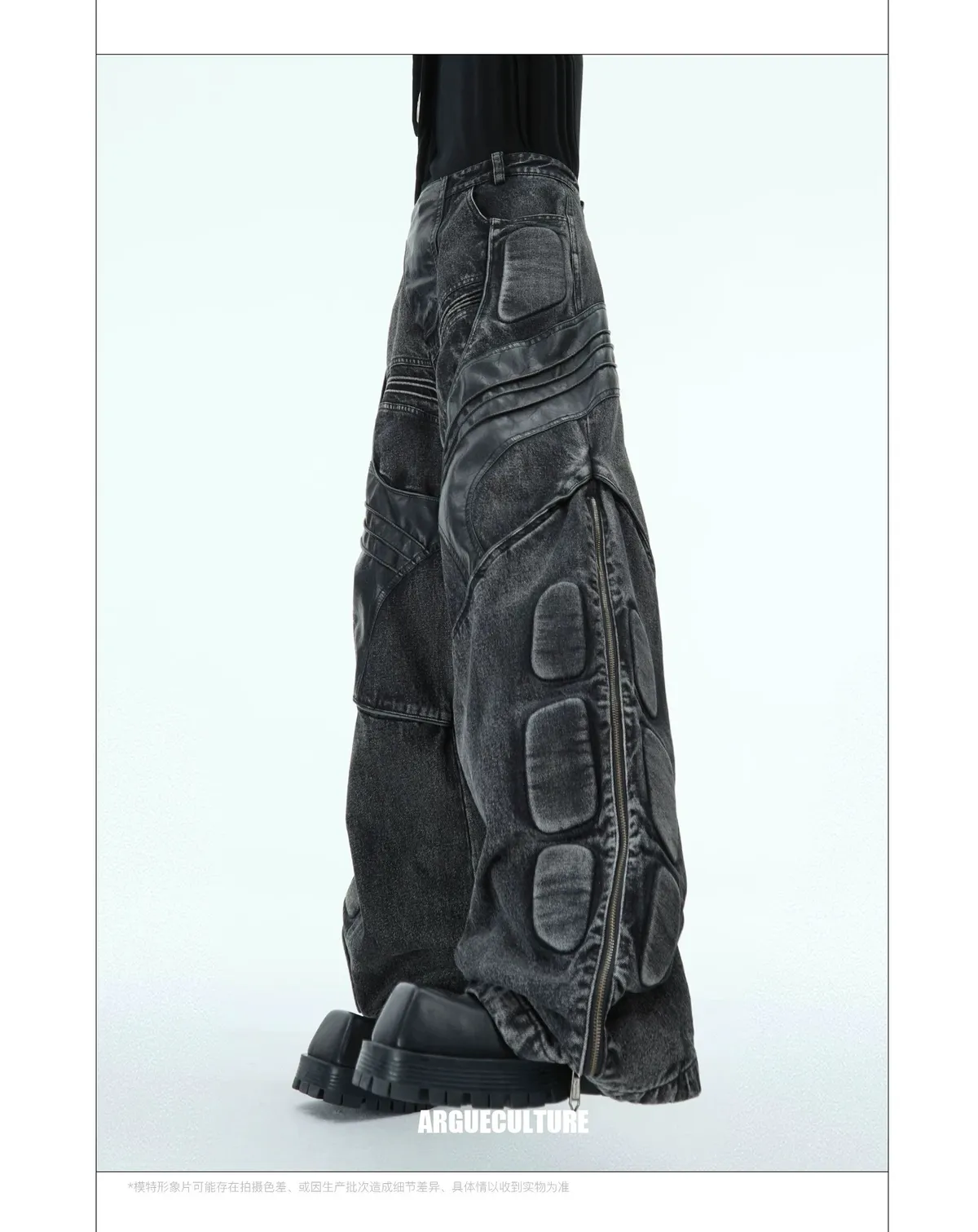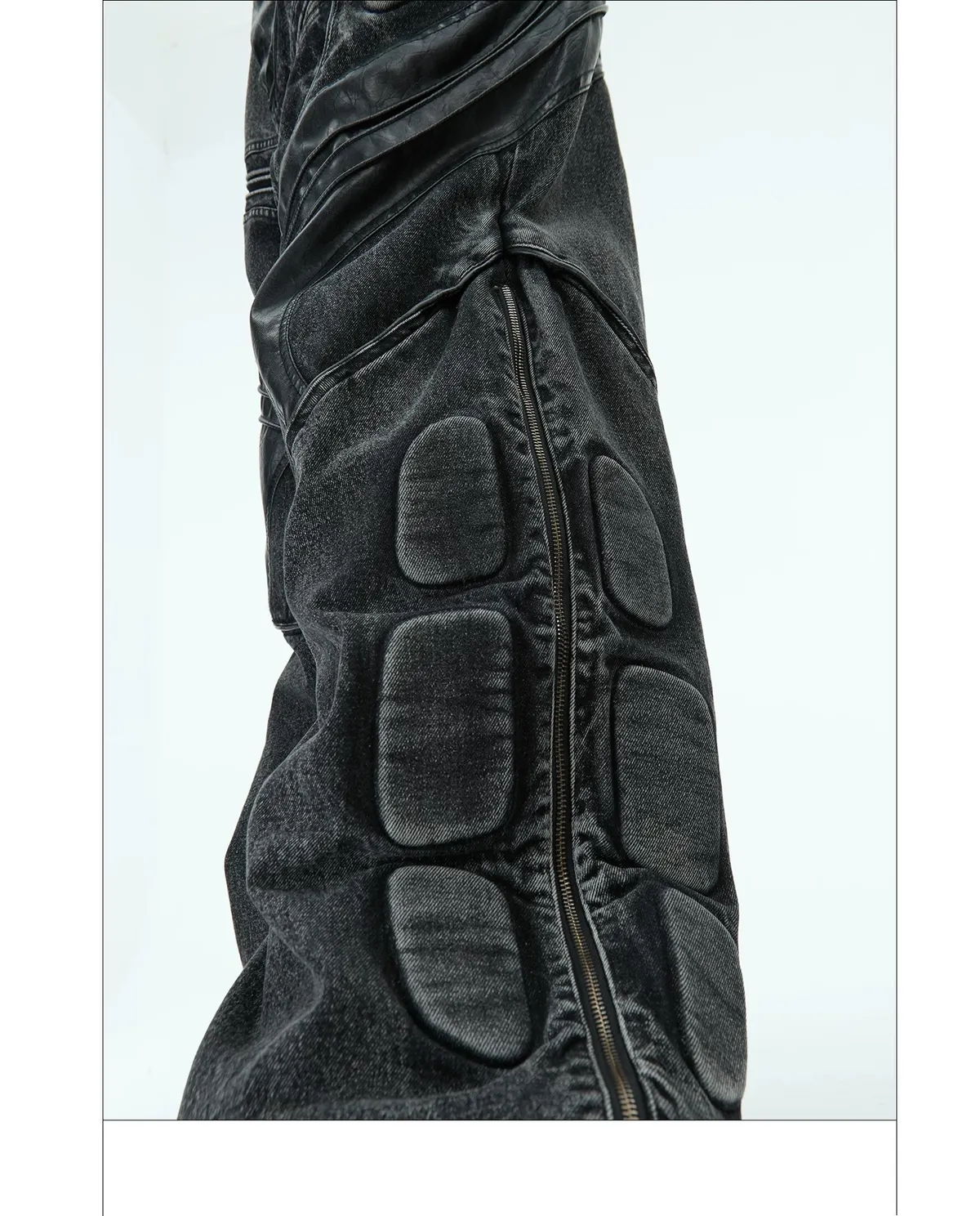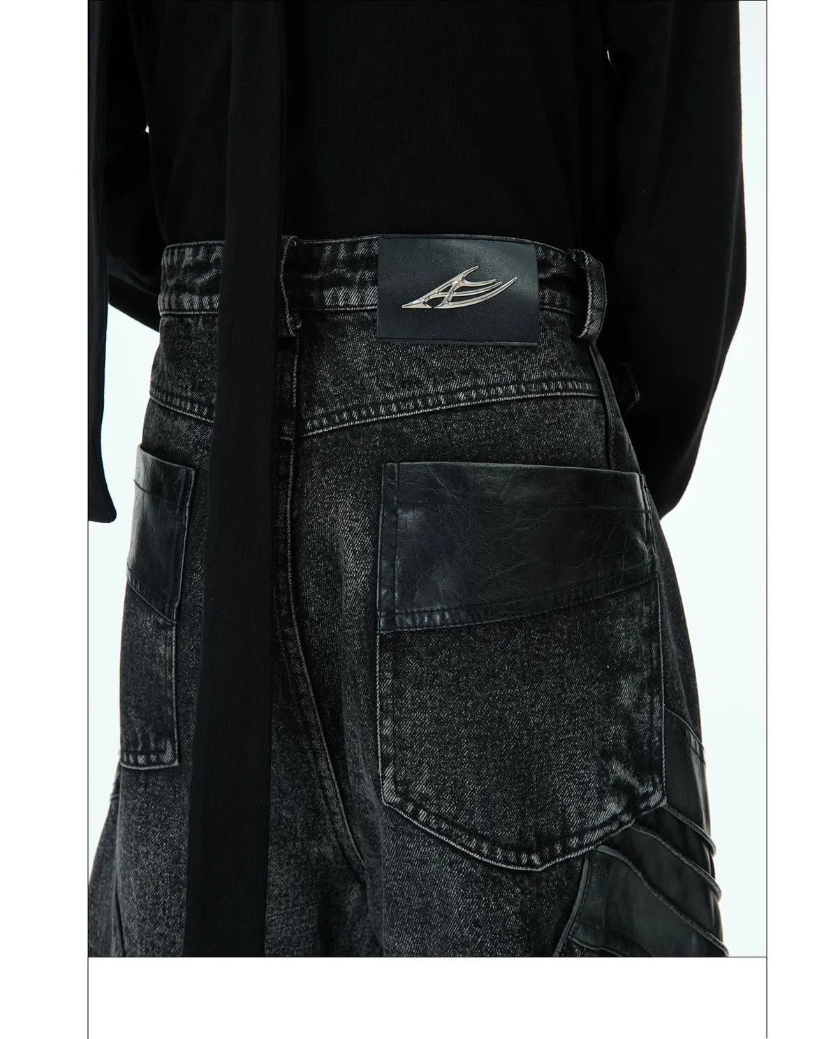 ARGUE 盔甲區塊感 皮革拼接 闊腿 牛仔褲(黑色)