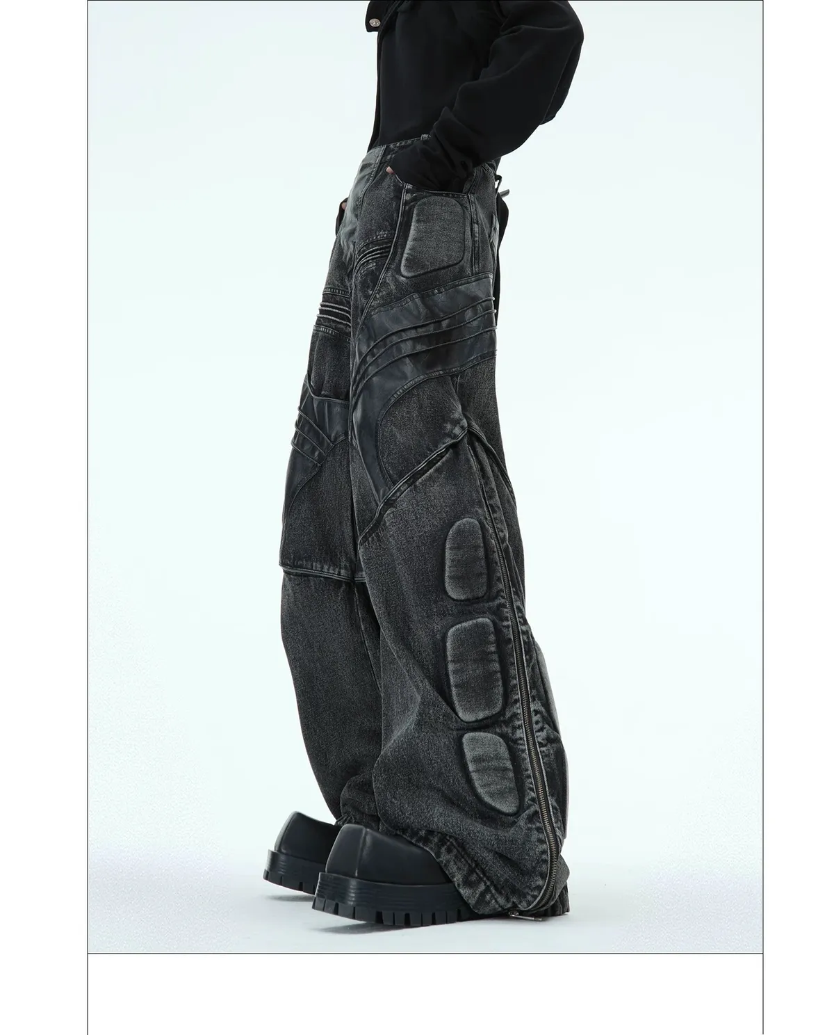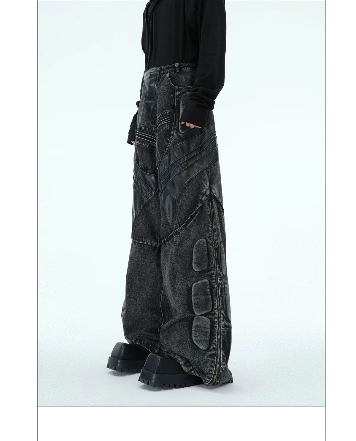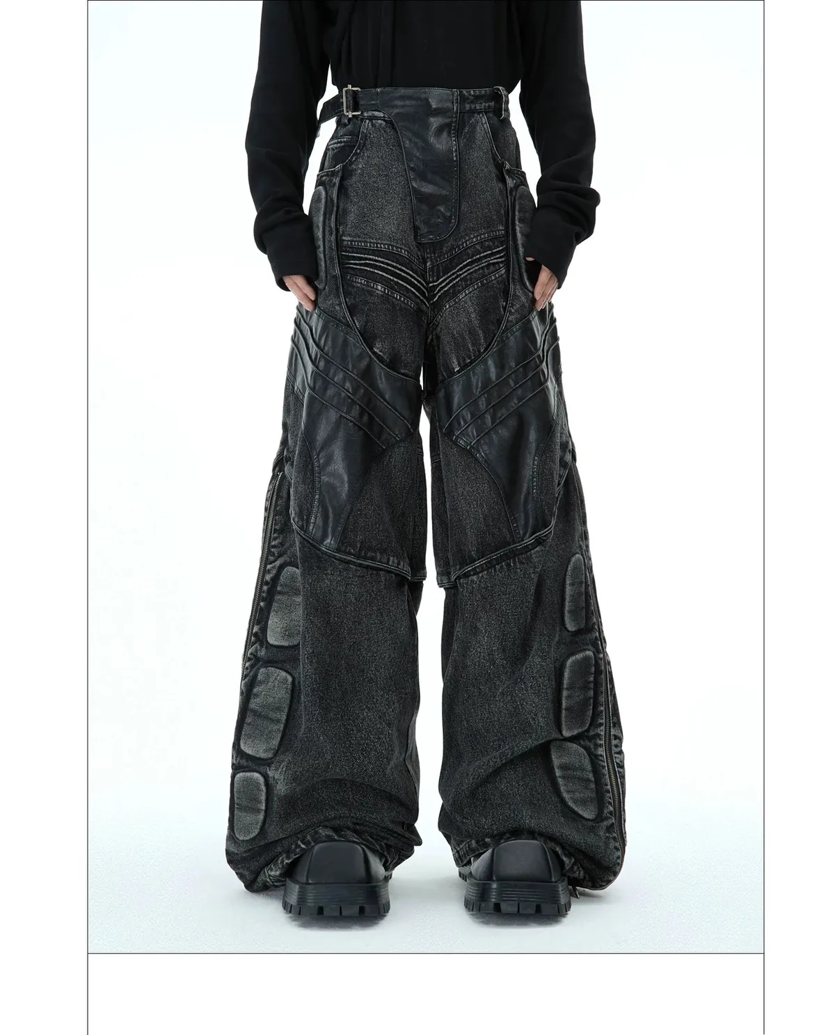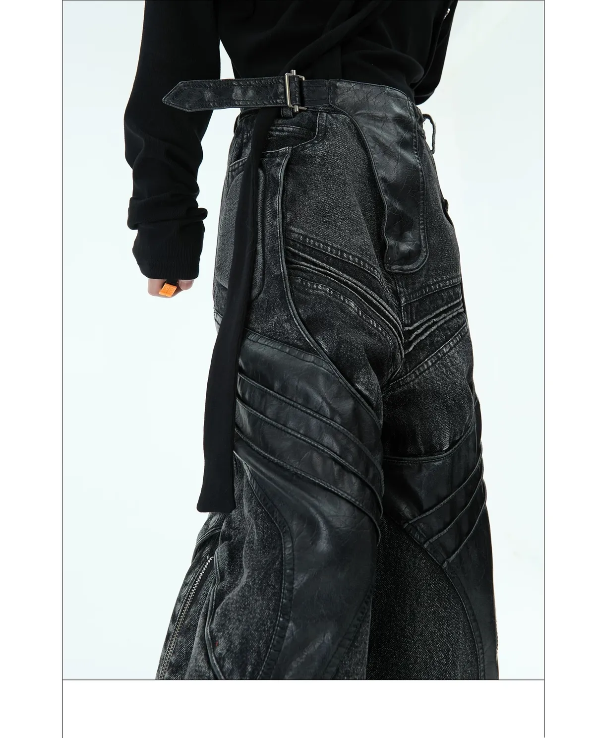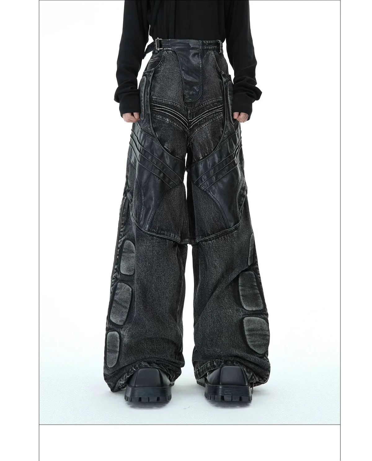ARGUE 盔甲區塊感 皮革拼接 闊腿 牛仔褲(黑色)
