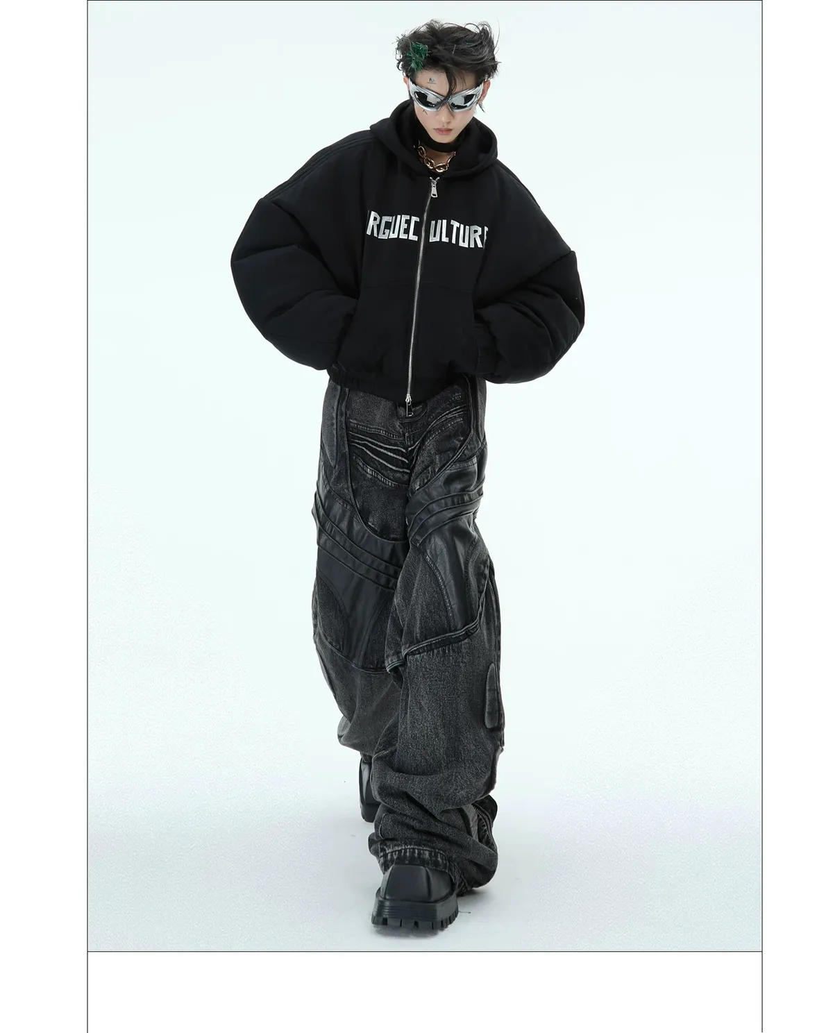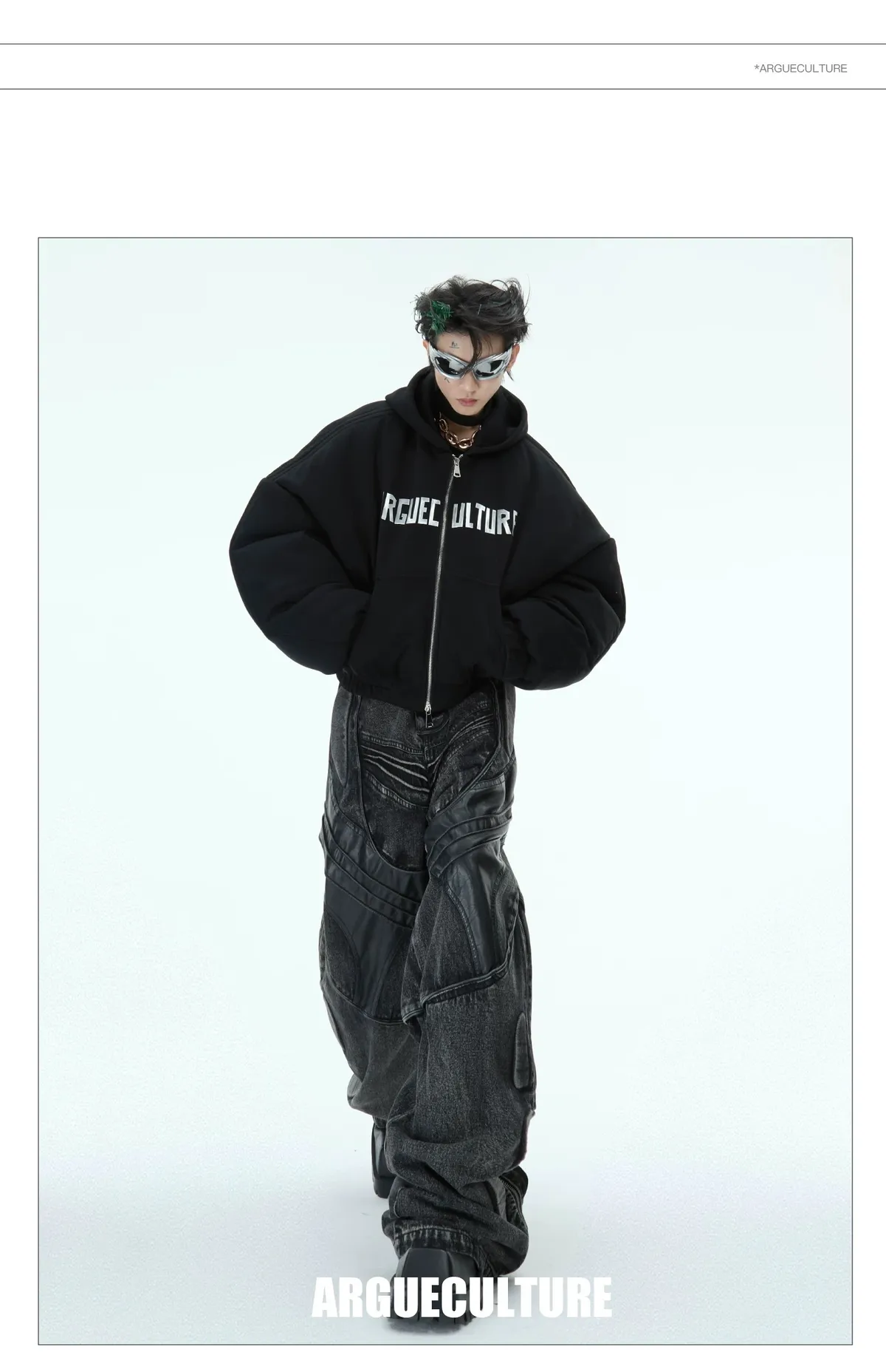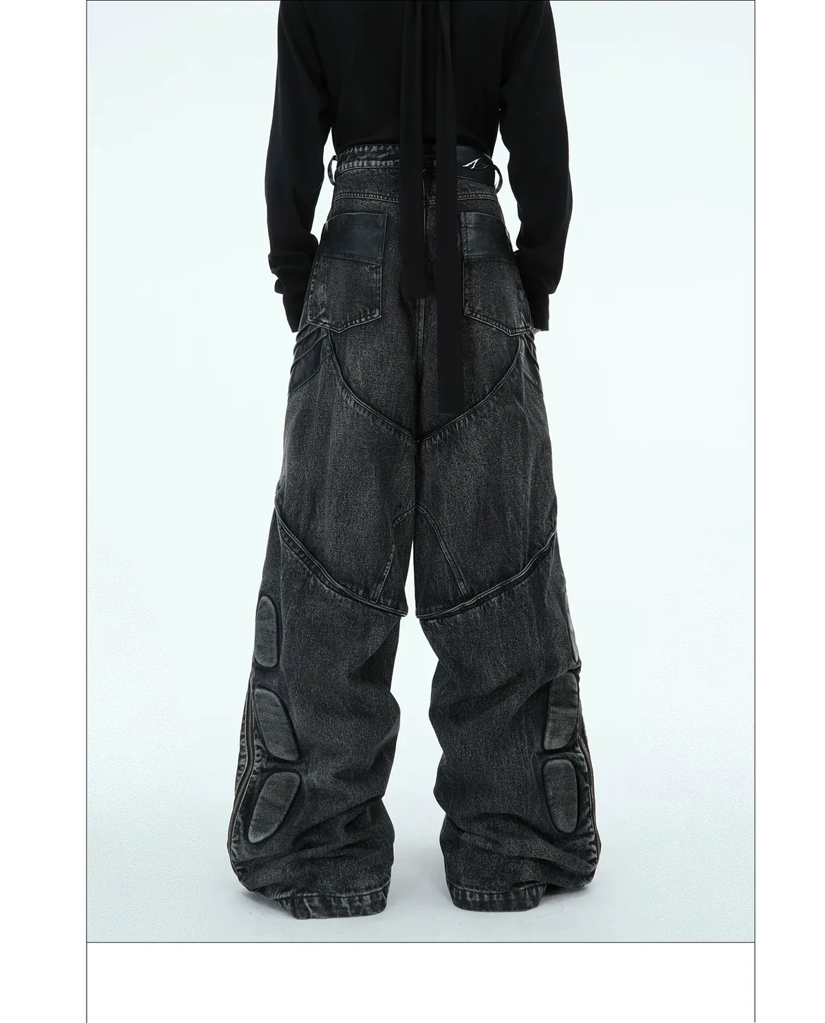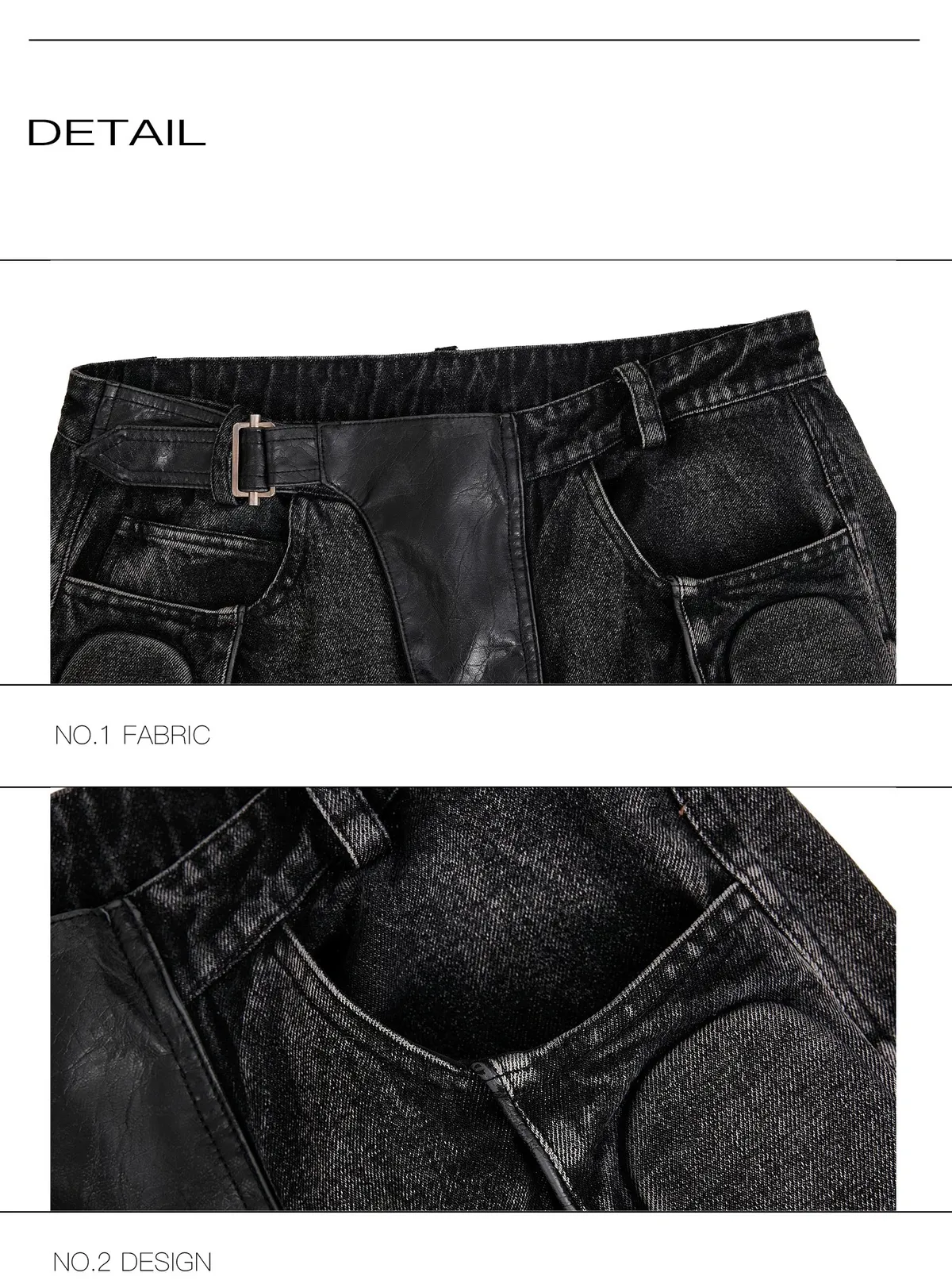 ARGUE 盔甲區塊感 皮革拼接 闊腿 牛仔褲(黑色)