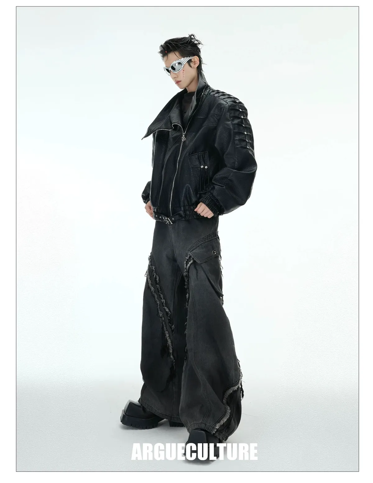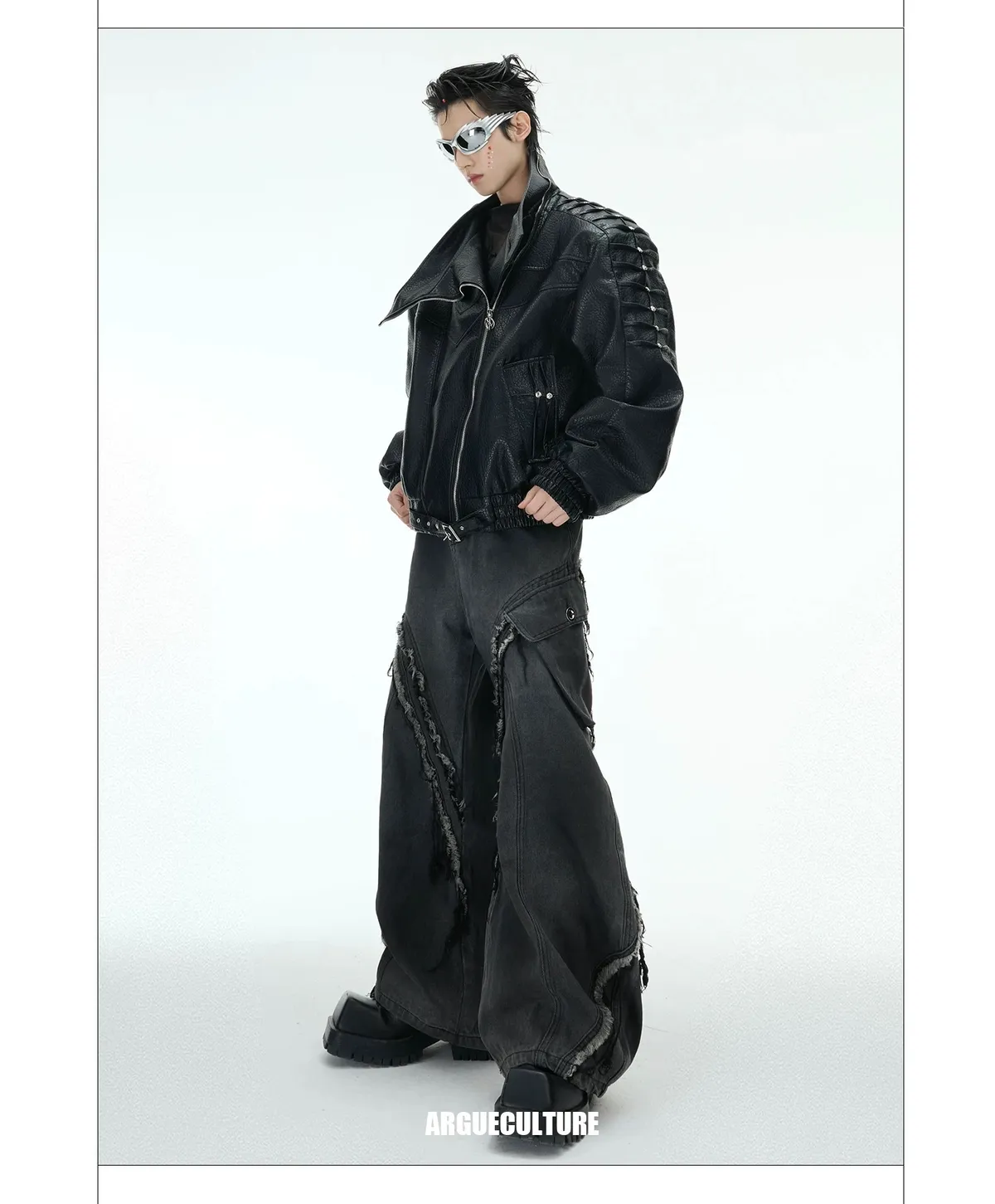 ARGUE 盔甲區塊感 皮革拼接 闊腿 牛仔褲(黑色)