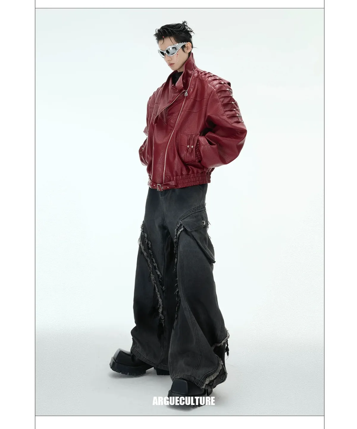 ARGUE 分割脊椎 壓褶 皮革 外套(黑/紅)