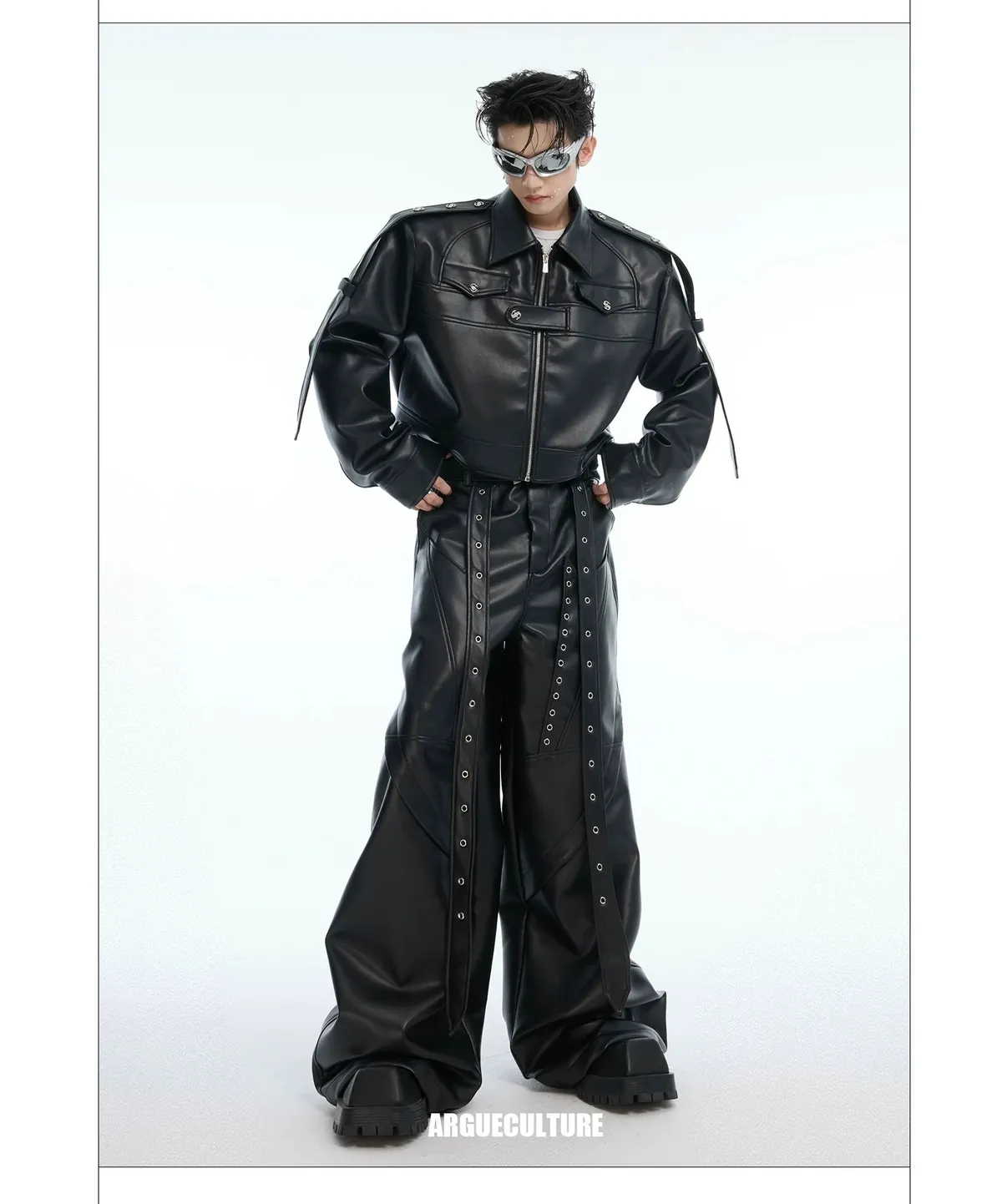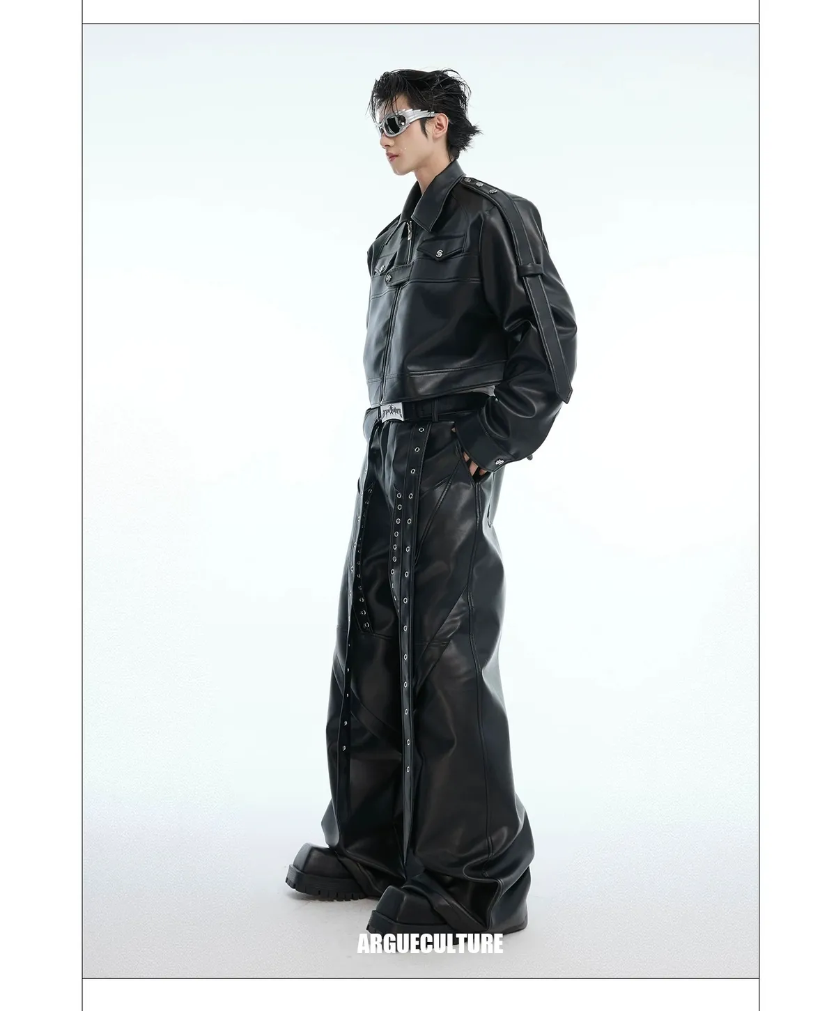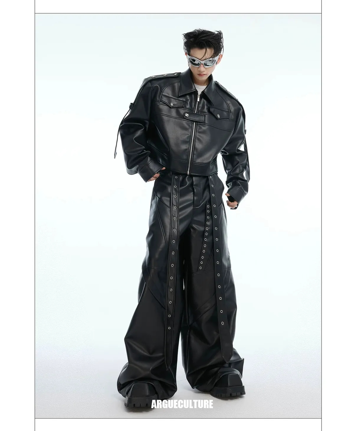 ARGUE 金屬拼接 飄帶 闊腿 皮褲 長褲(黑色)
