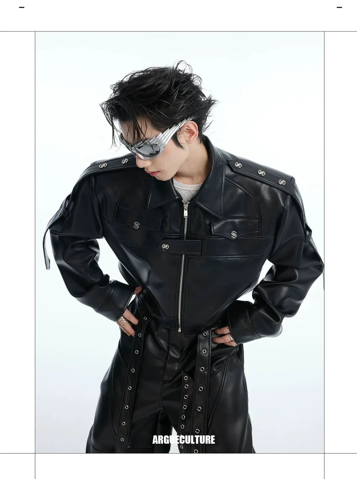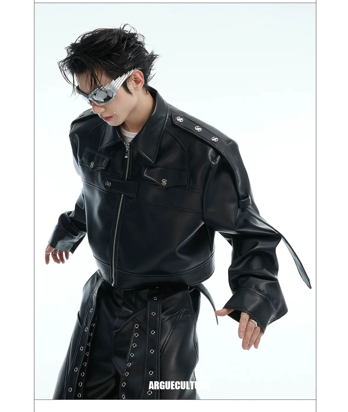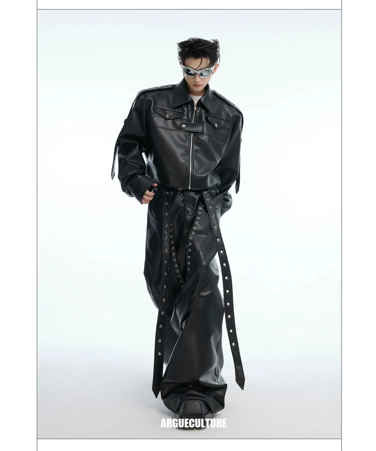 ARGUE 金屬拼接 飄帶 短版廓形 皮外套(黑色)
