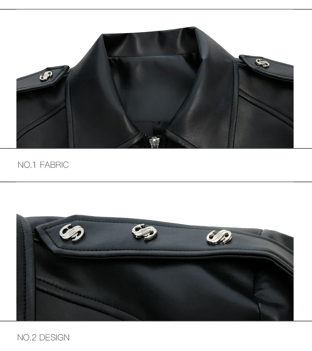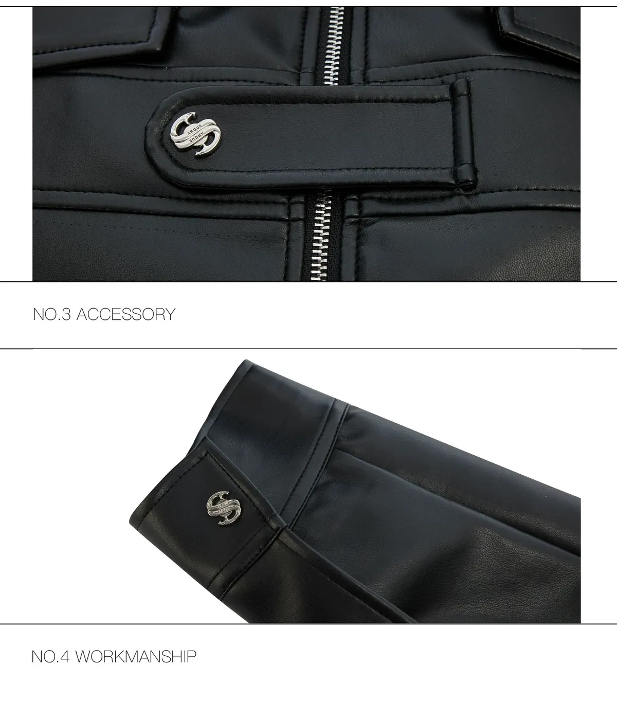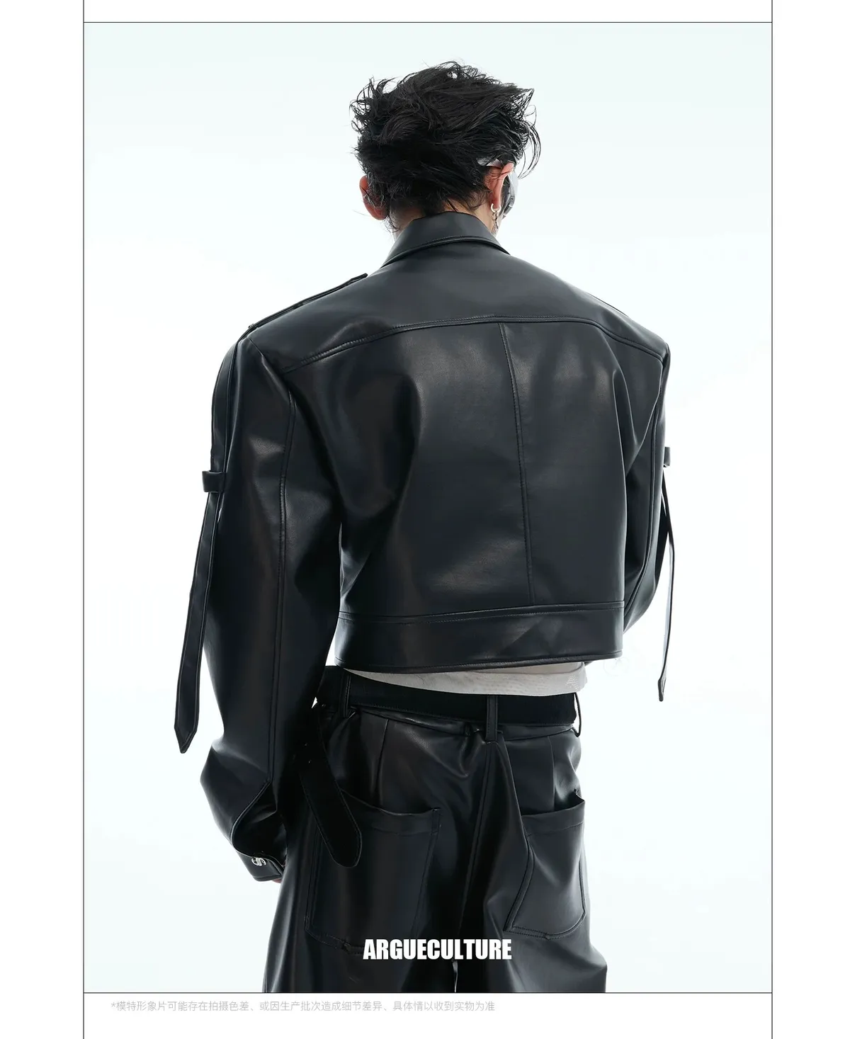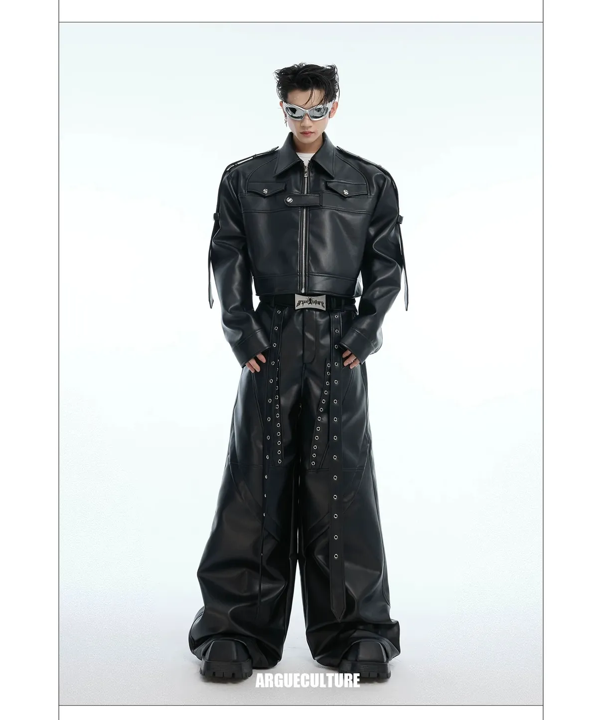ARGUE 金屬拼接 飄帶 短版廓形 皮外套(黑色)