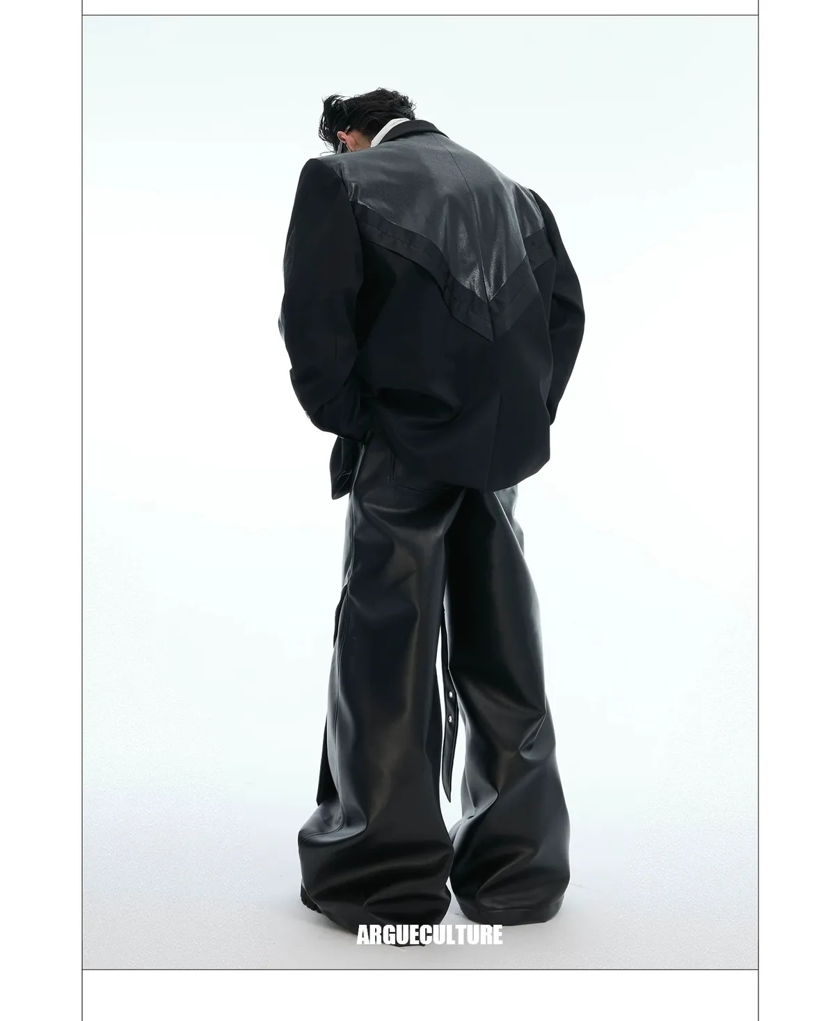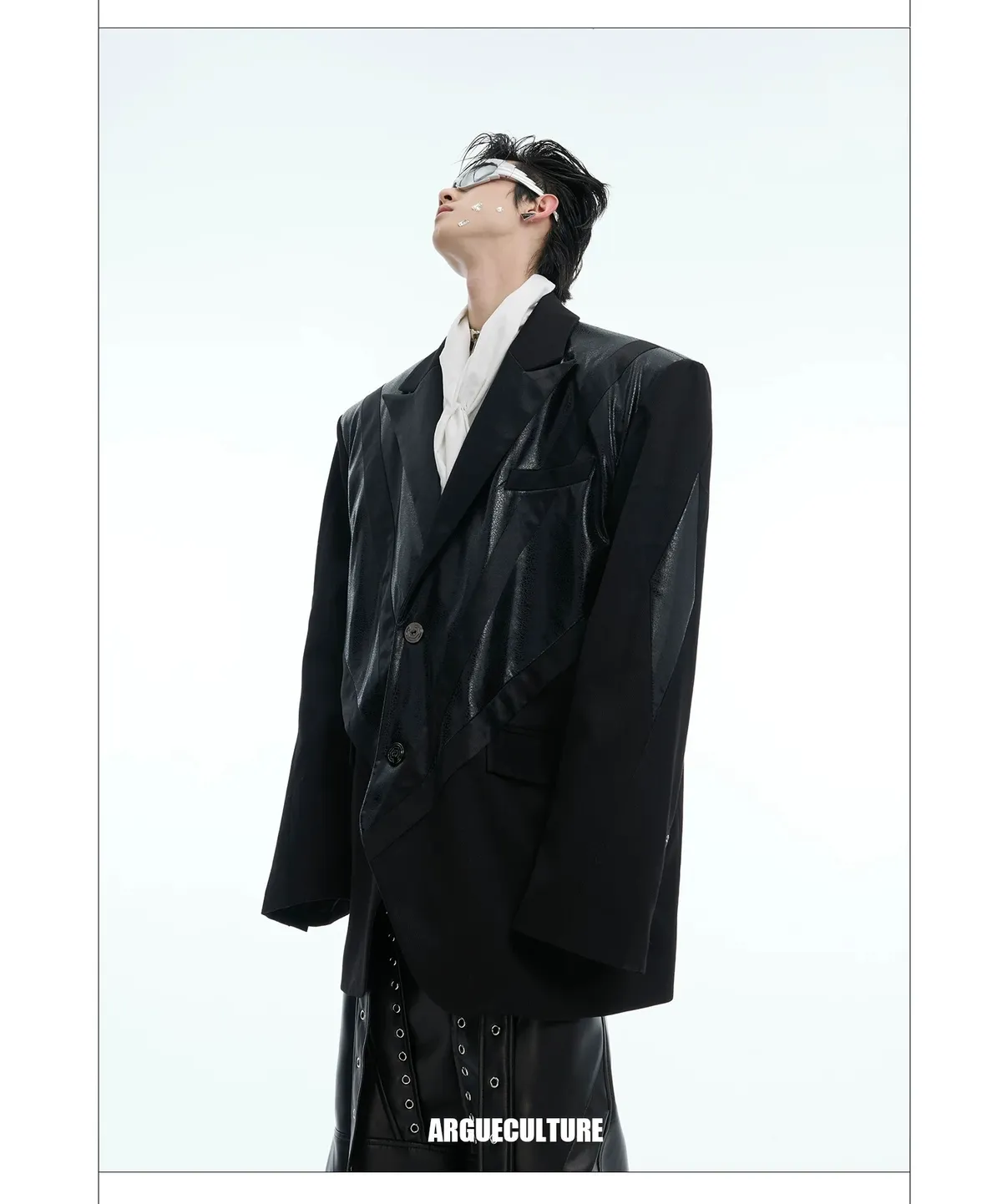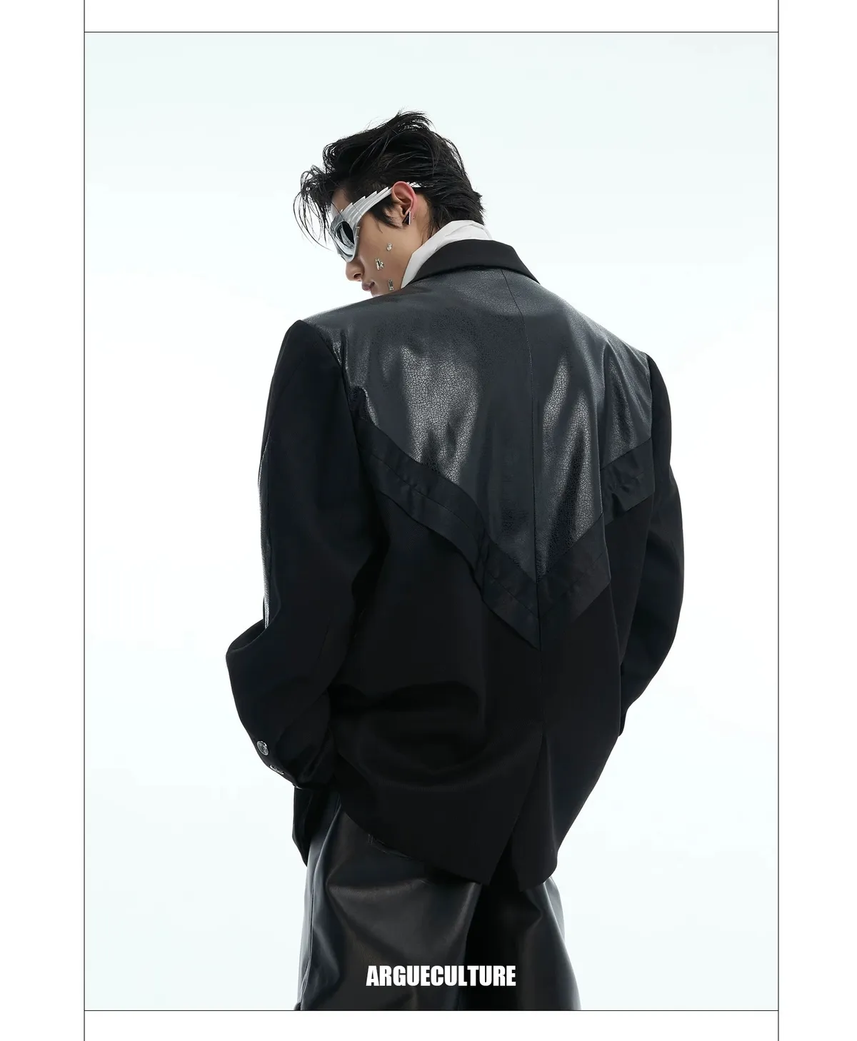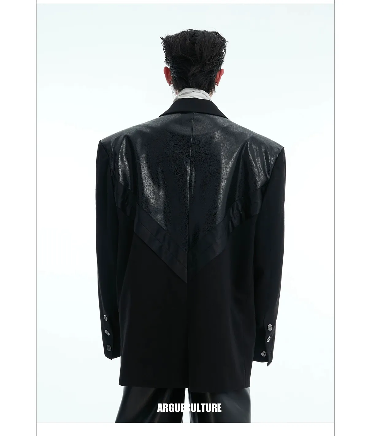 ARGUE 皮革拼接 大廓形 墊肩 西裝外套(黑色)