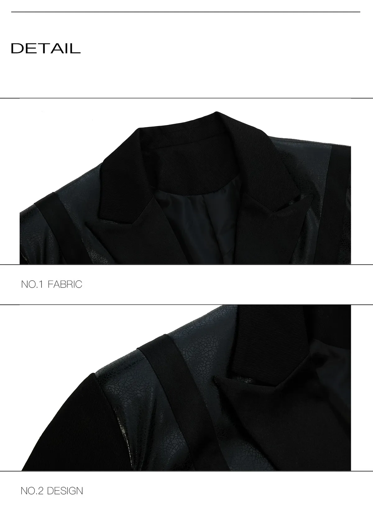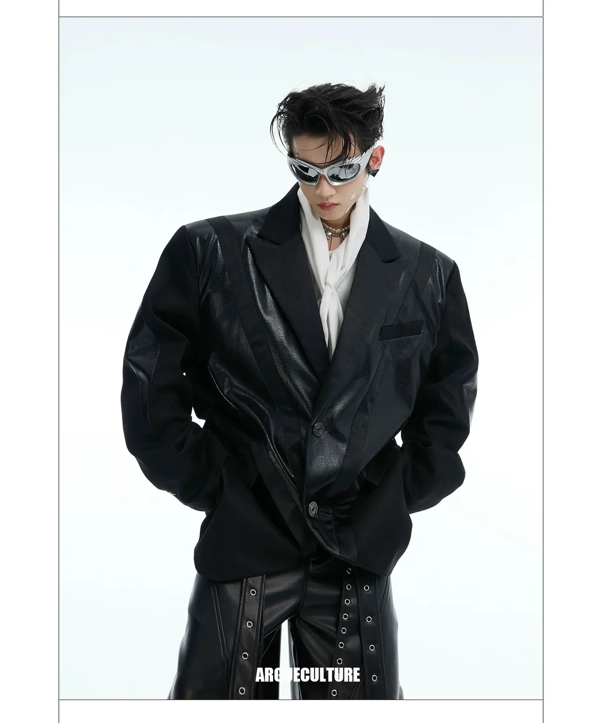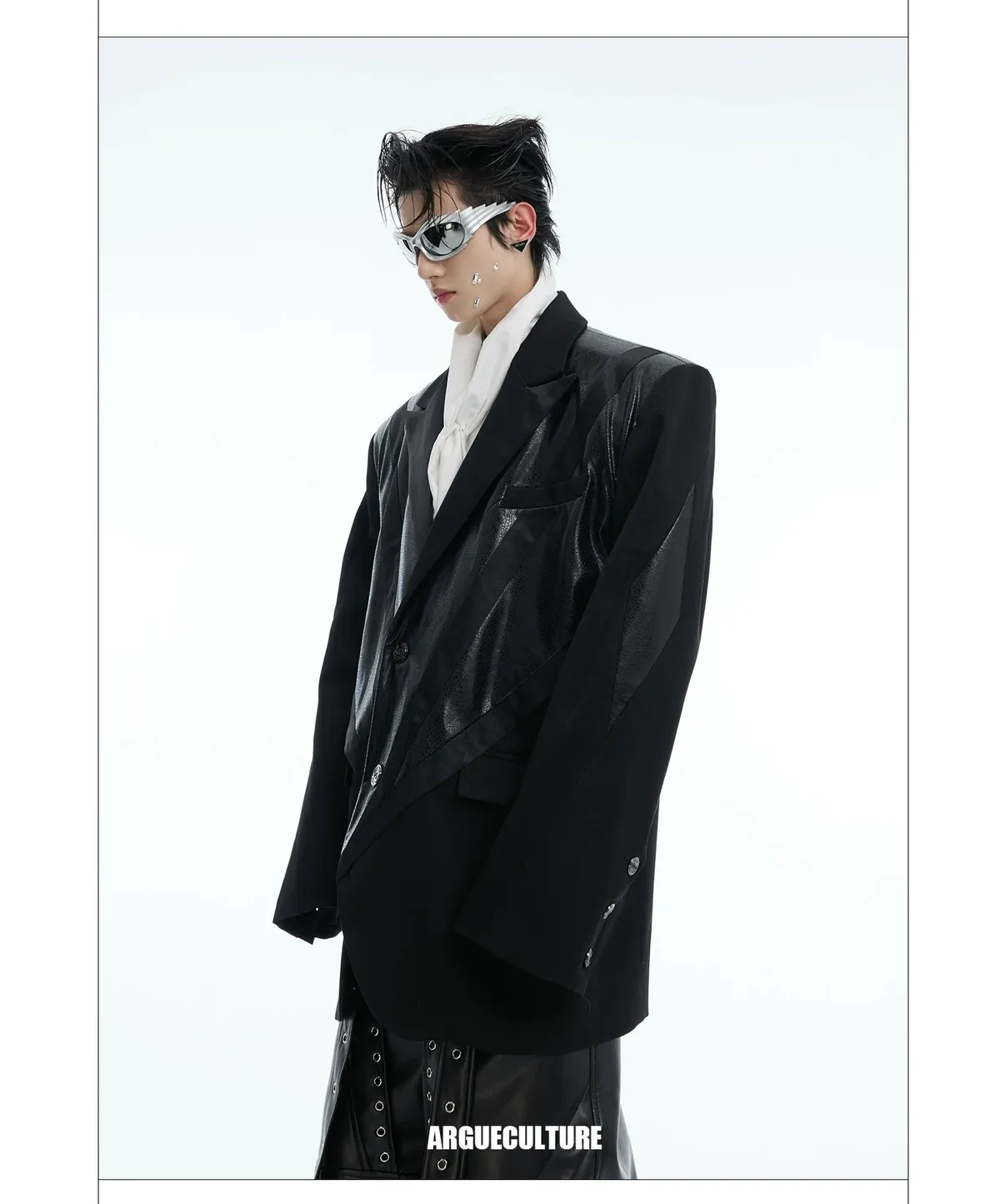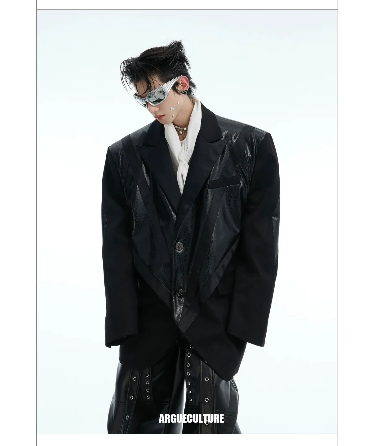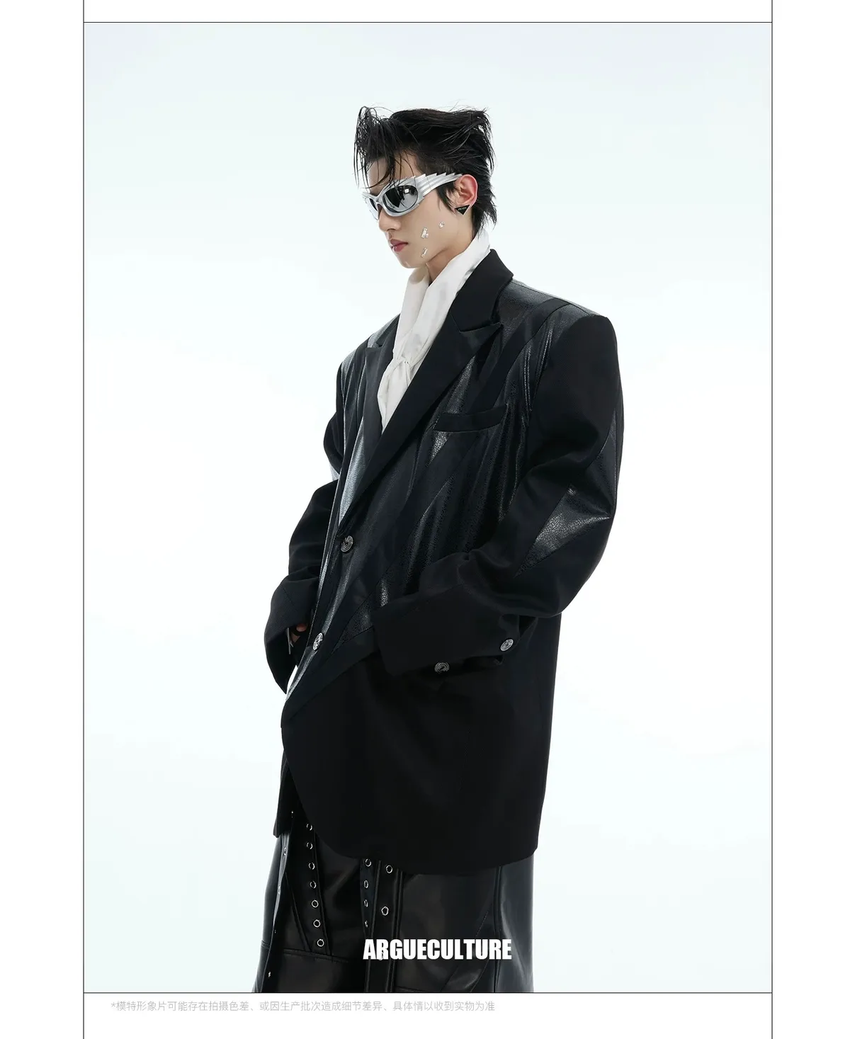 ARGUE 皮革拼接 大廓形 墊肩 西裝外套(黑色)