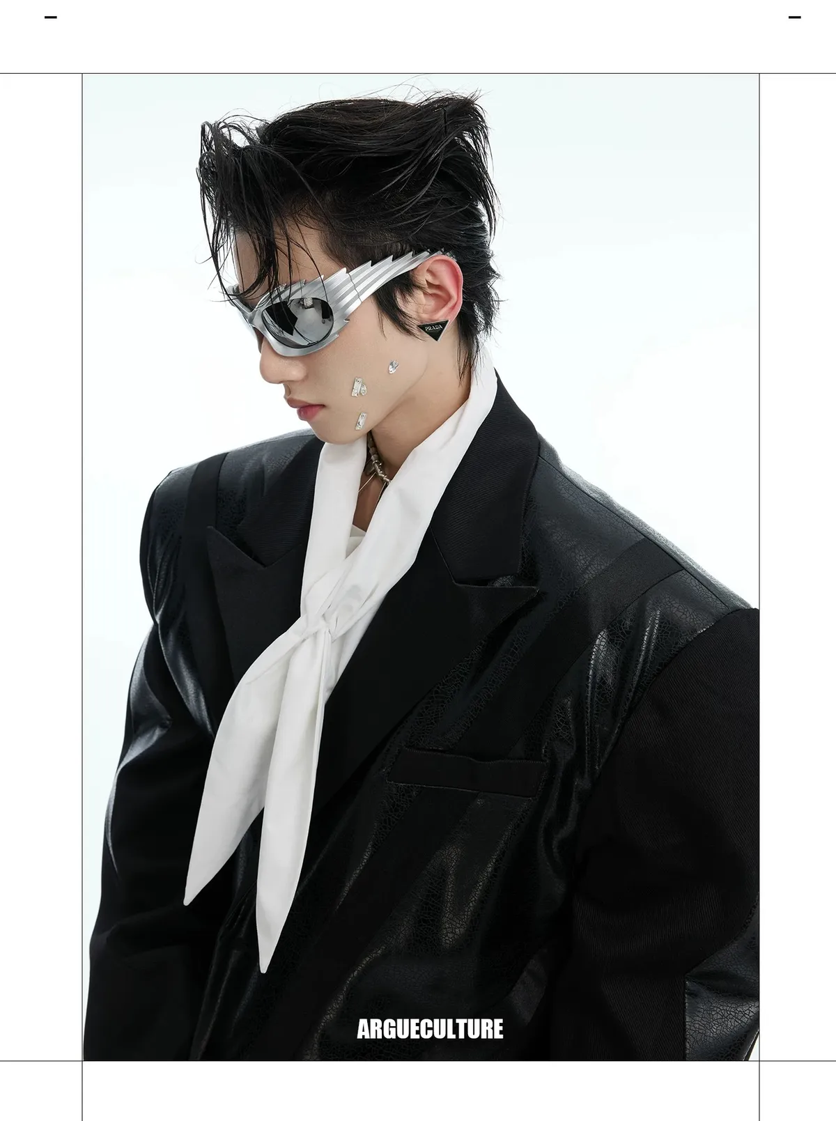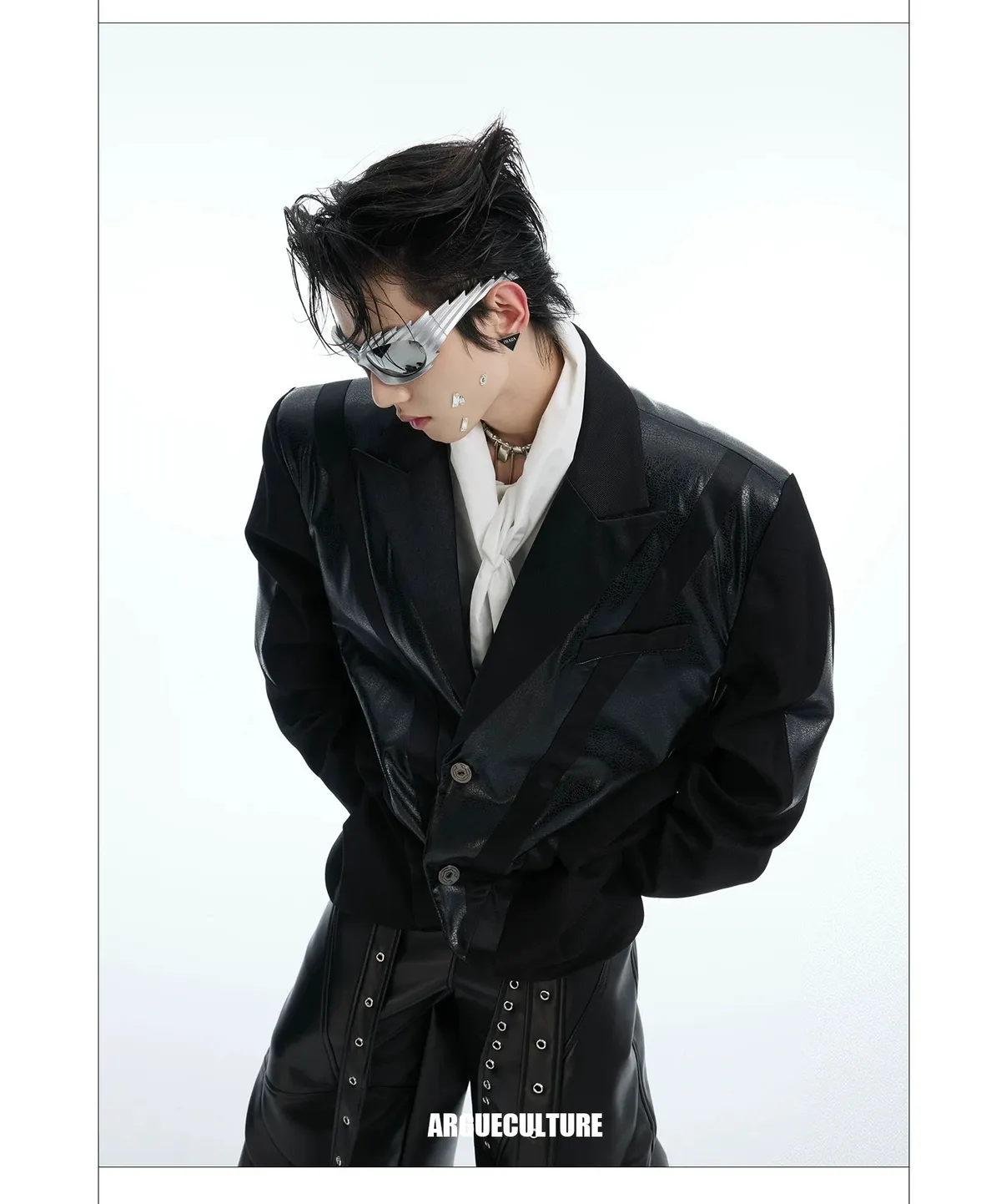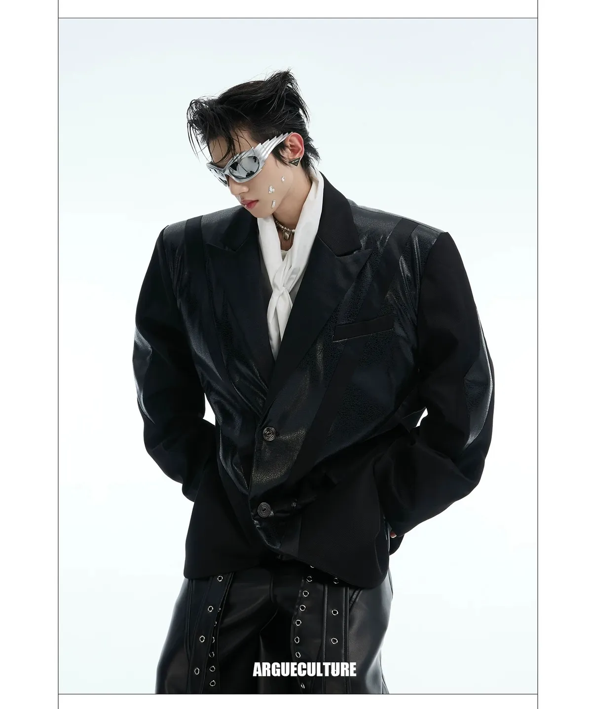 ARGUE 金屬拼接 飄帶 短版廓形 皮外套(黑色)