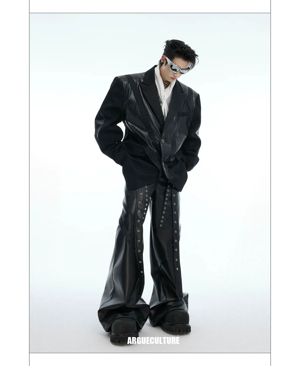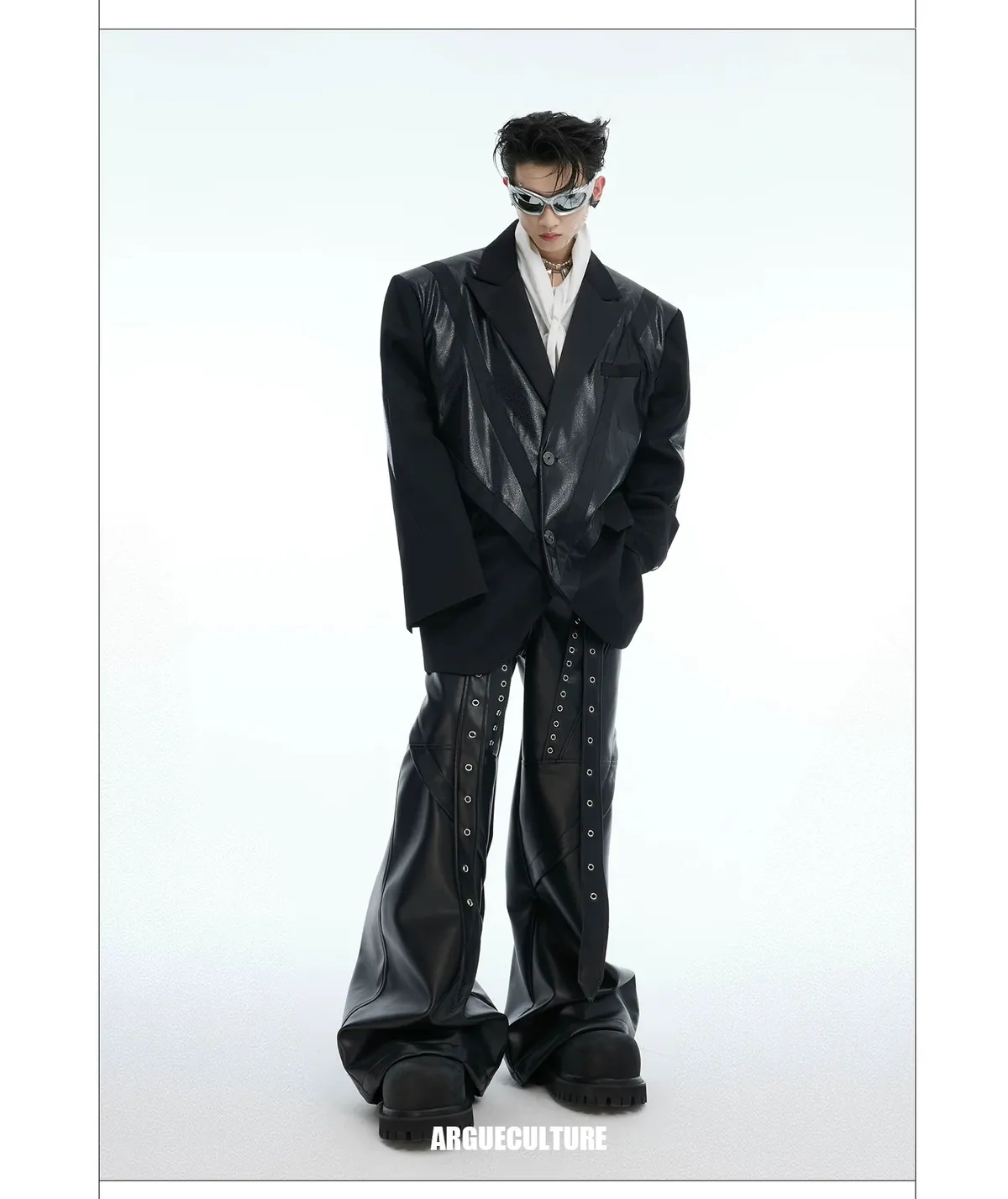 ARGUE 金屬拼接 飄帶 闊腿 皮褲 長褲(黑色)