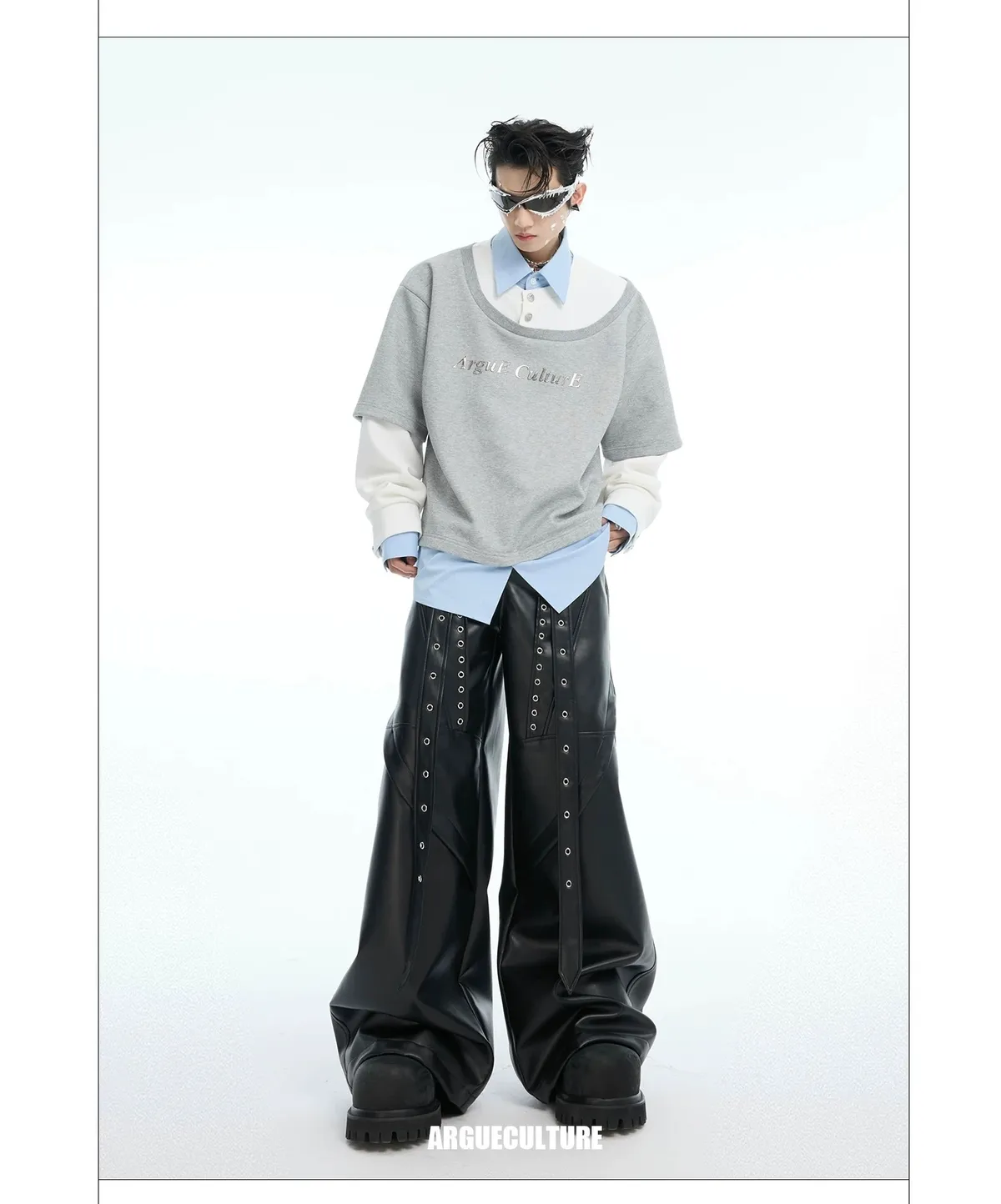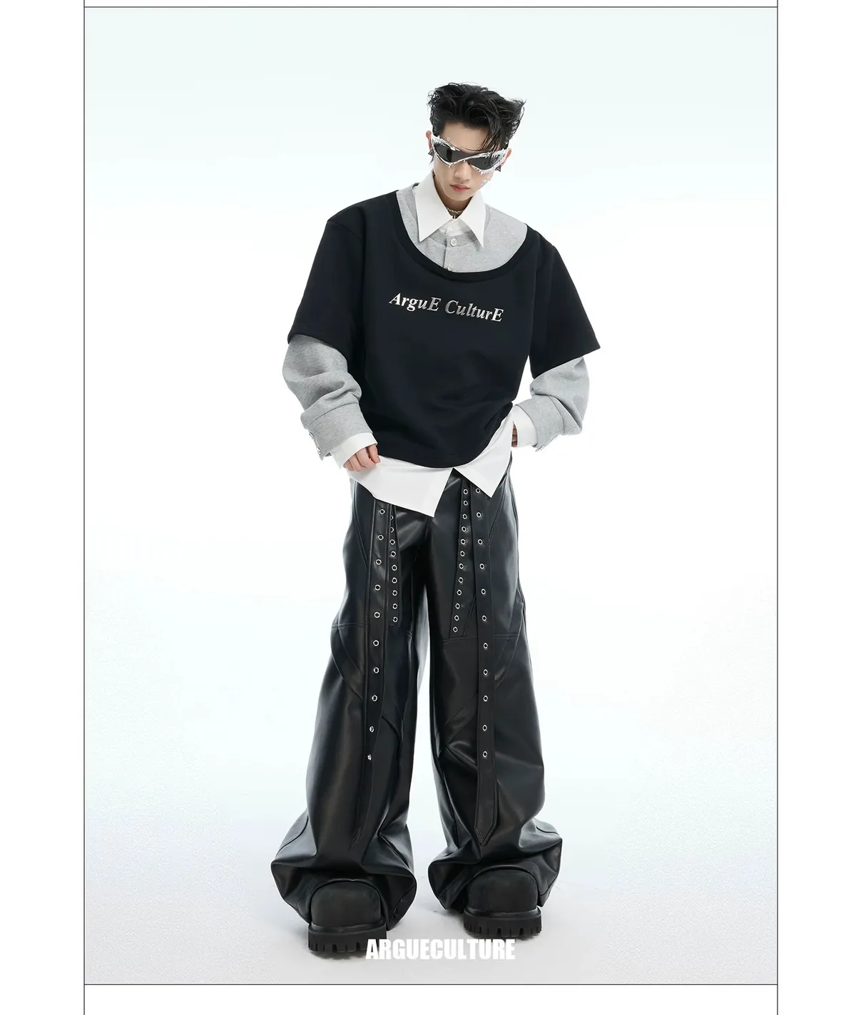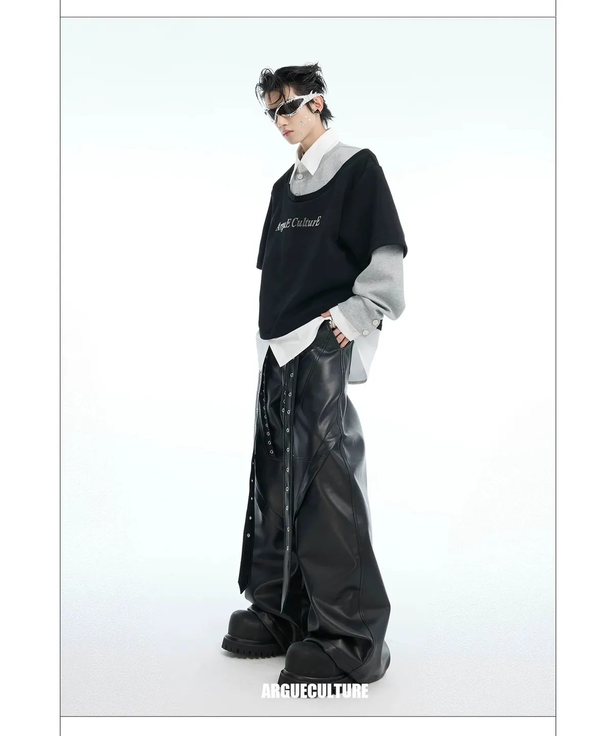ARGUE 金屬拼接 飄帶 闊腿 皮褲 長褲(黑色)
