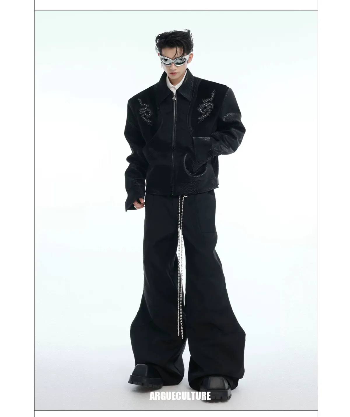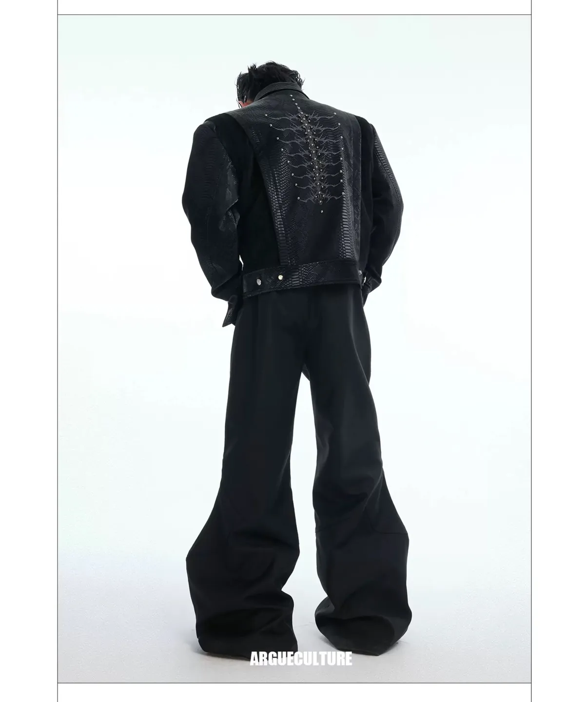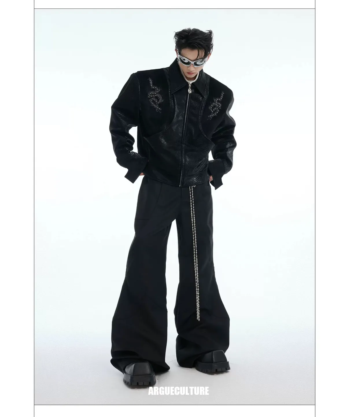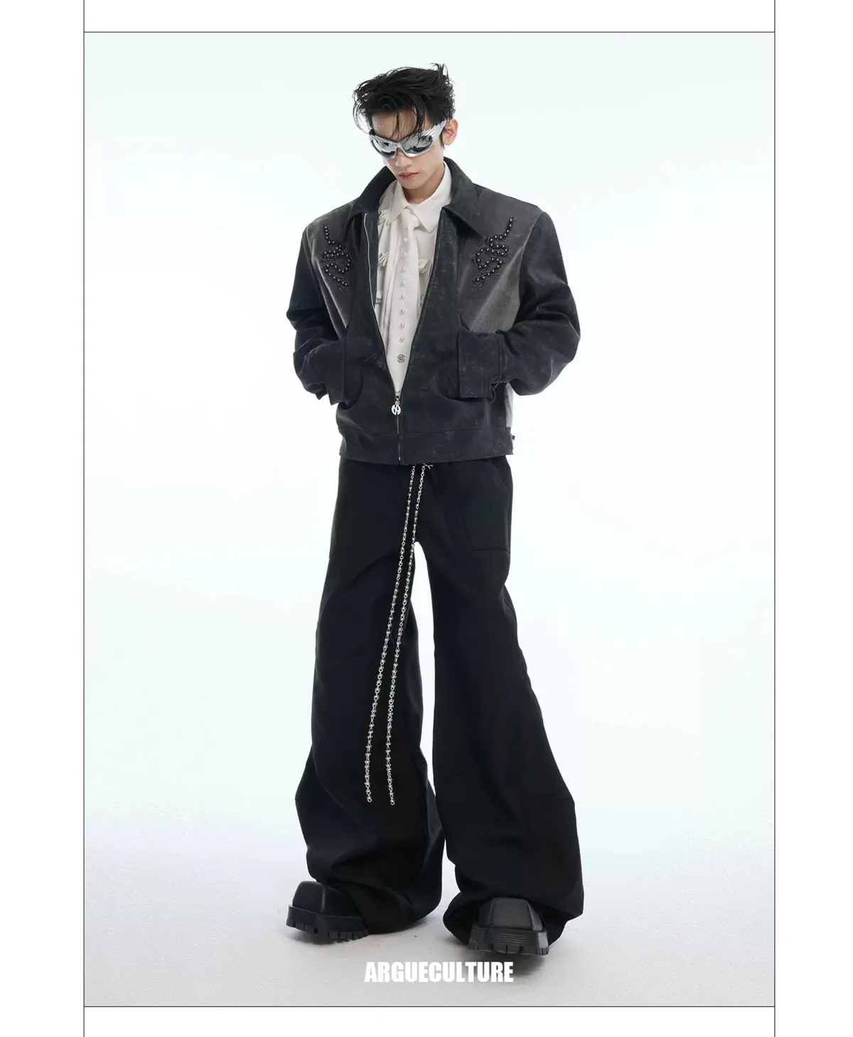 ARGUE 金屬拼接 飄帶 闊腿 皮褲 長褲(黑色)