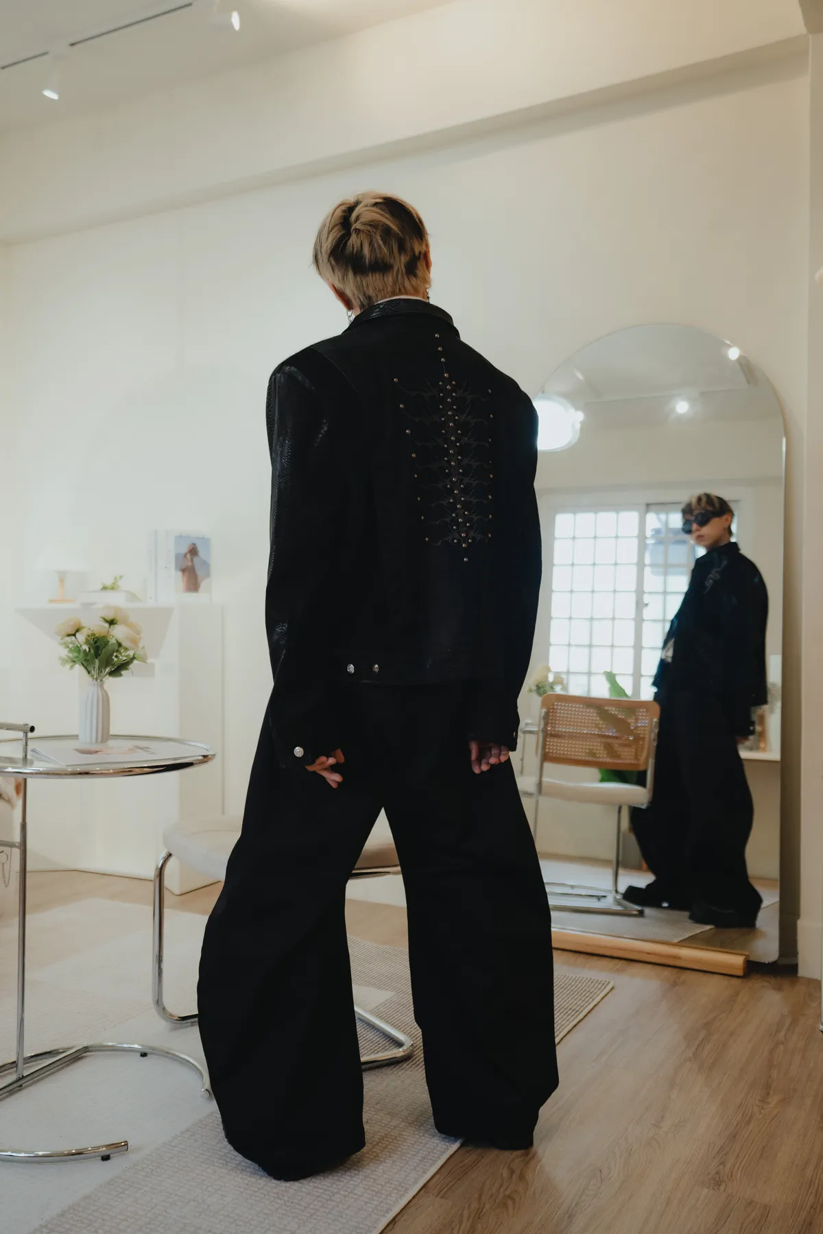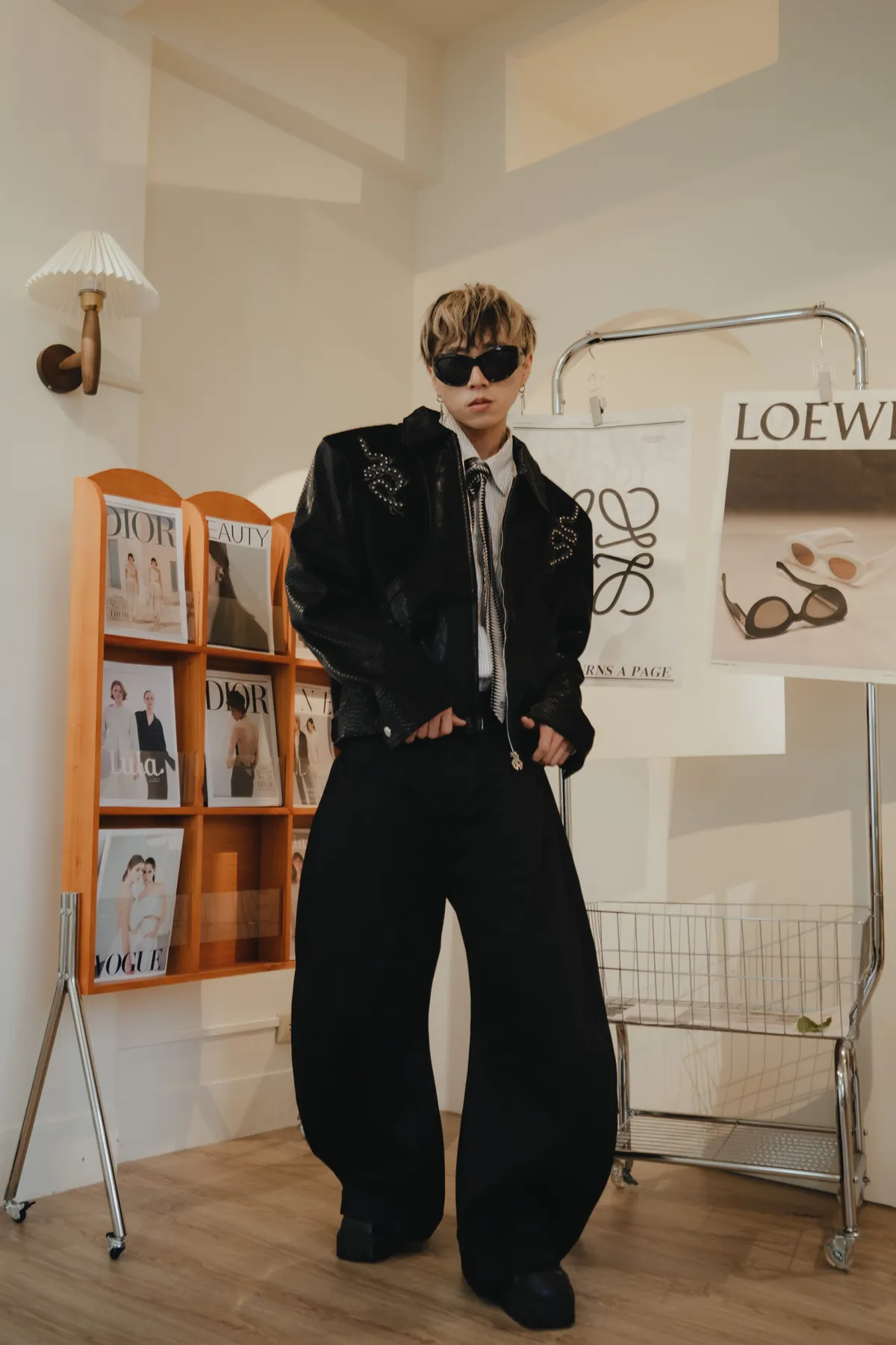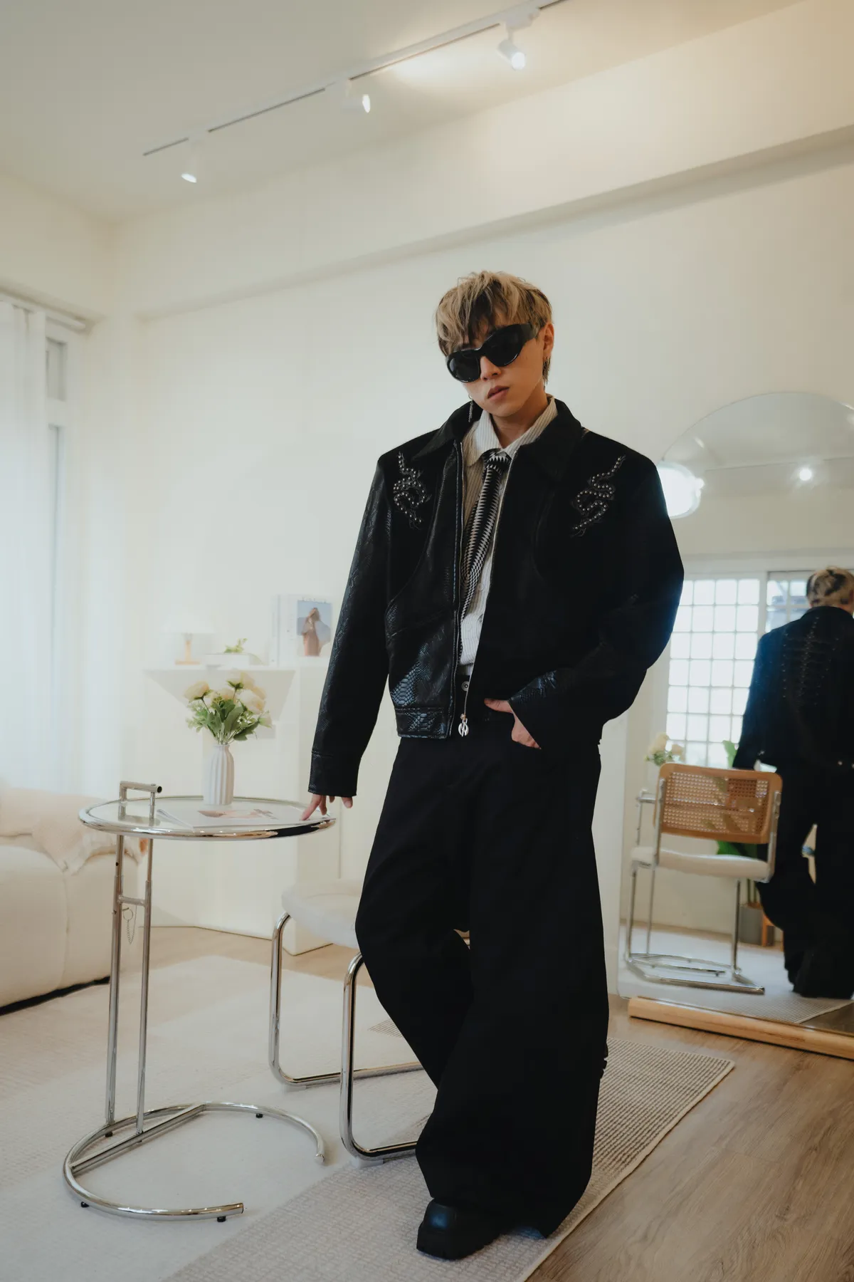 ARGUE 金屬拼接 飄帶 短版廓形 皮外套(黑色)