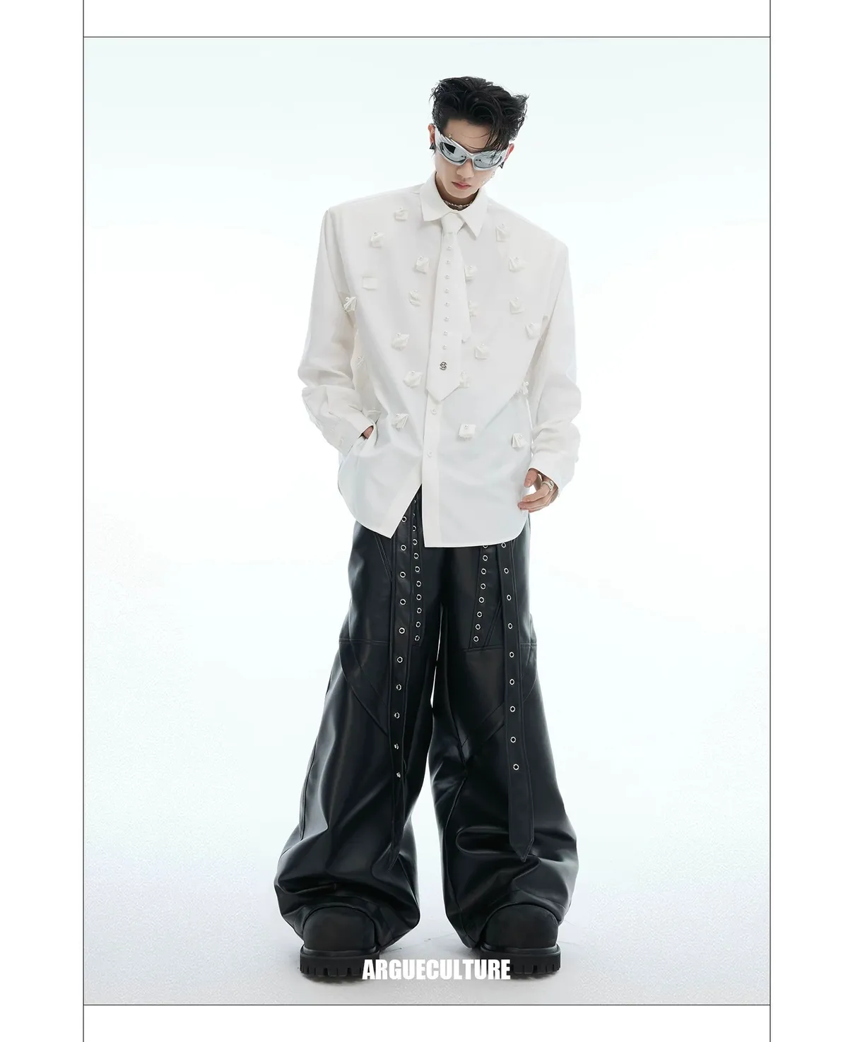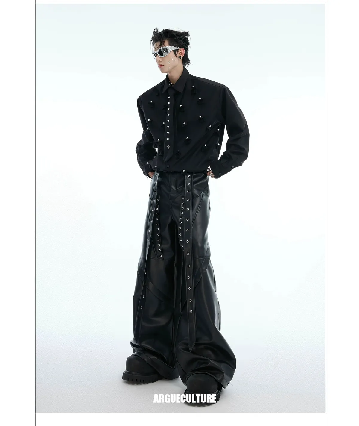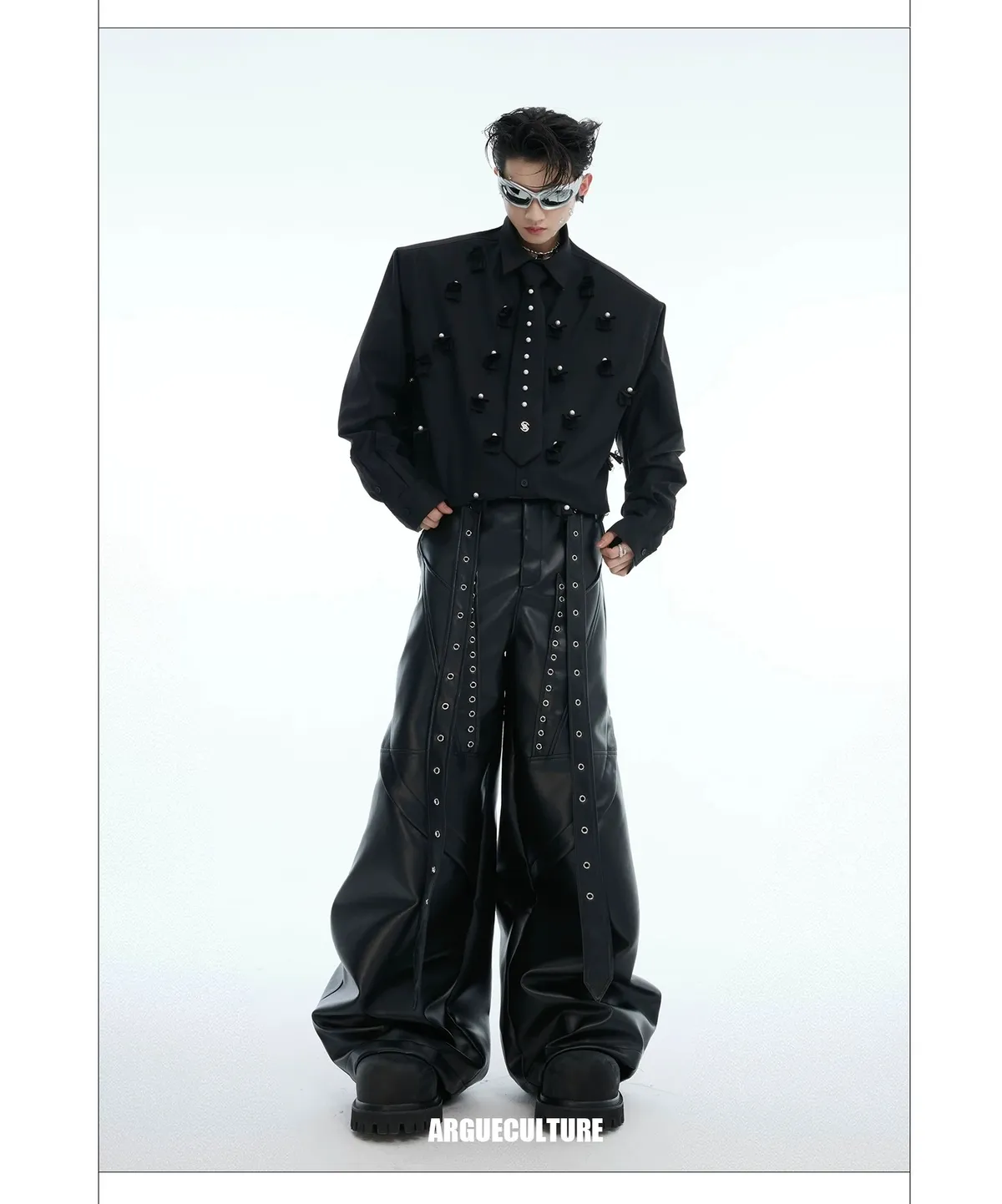 ARGUE 金屬拼接 飄帶 闊腿 皮褲 長褲(黑色)