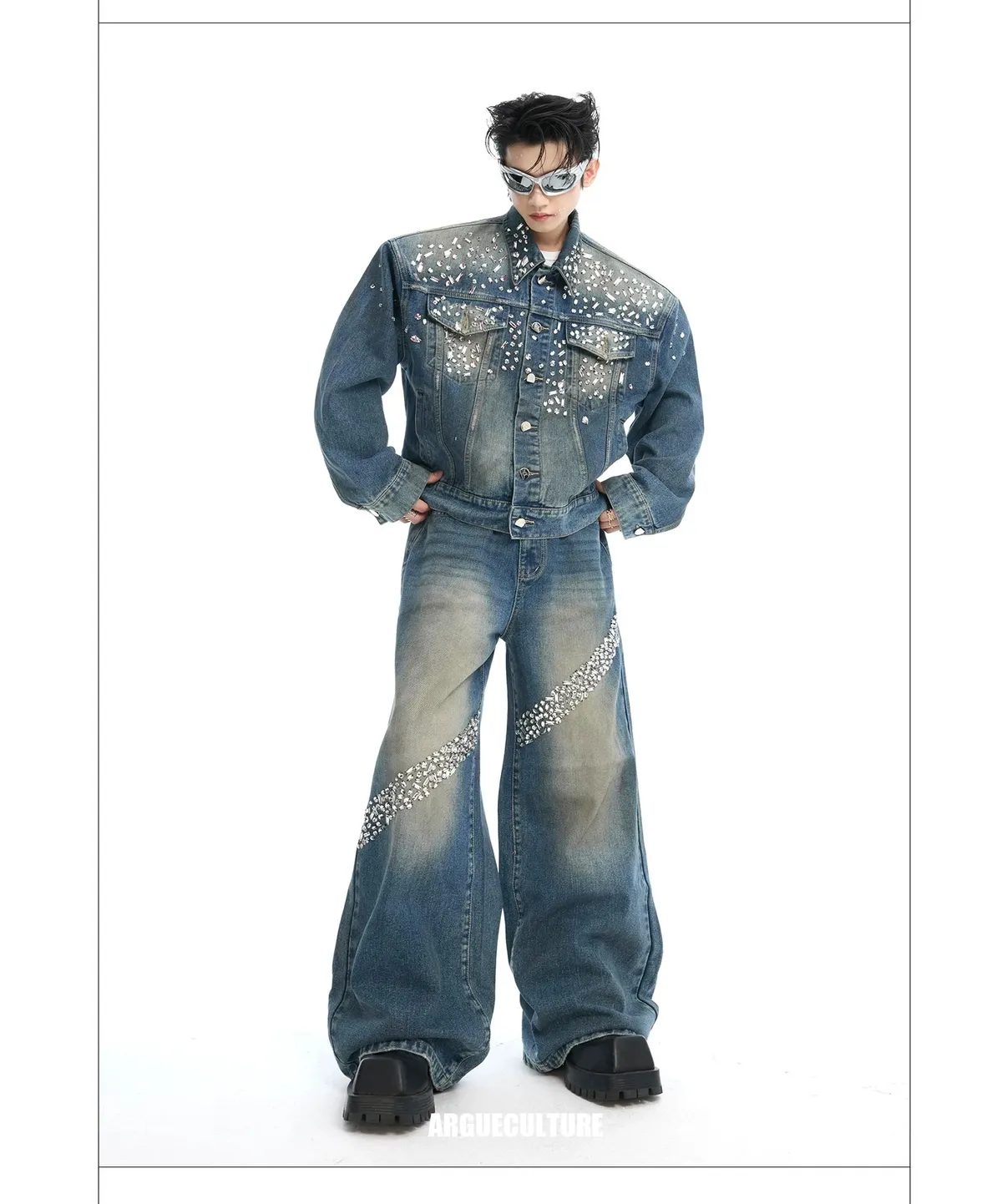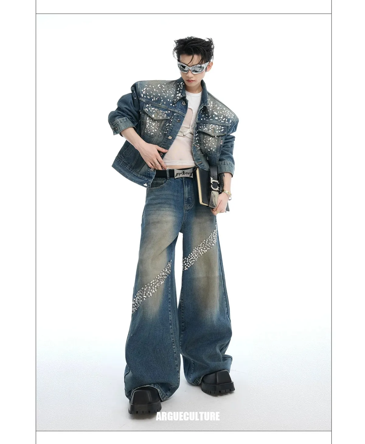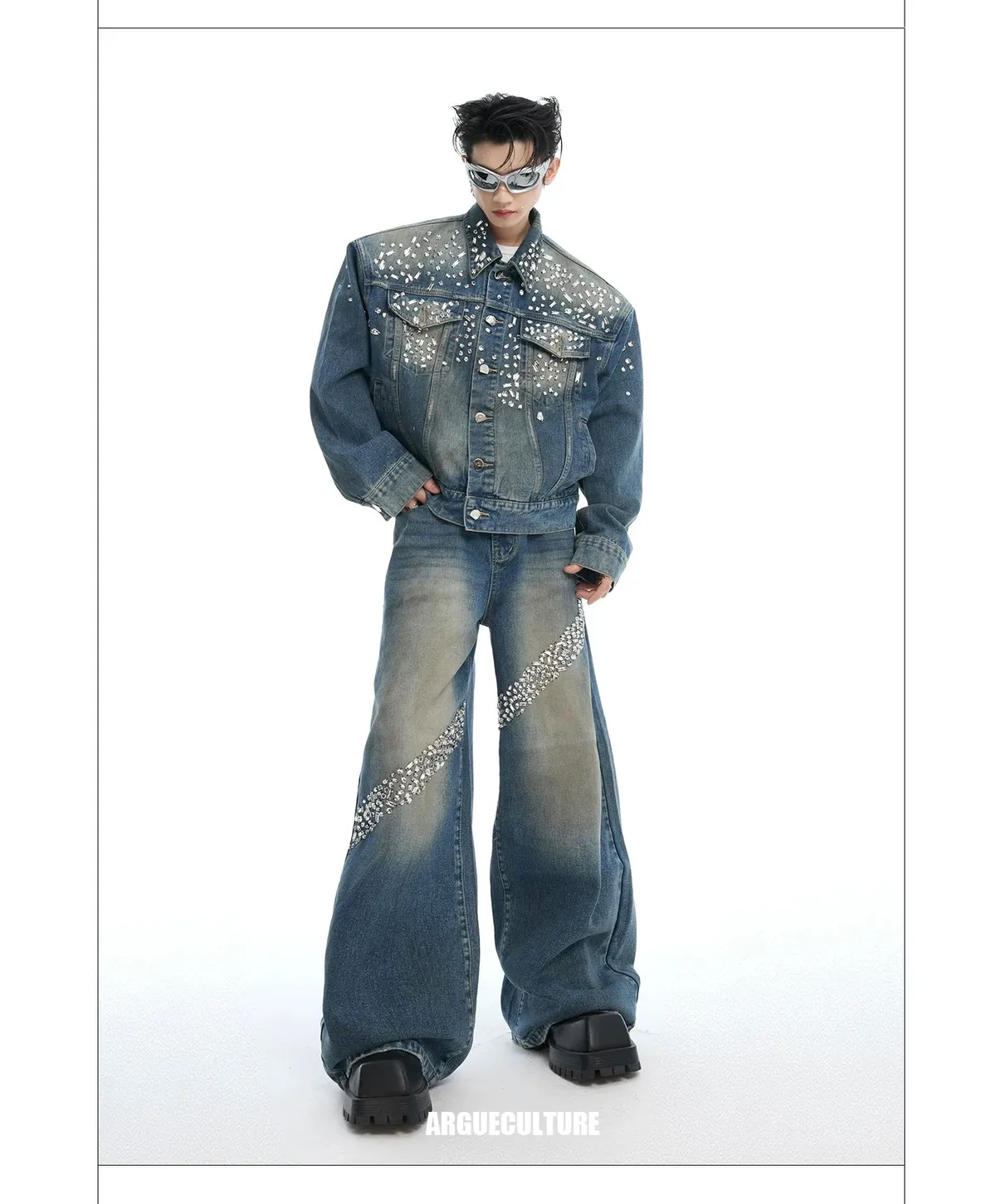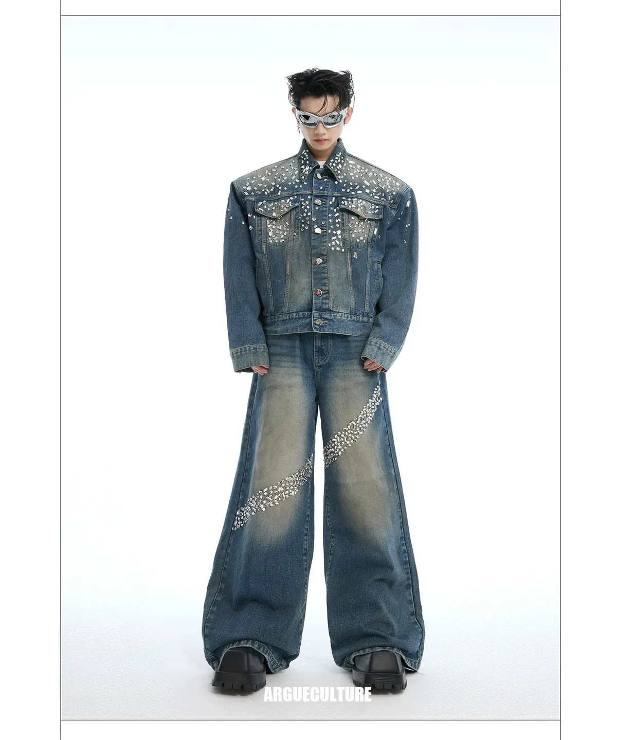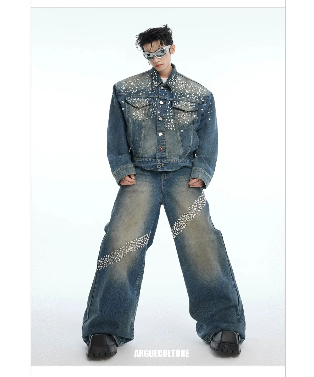ARGUE 鑲鑽 重工 牛仔外套 牛仔褲 闊腿褲 套裝(水洗藍)
