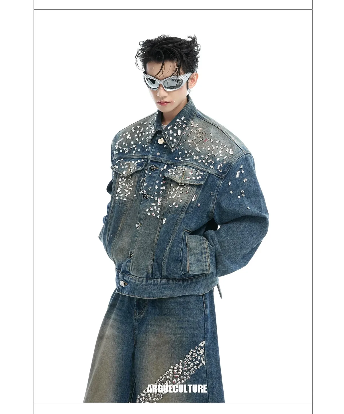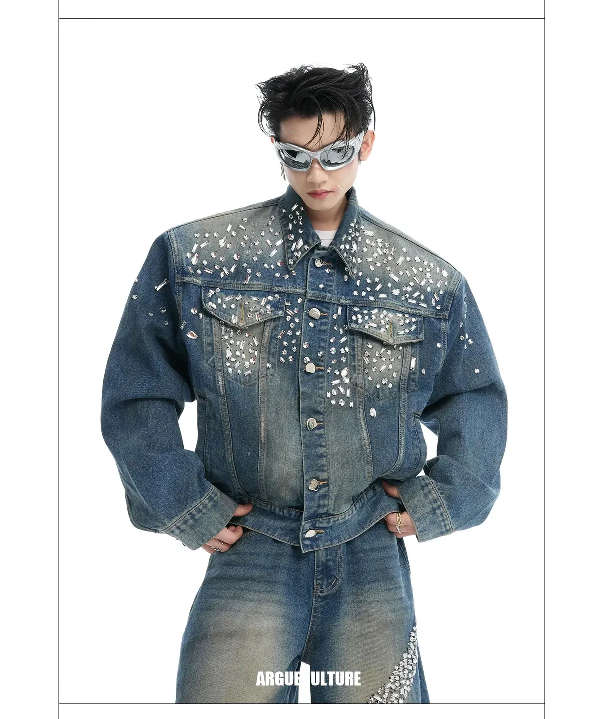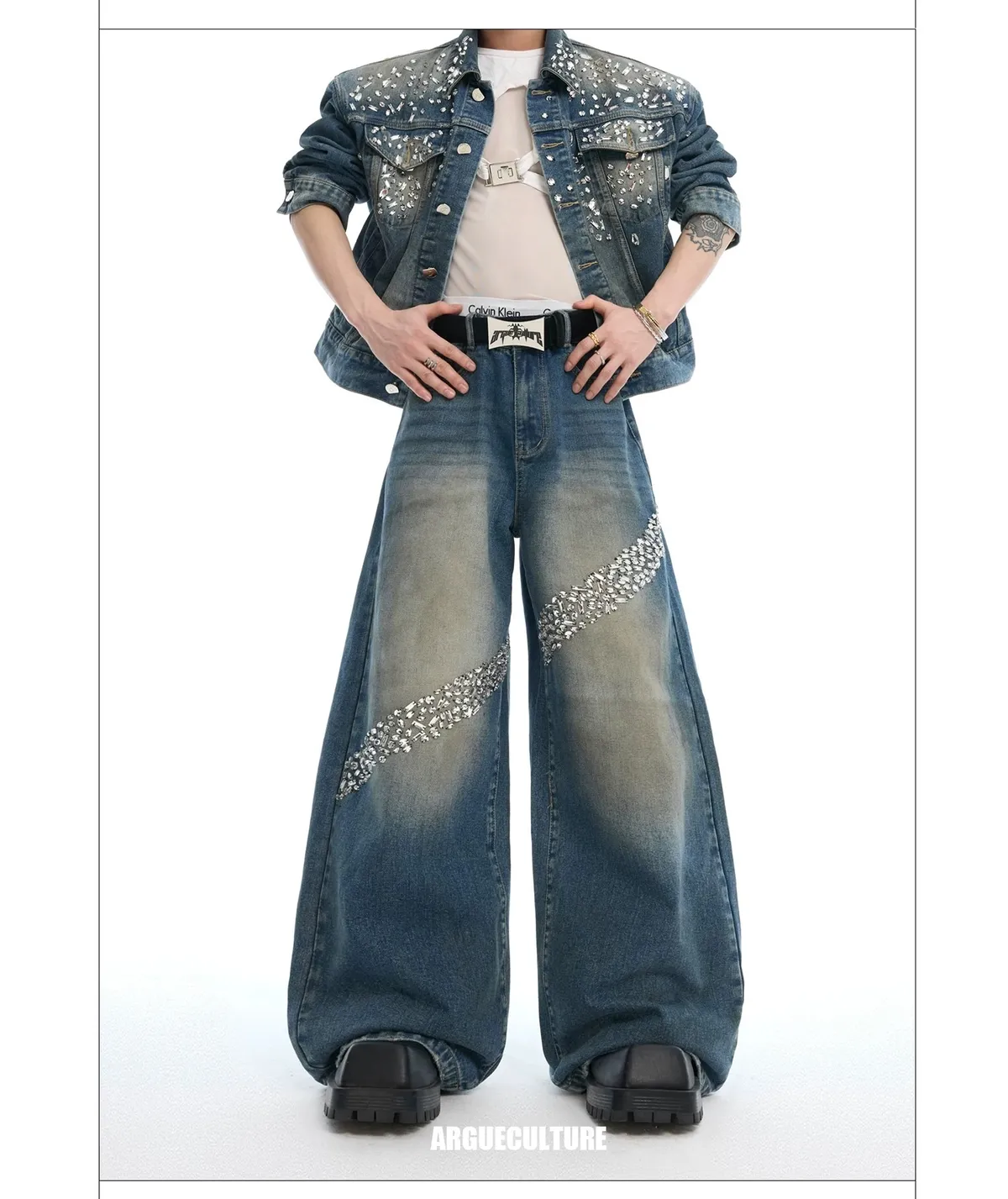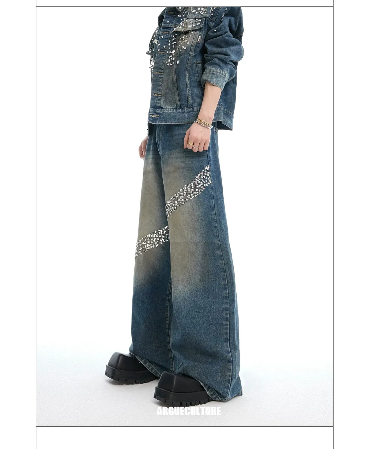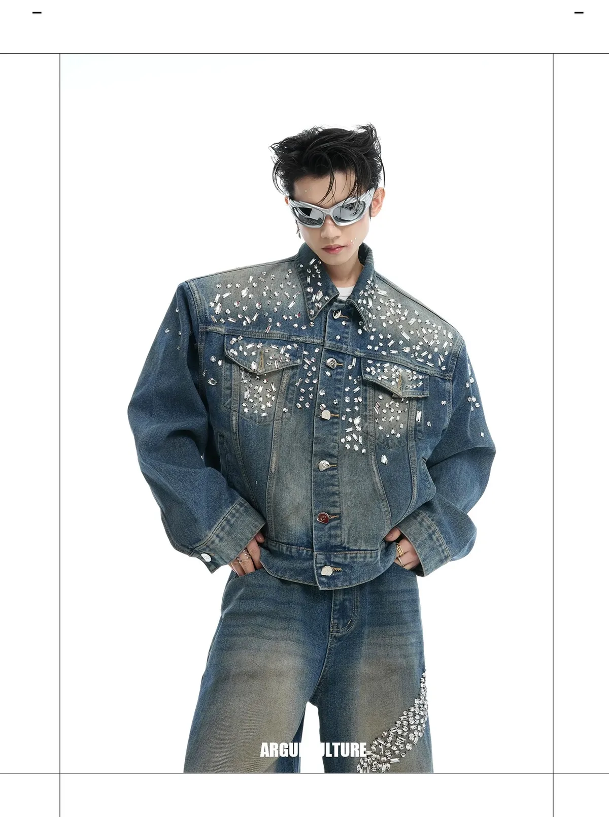 ARGUE 鑲鑽 重工 牛仔外套 牛仔褲 闊腿褲 套裝(水洗藍)