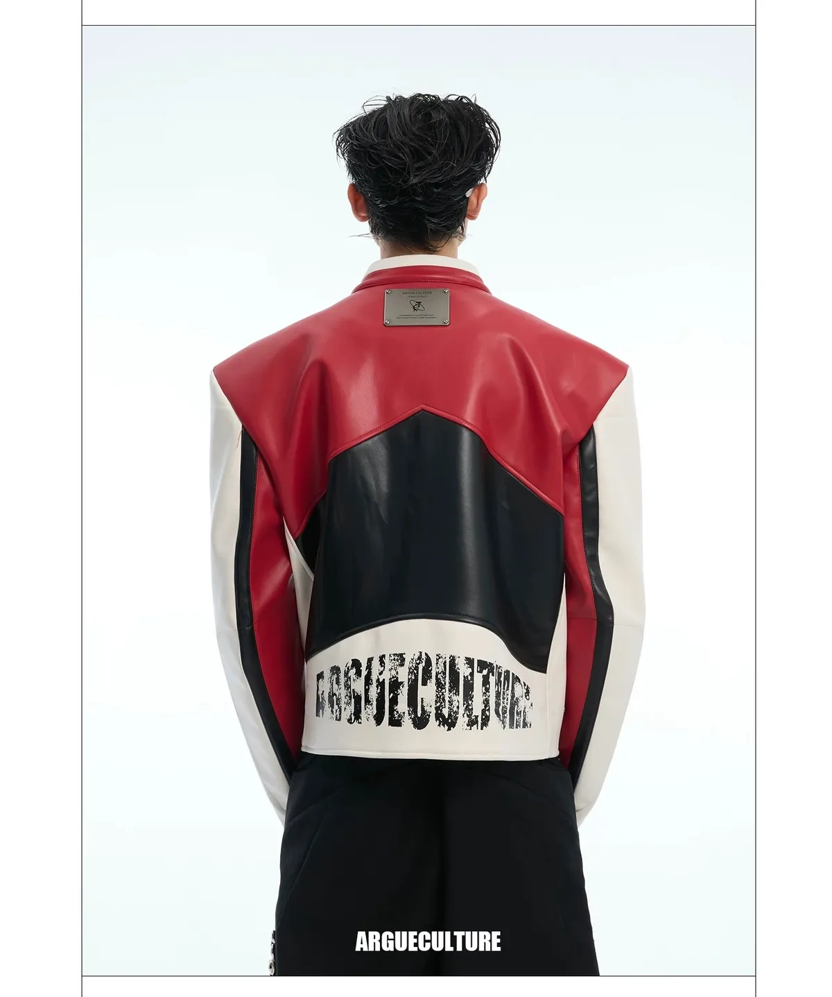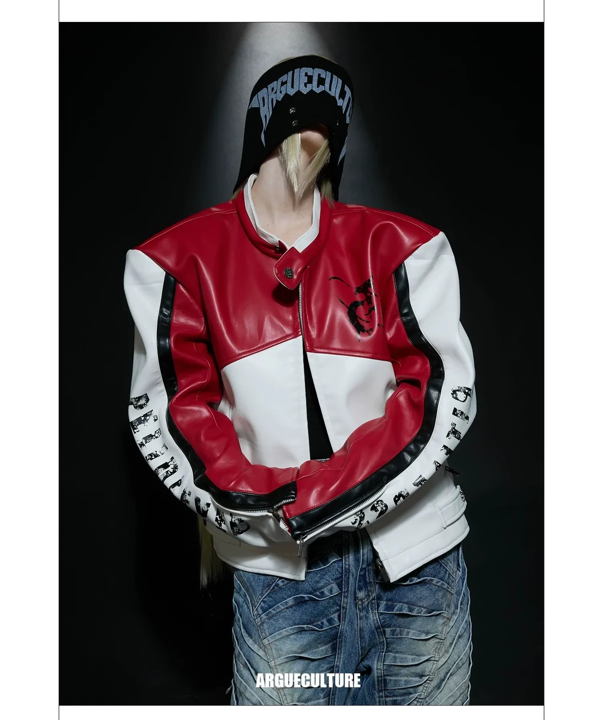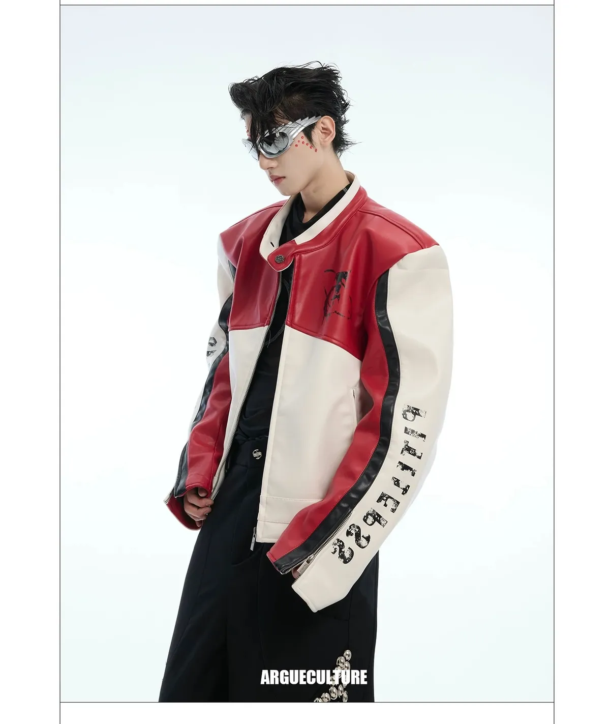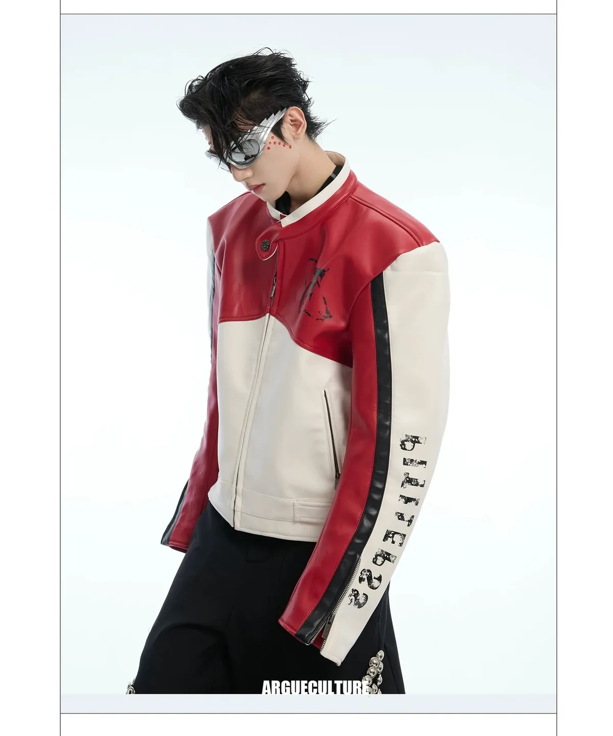 ARGUE 立領撞色 賽車外套 做舊 皮外套(紅色)