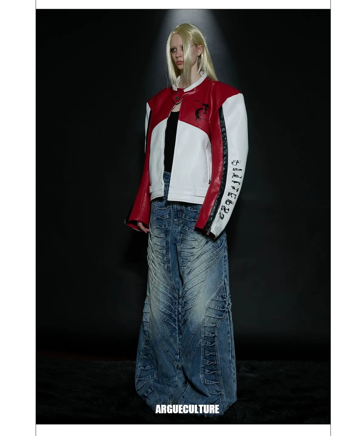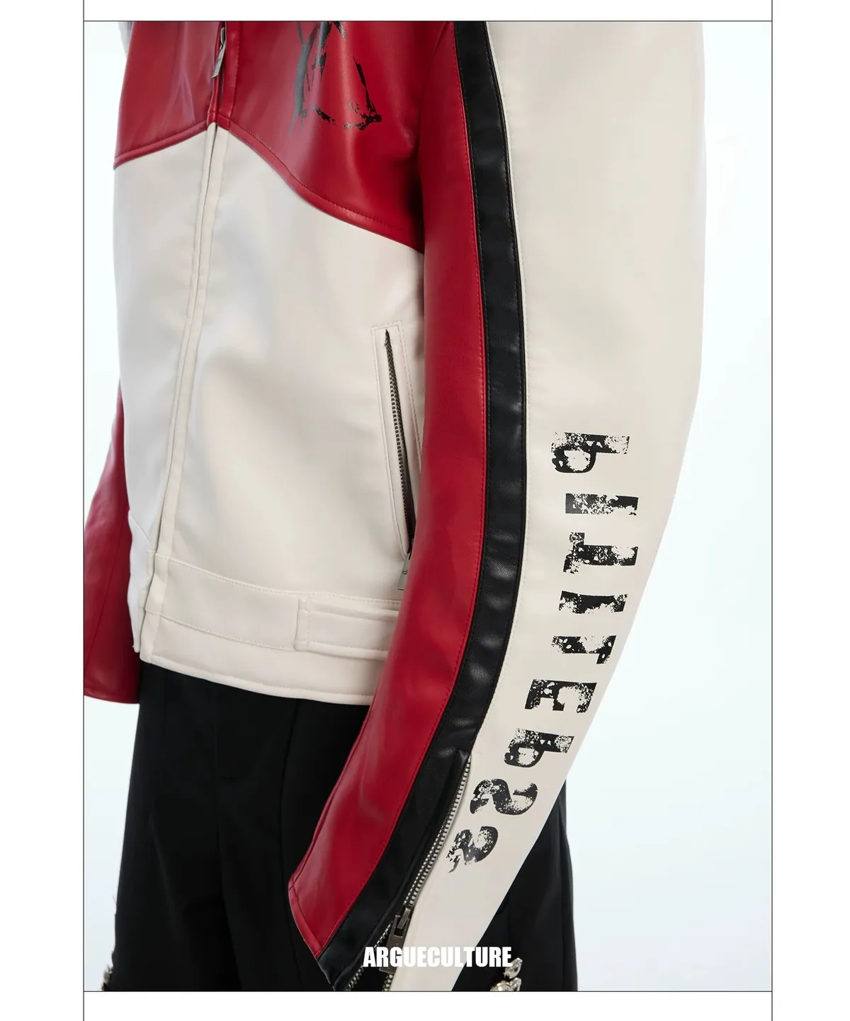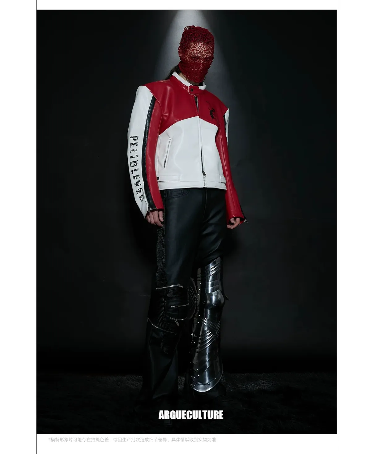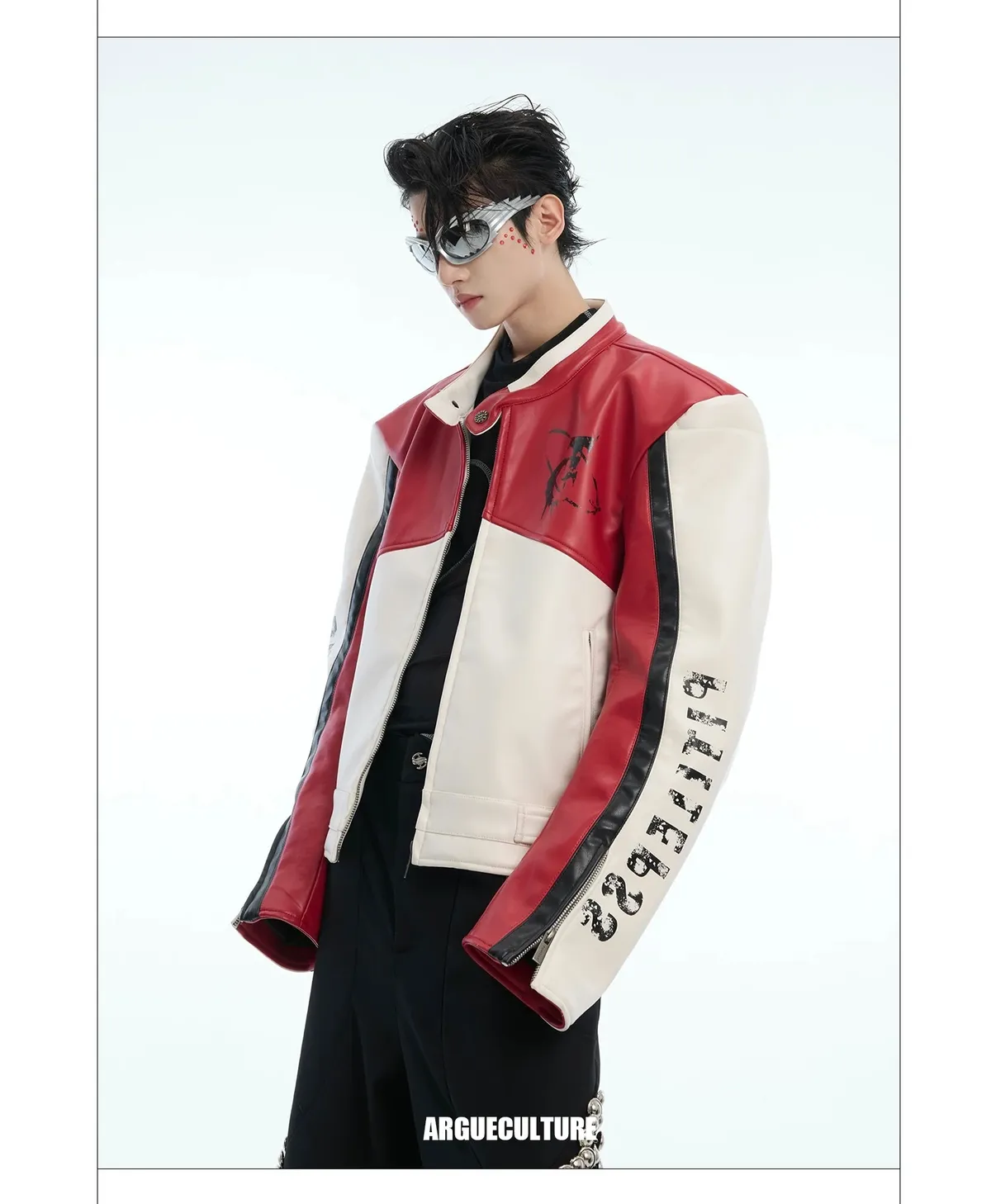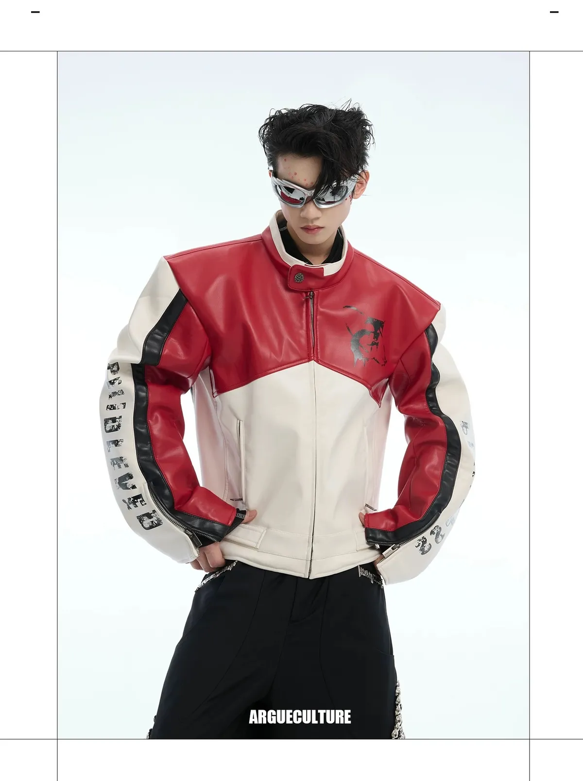 ARGUE 立領撞色 賽車外套 做舊 皮外套(紅色)