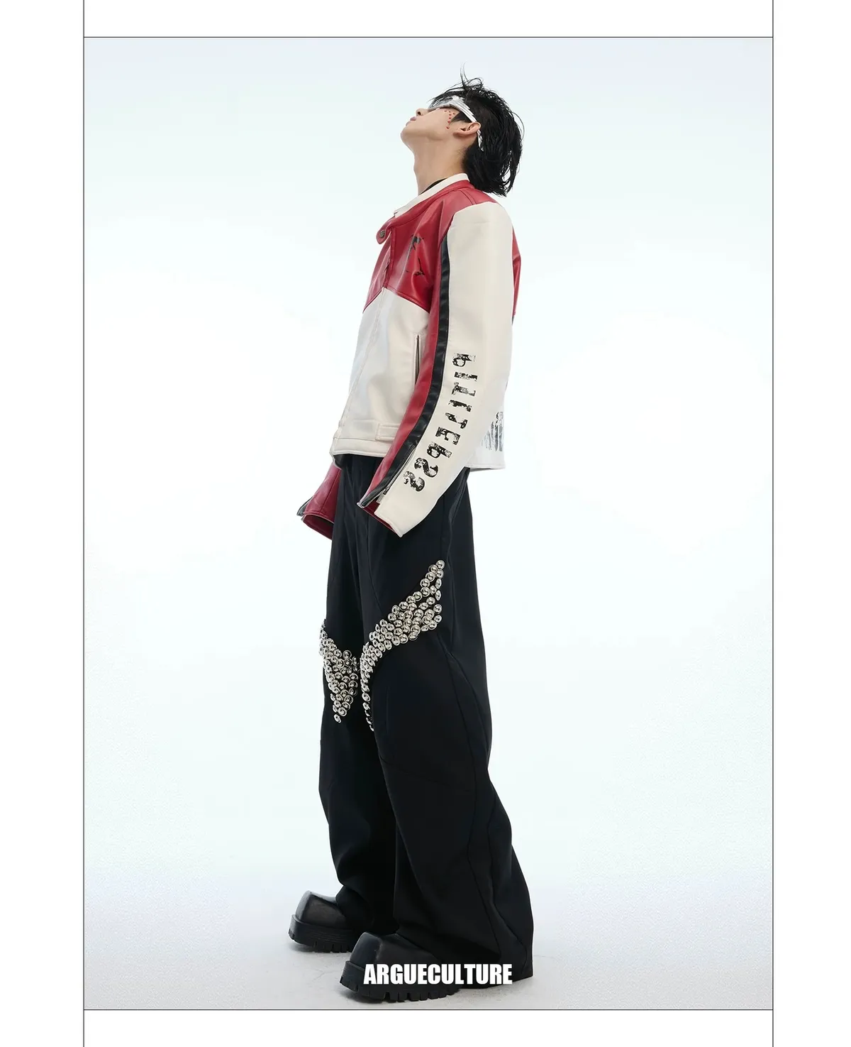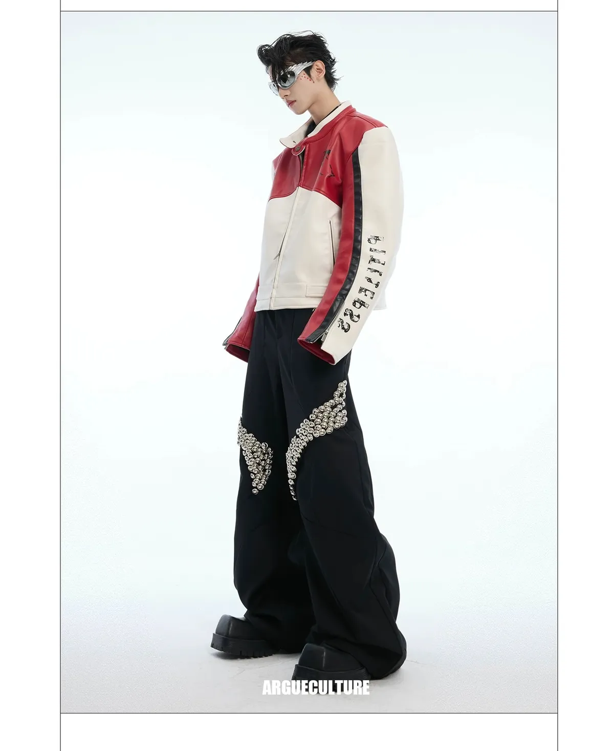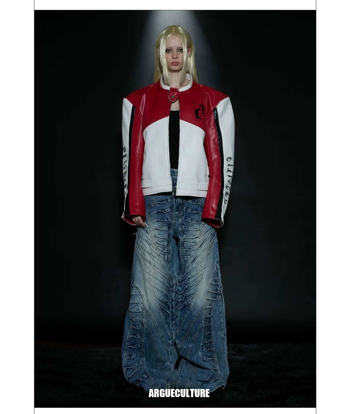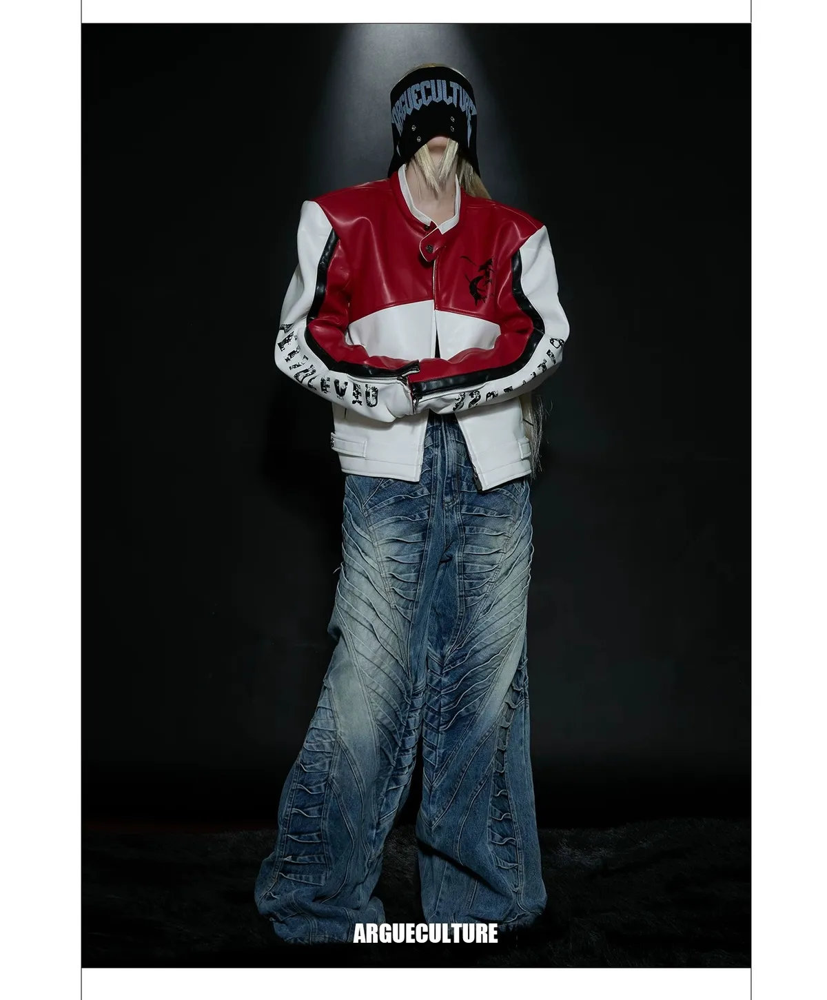 ARGUE 立領撞色 賽車外套 做舊 皮外套(紅色)