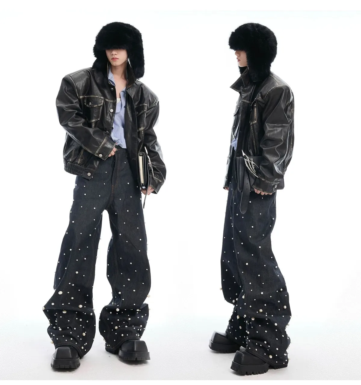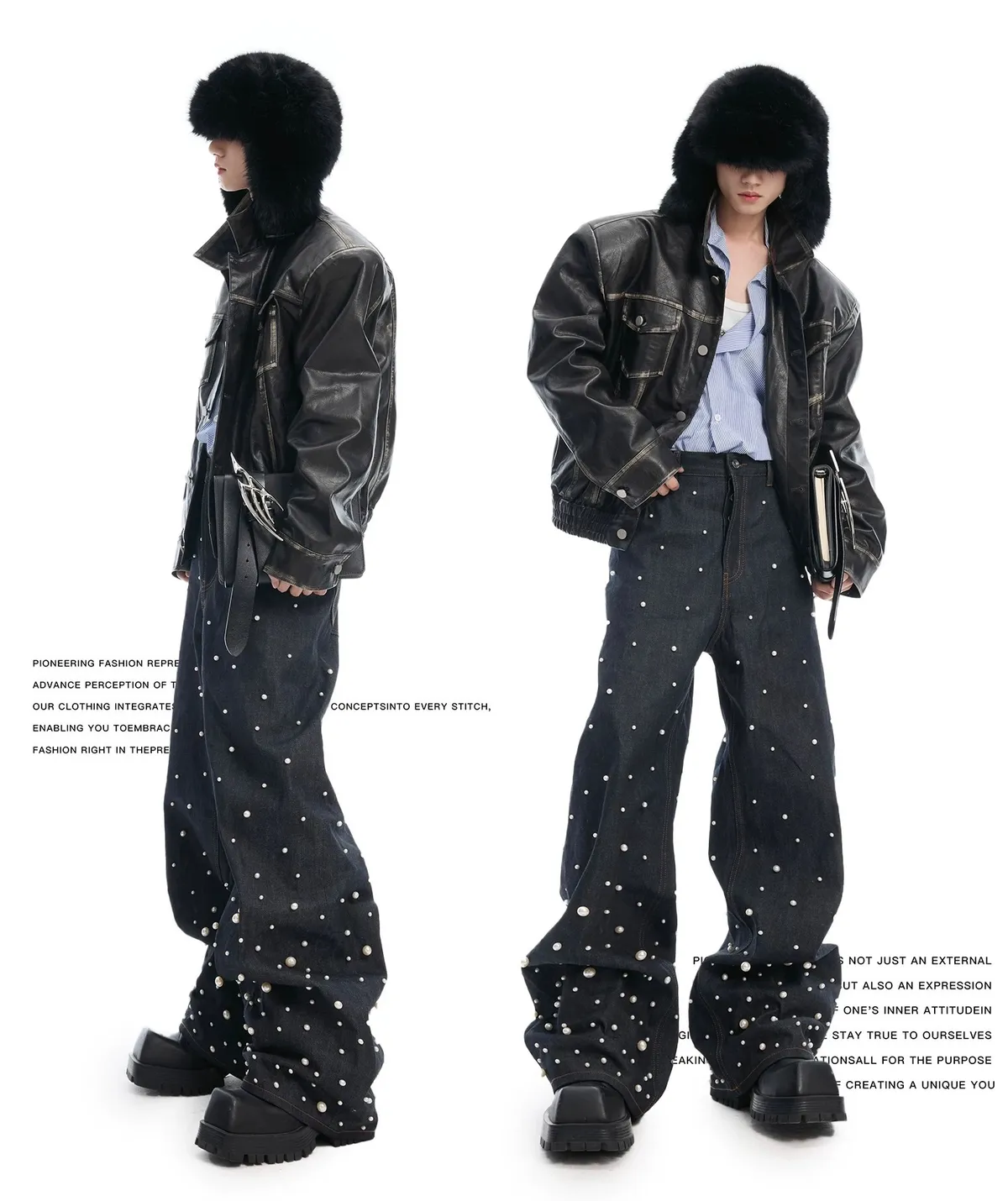 ARGUE 原漿丹寧 復古 褶皺 闊腿 牛仔褲(深藍)