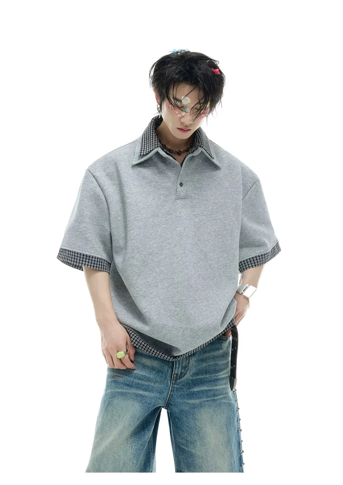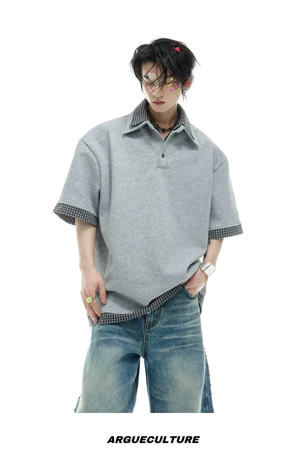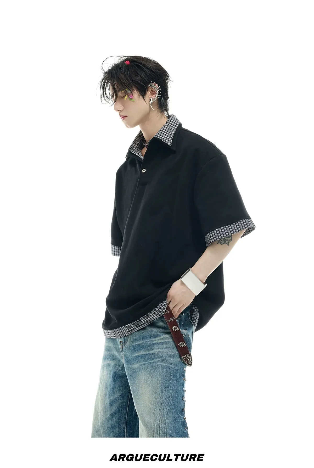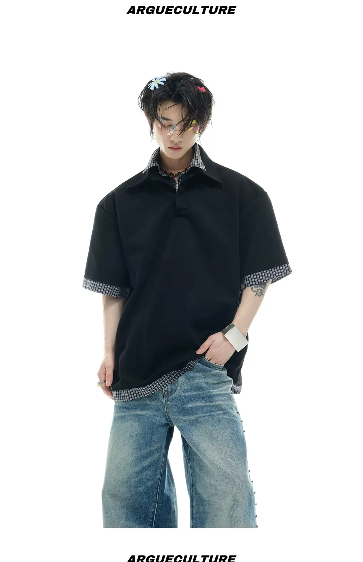 ARGUE 復古假兩件 格紋 POLO 短袖(黑/灰)