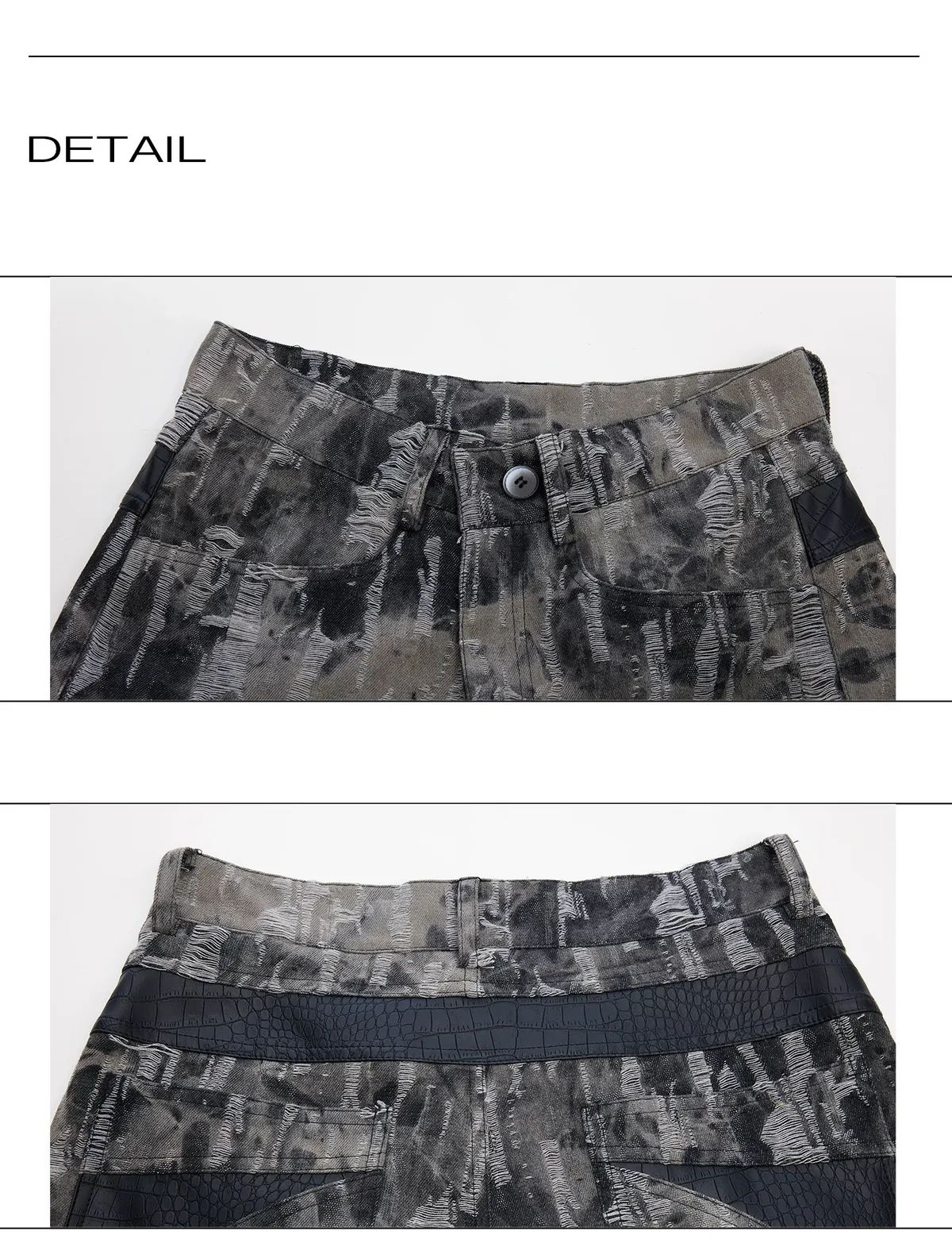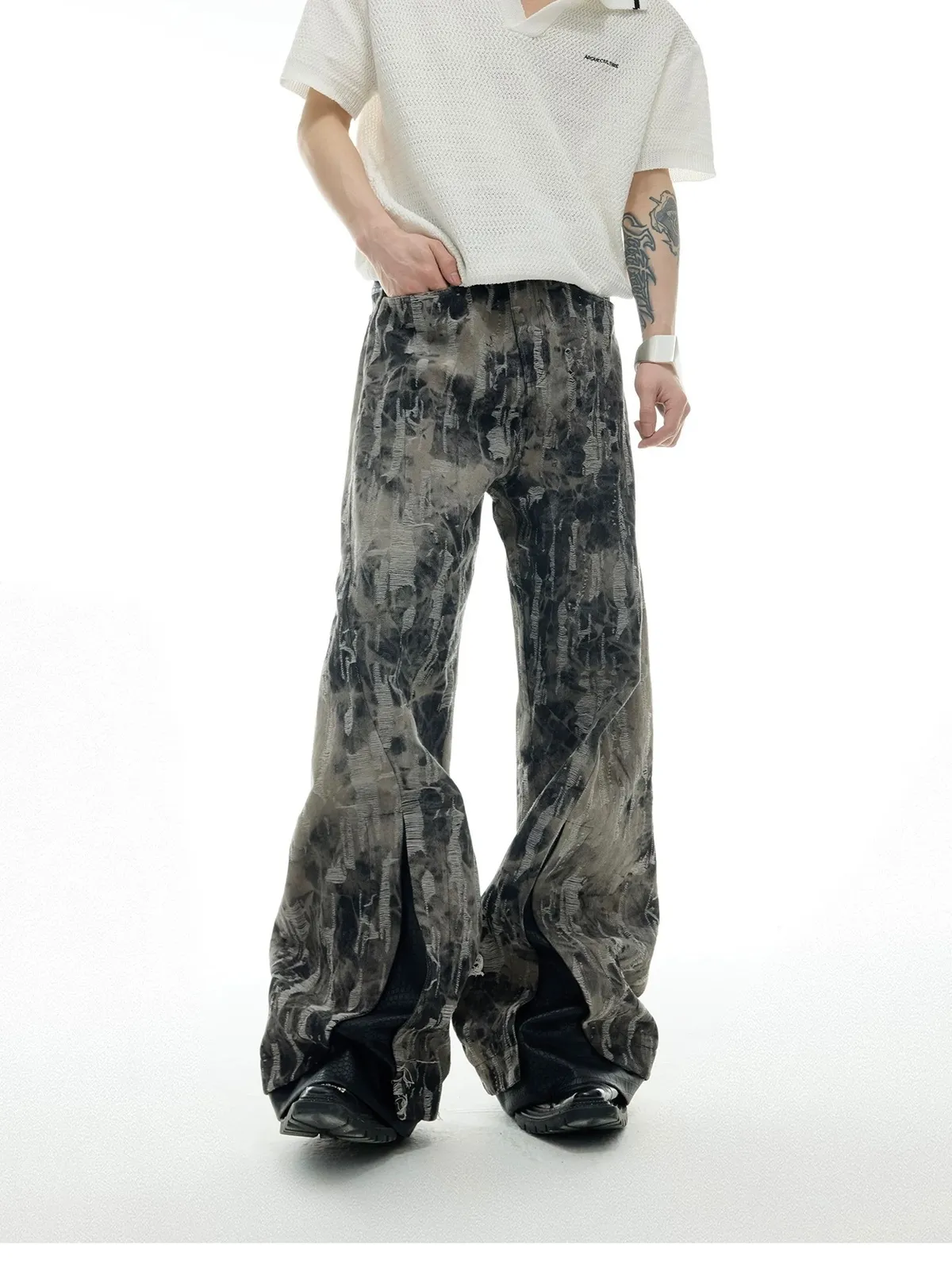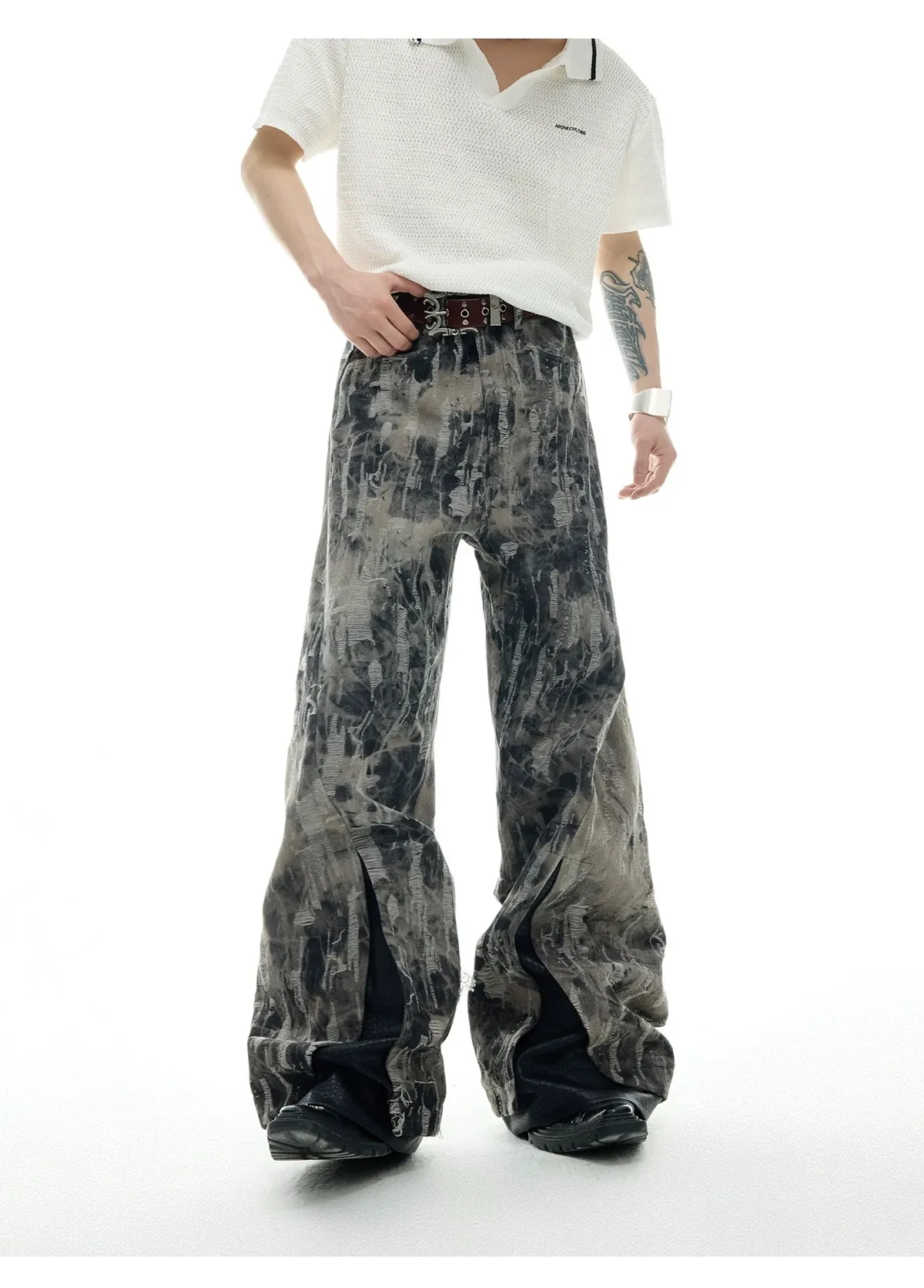 ARGUE 復古潑墨 微喇叭 皮革拼接 牛仔褲(黑色)