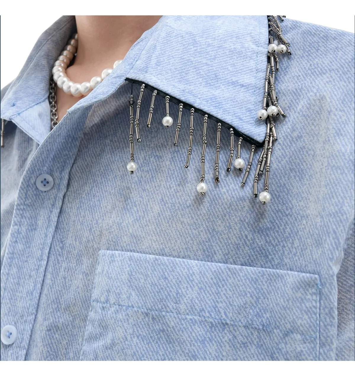 AUROCEAN 學院少年 寬肩廓形 做舊 襯衫(奶藍色)